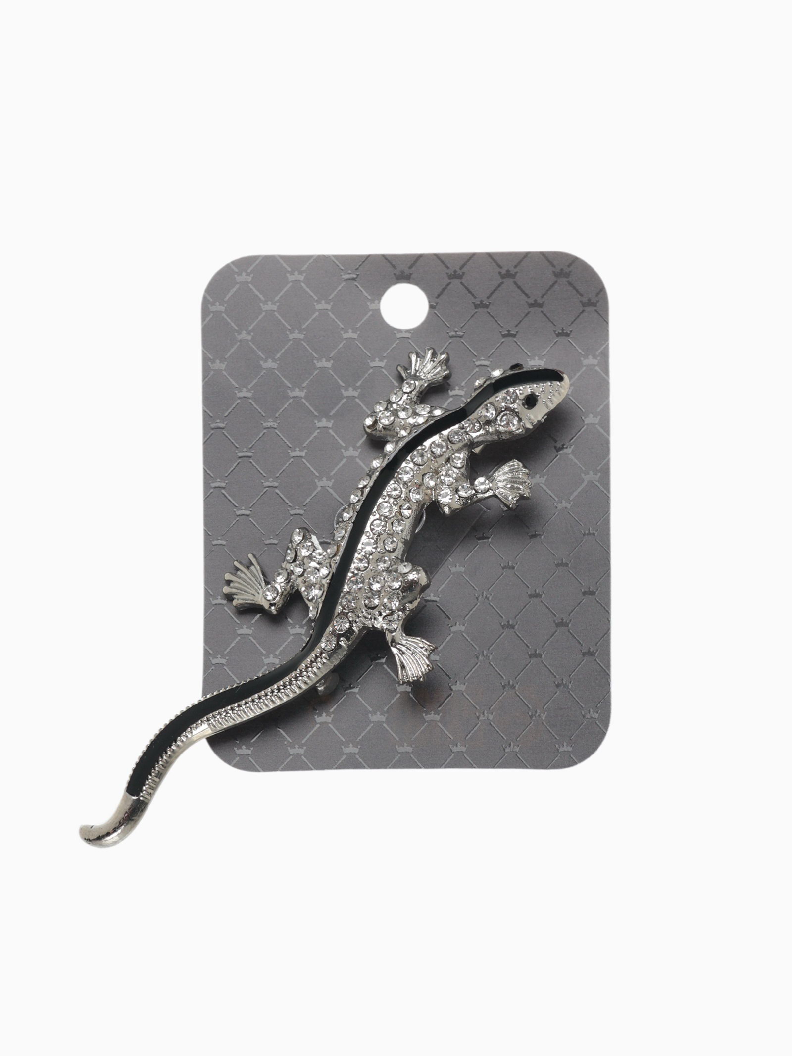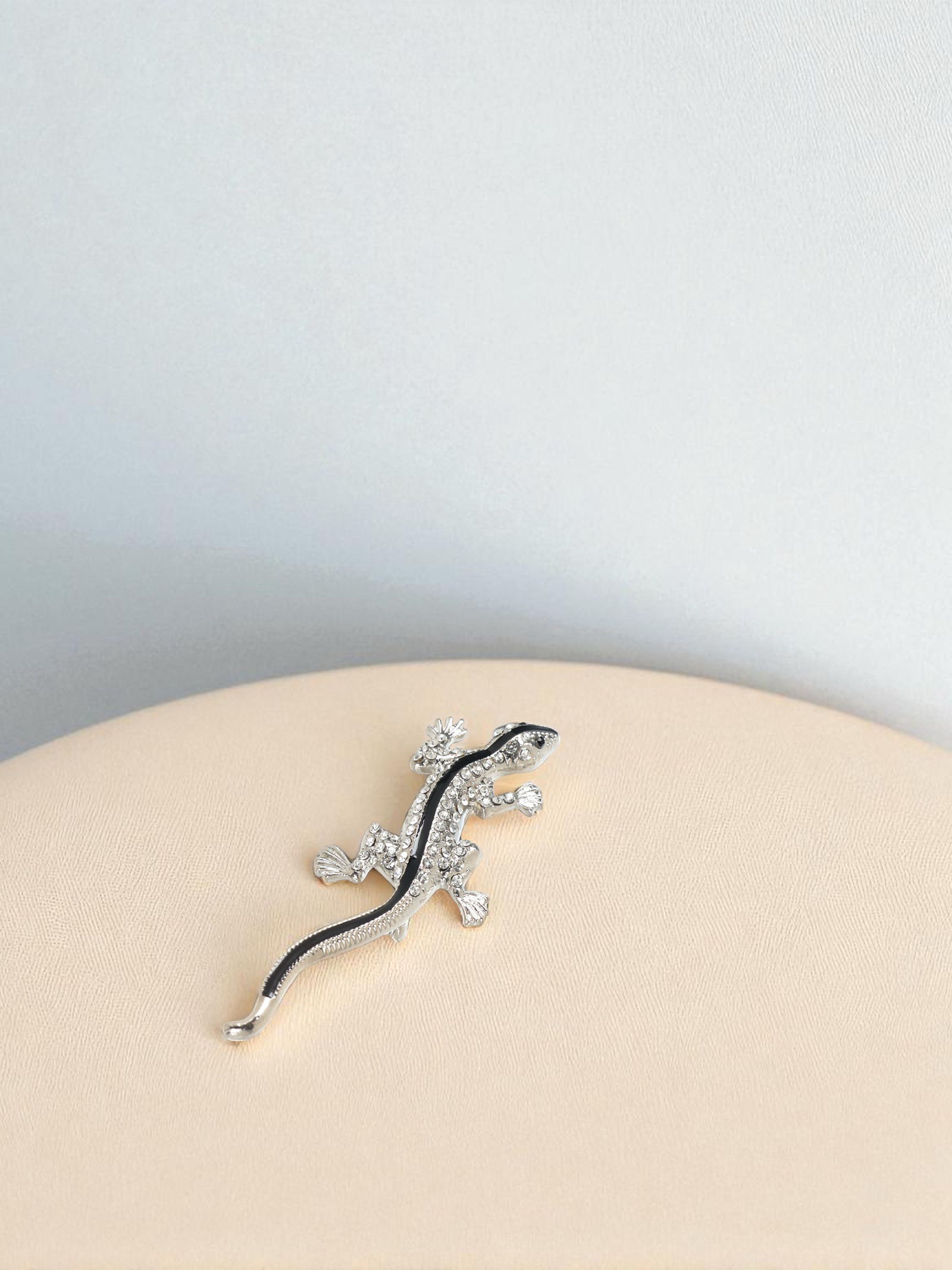 Брошь "Ящерка бриллиантовая", цвет чёрно-белый в серебре, 3.5x9x0.8 см., QF, Китай