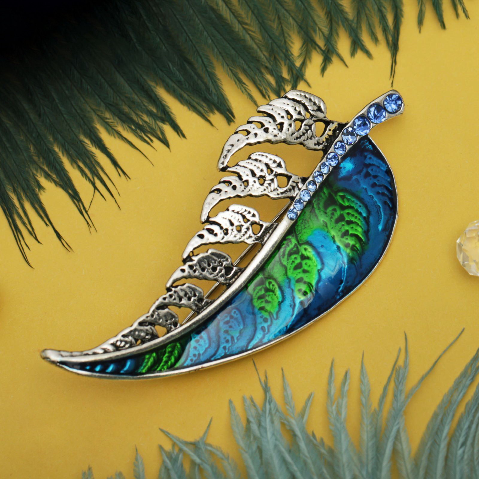 Брошь "Листок желаний", цвет сине-зелёный в серебре, 3x7x1 см., QF, Китай