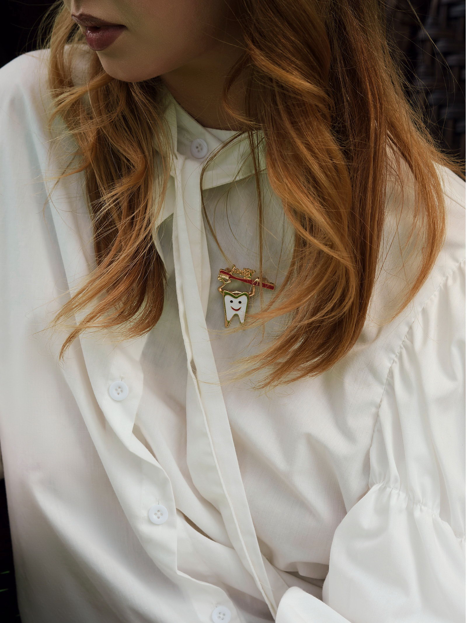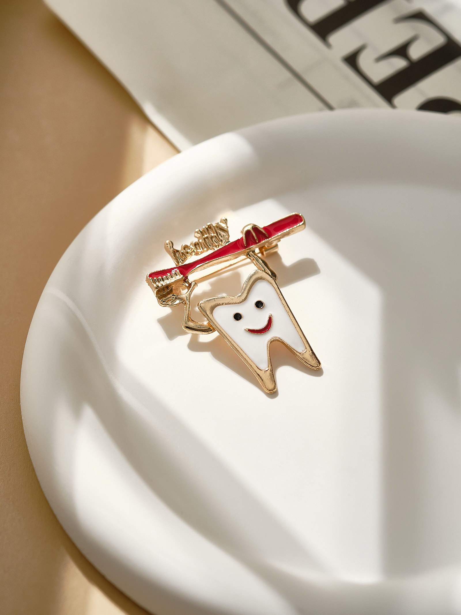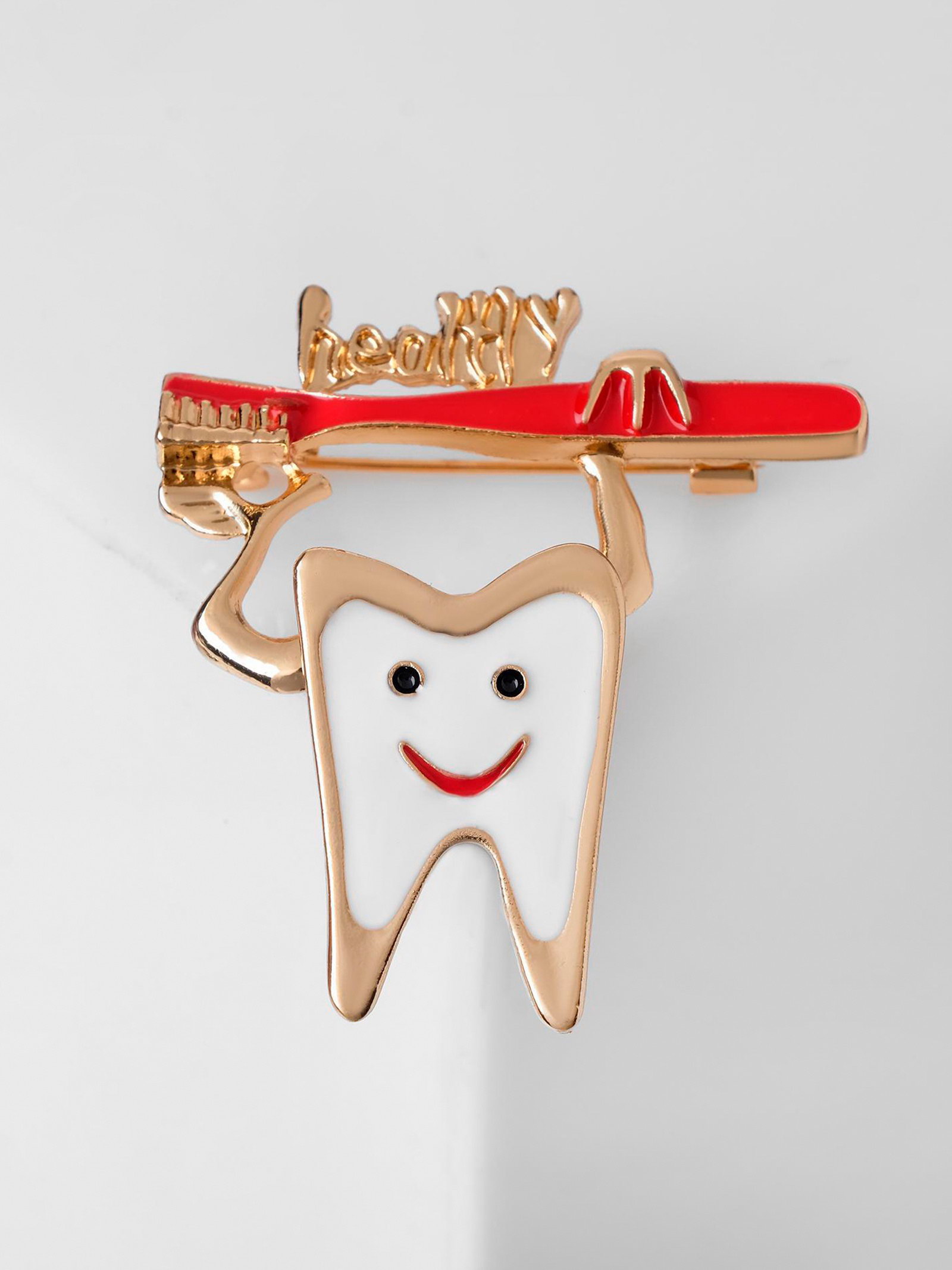 Брошь "Зуб" со щёткой, цвет красно-белый в золоте, 4x4.5x1.5 см., QF, Китай