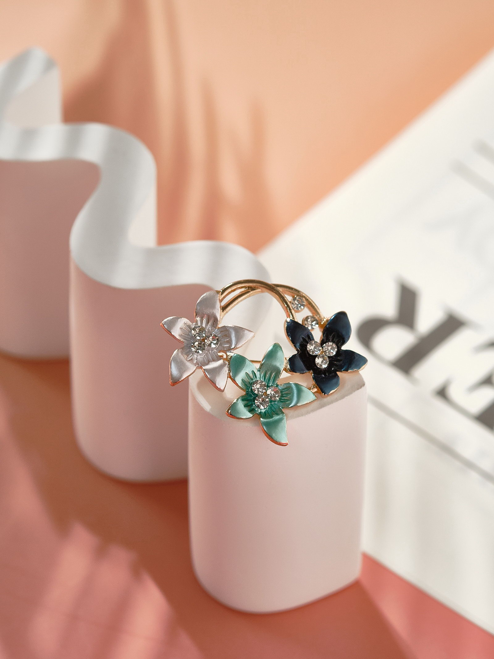 Брошь "Цветы" трио, цвет бело-сине-голубой в золоте, 3x4x1.5 см., QF, Китай