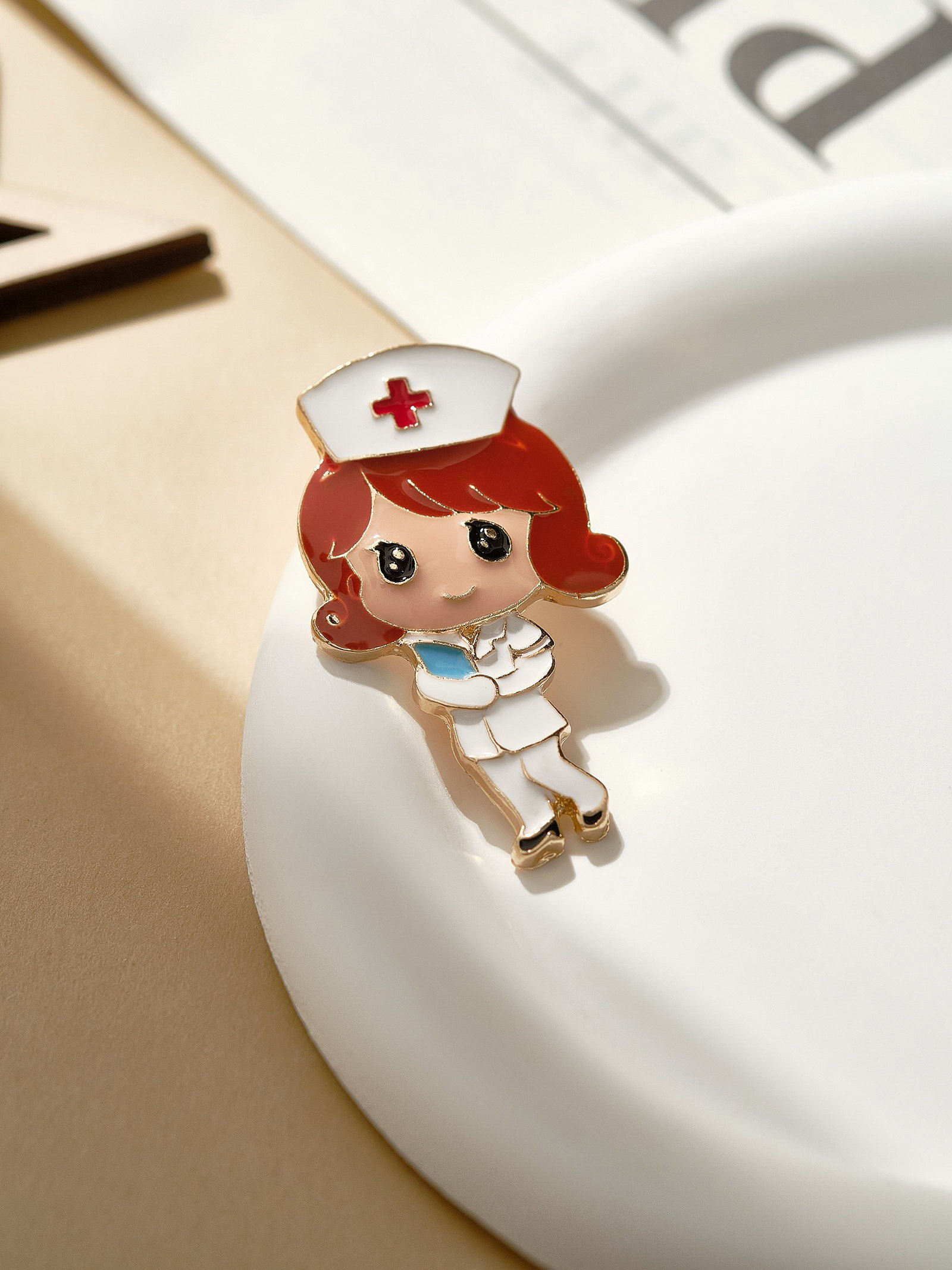 Брошь "Медсестричка" с журналом, цветная в золоте, 3x5x1.5 см., QF, Китай