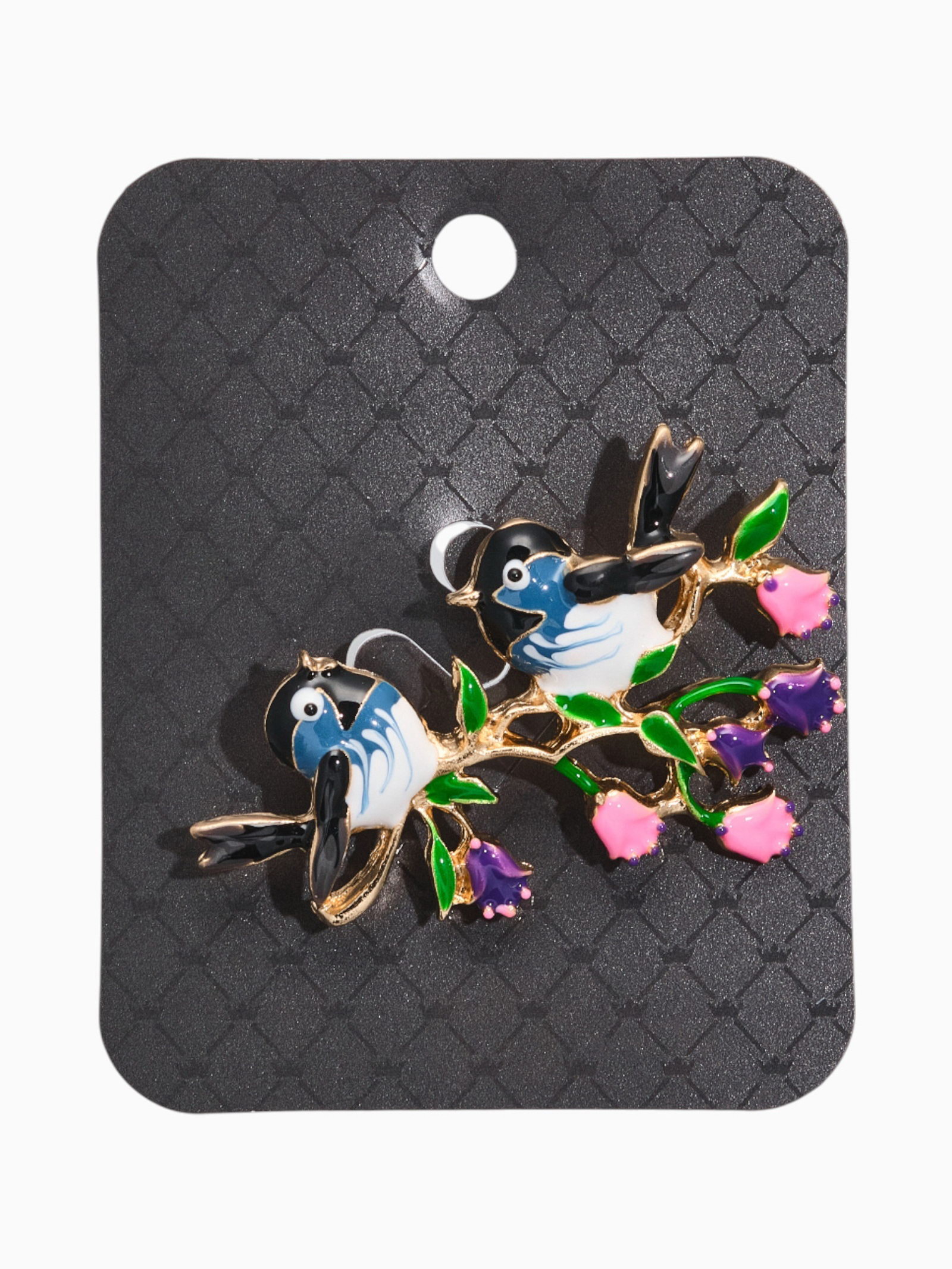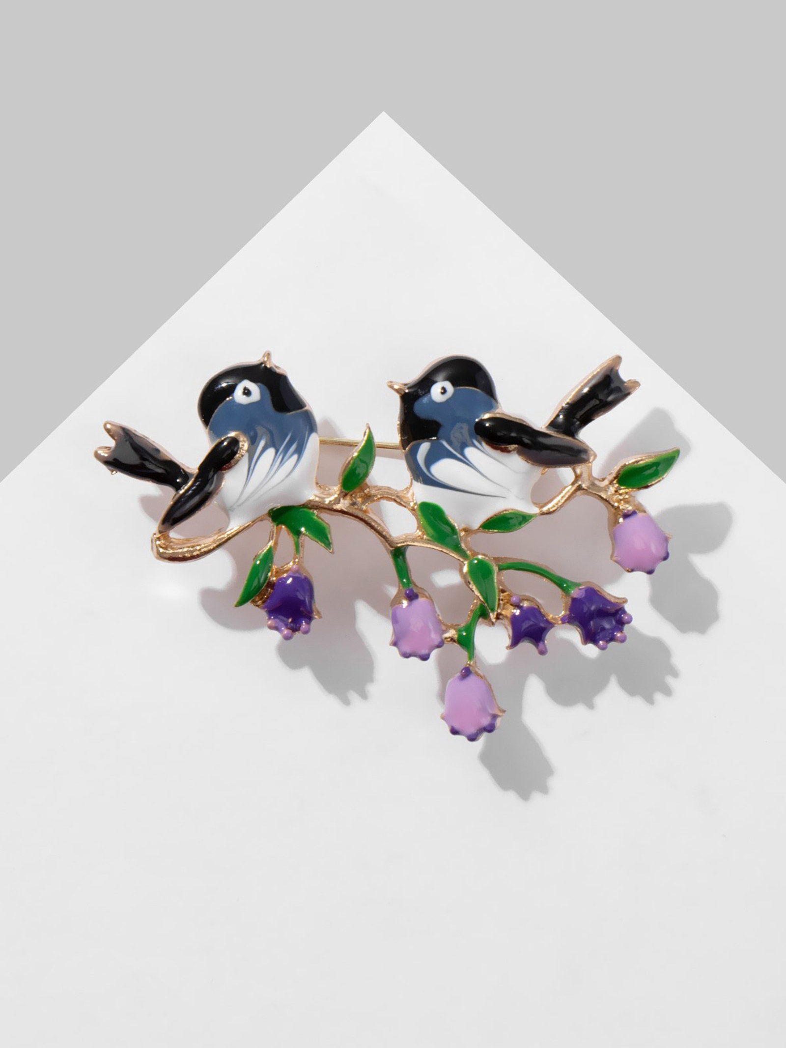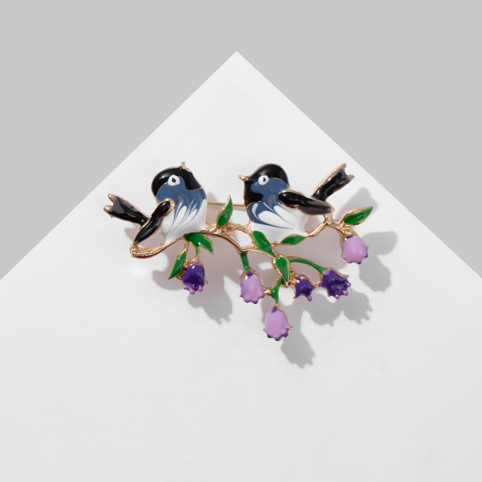Брошь "Птички" на цветочной ветви, цветная в золоте, 3x4.5x1.5 см., QF, Китай