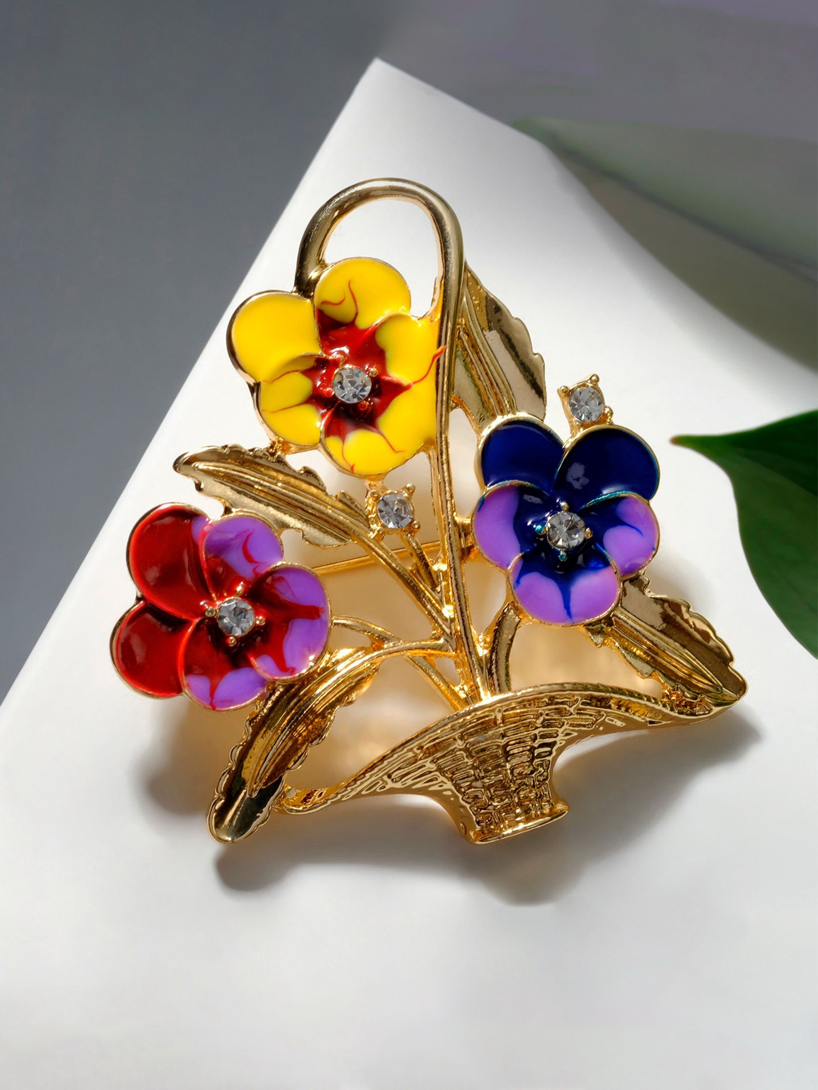 Брошь "Цветочная корзинка" анютины глазки, цветная в золоте, 4.5x4.5x1.5 см., QF, Китай