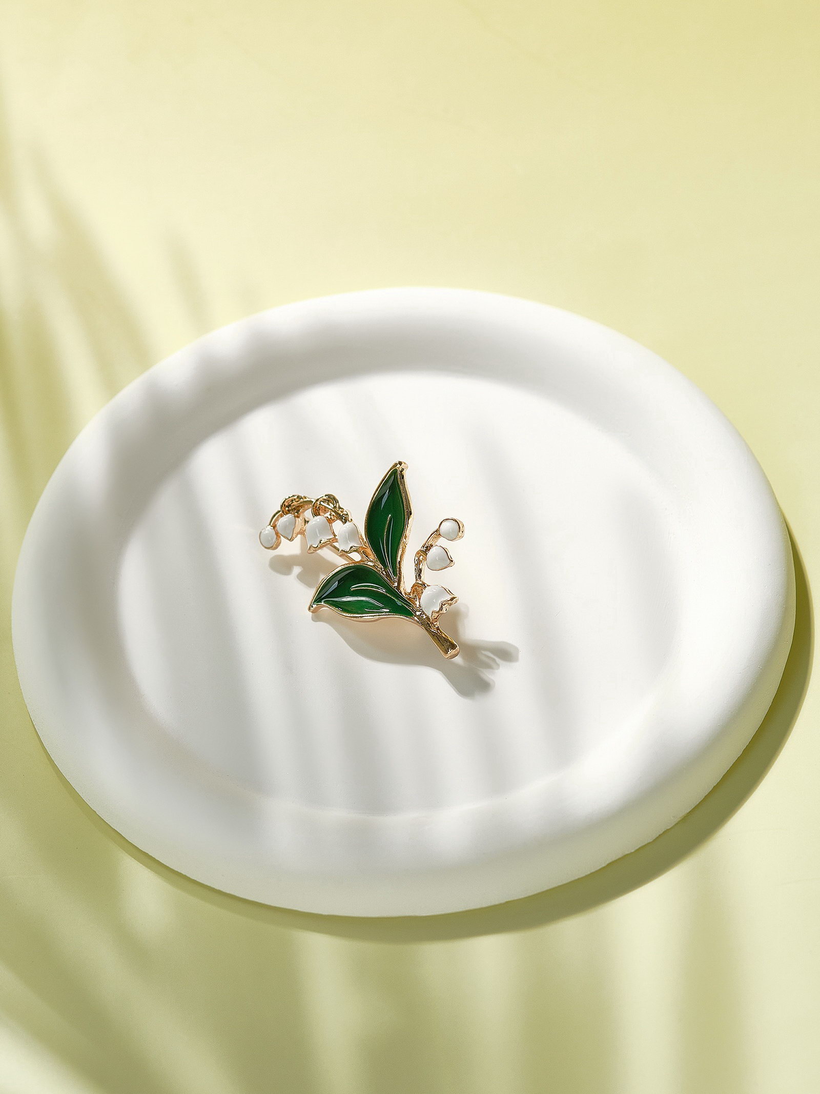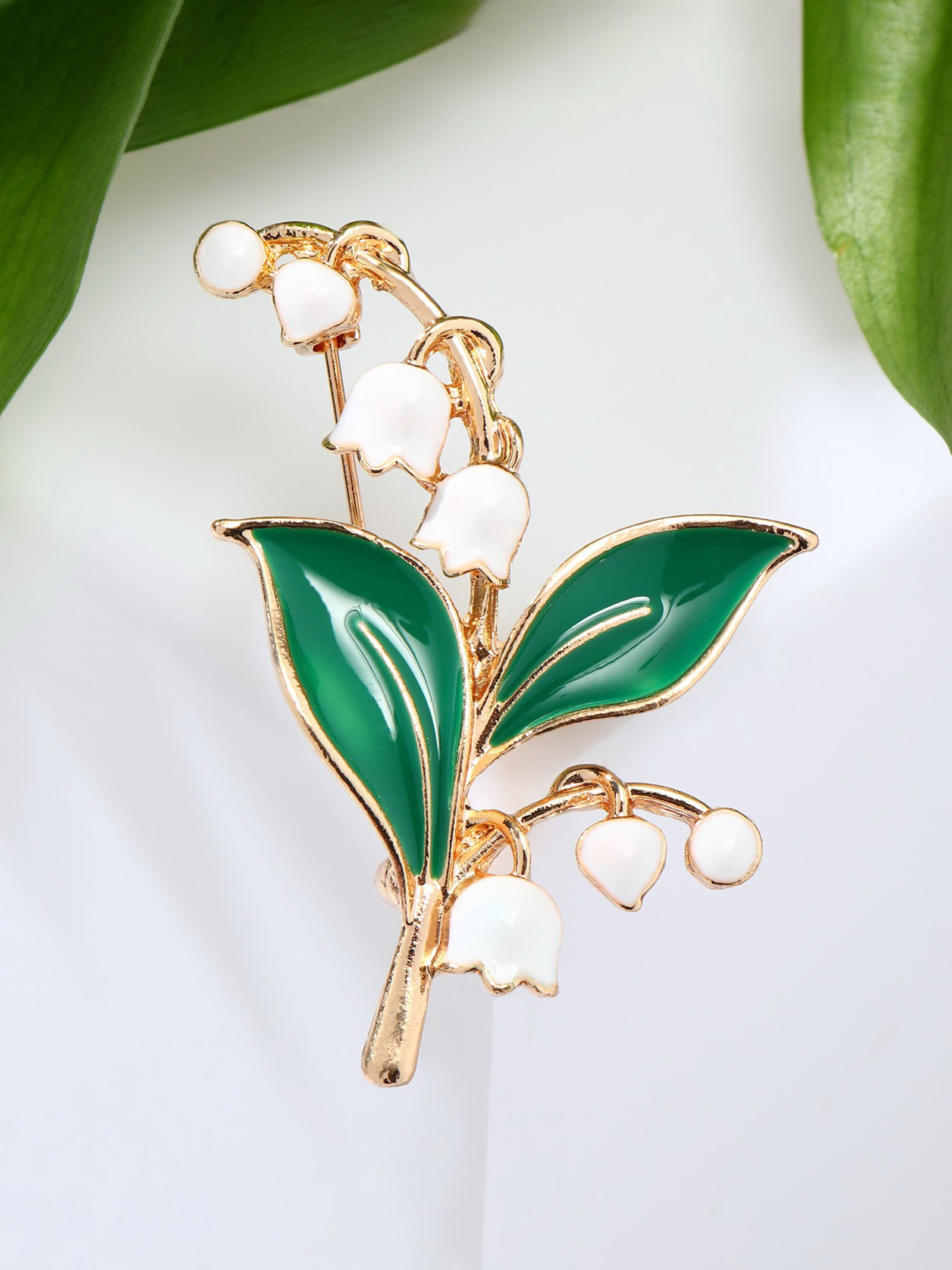 Брошь "Ландыши" две веточки, цвет бело-зелёный в золоте, 2.5x5.2x1 см., QF, Китай