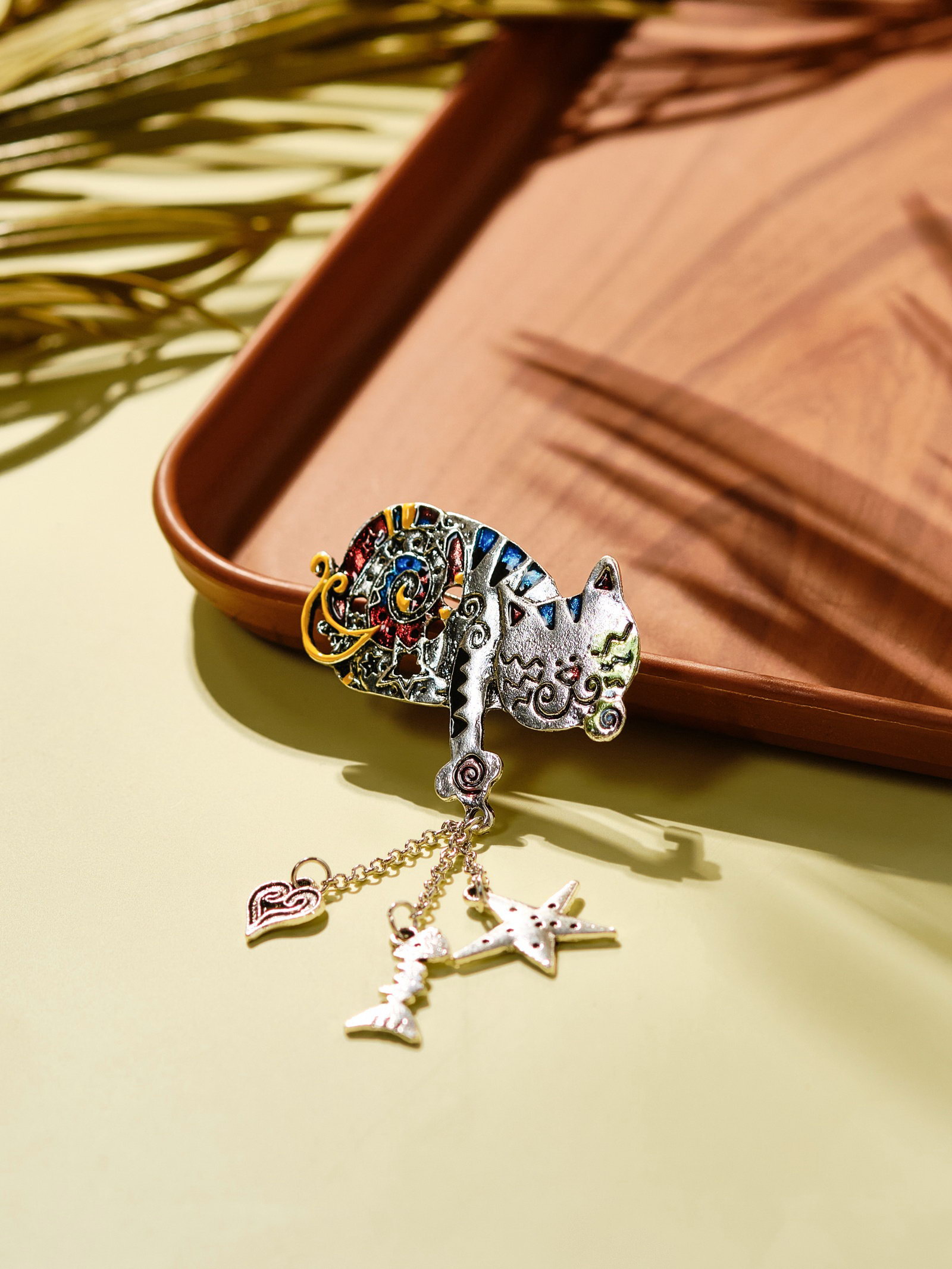 Брошь "Кот" сказочный, цветная в серебре, 5.3x8.7x0.5 см., QF, Китай
