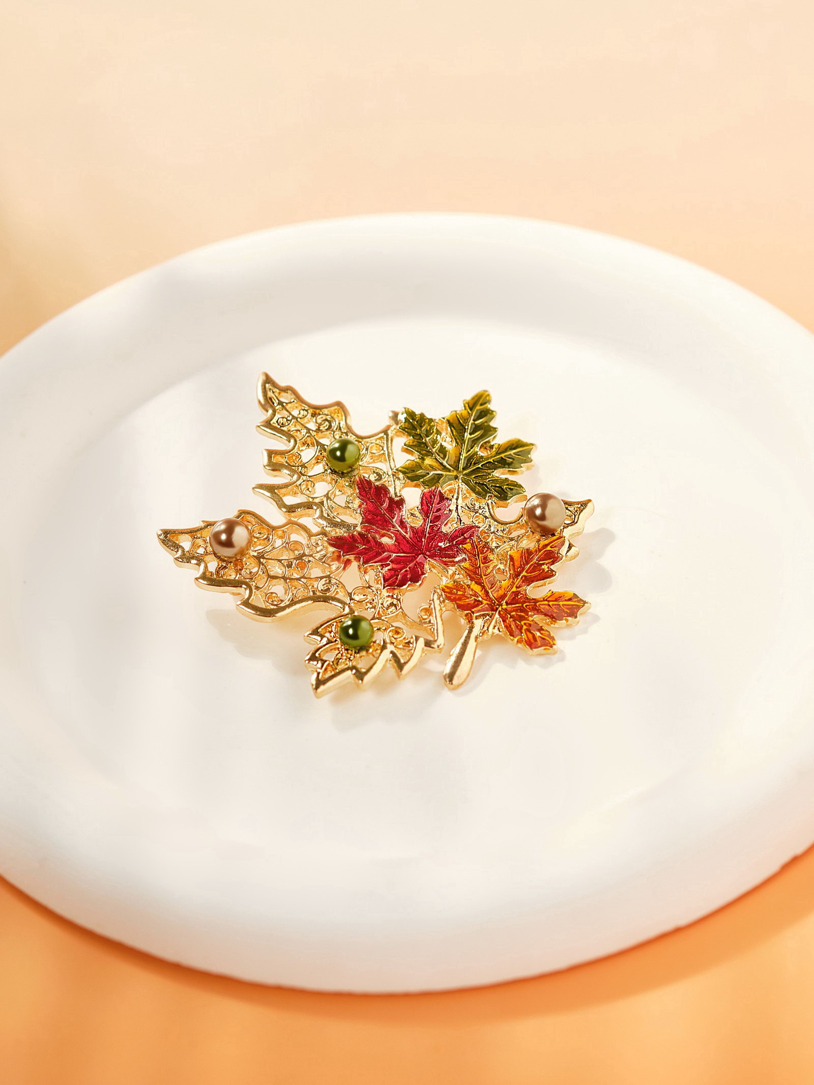 Брошь "Лист" кленовый осенний, цветная в золоте, 6.2x6.1x1 см., QF, Китай