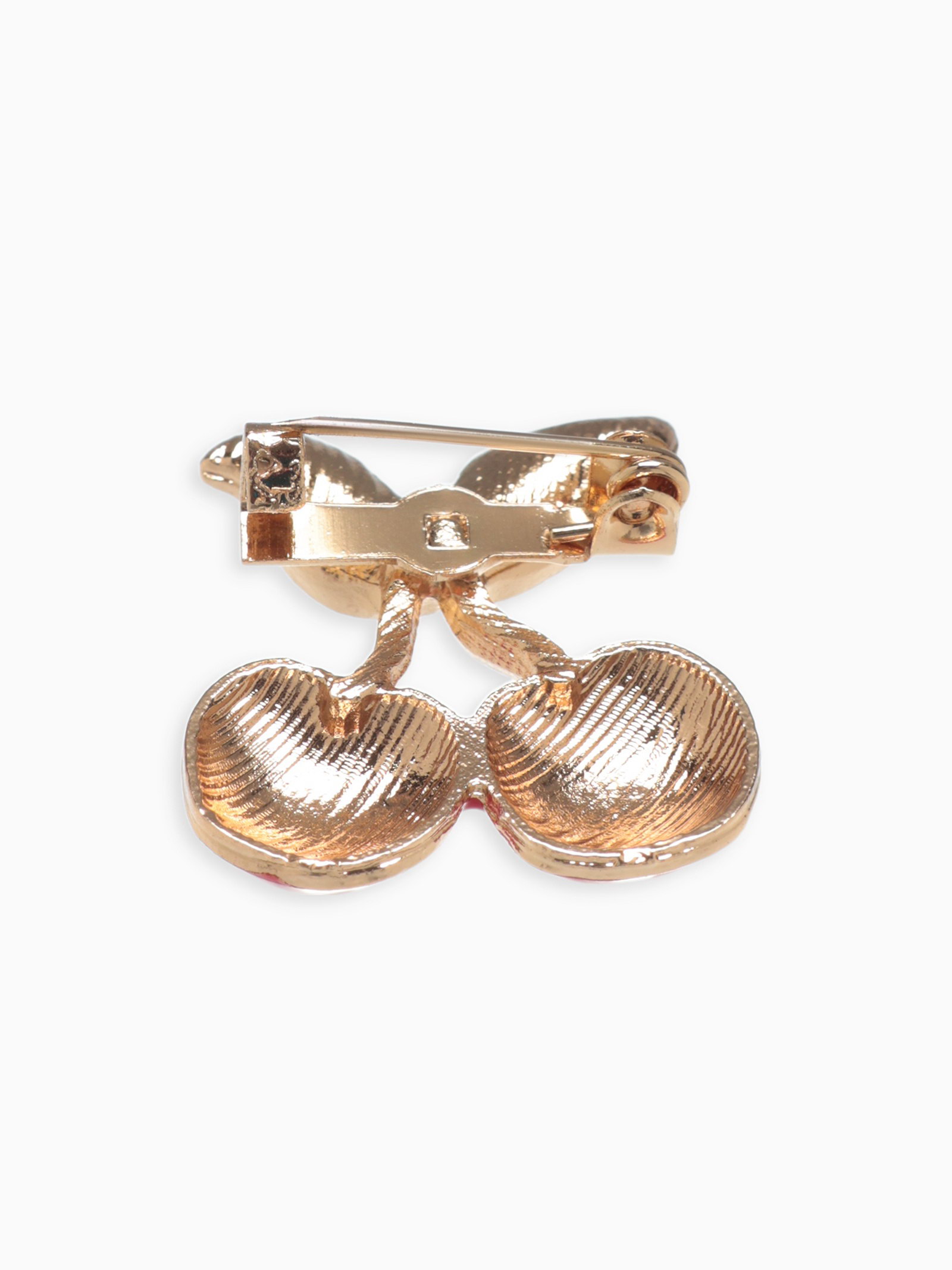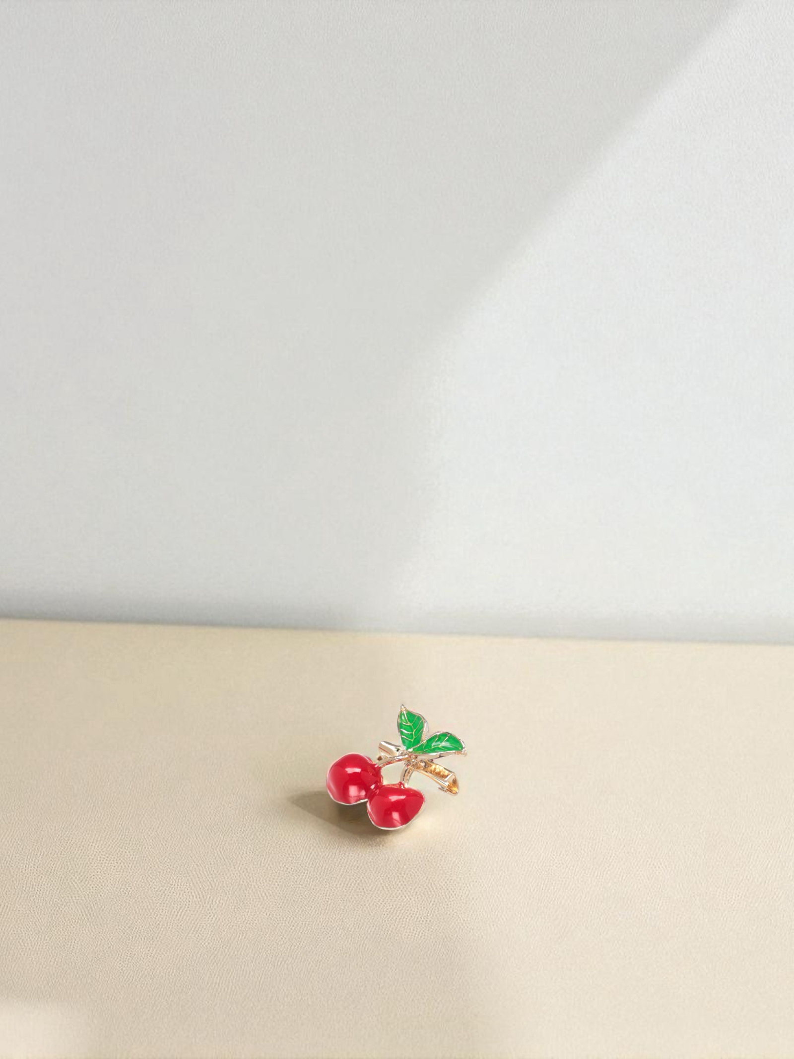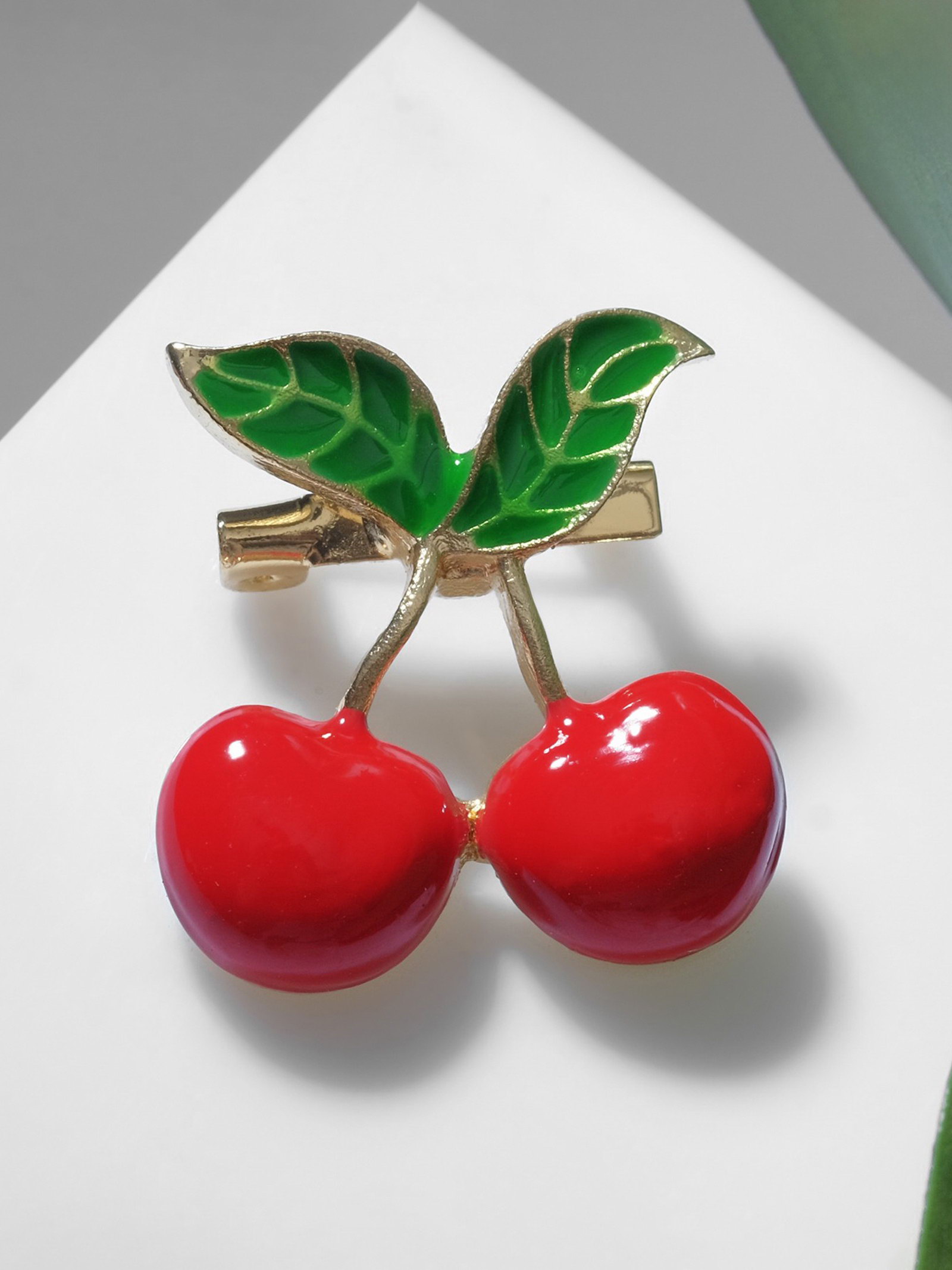 Брошь "Вишенки" пара с листом, красно-зелёная в золоте, 2x2x1.5 см., QF, Китай