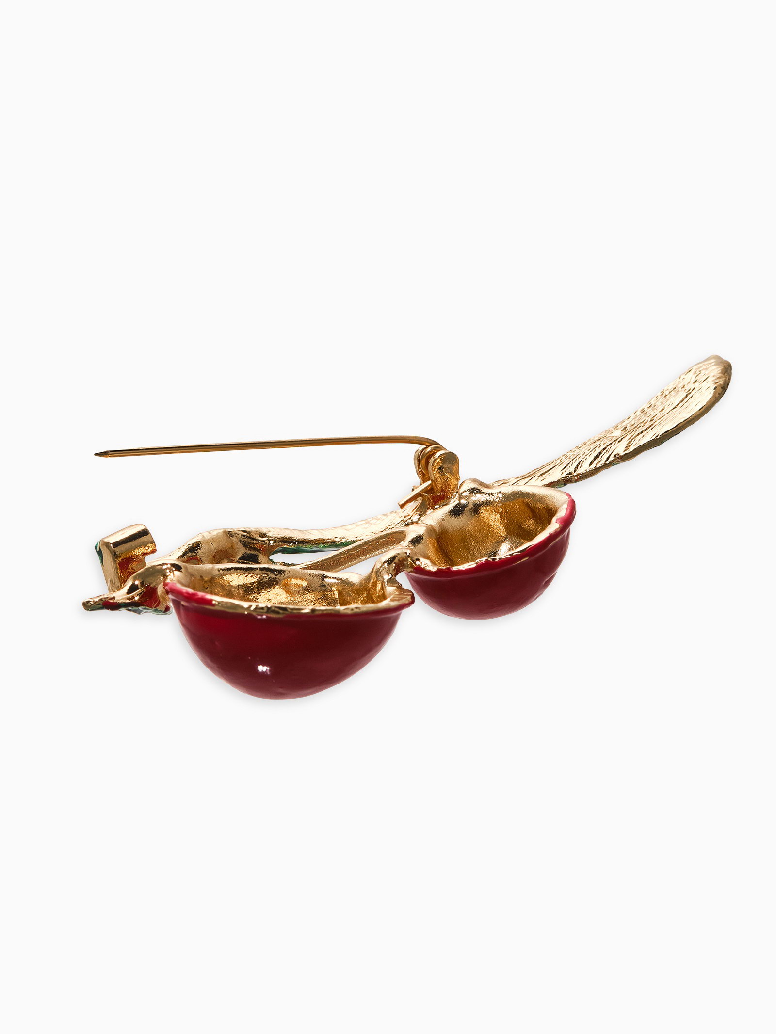 Брошь "Вишня с листиками", красный, зелёный в золоте, 3x6.3x1.5 см., QF, Китай
