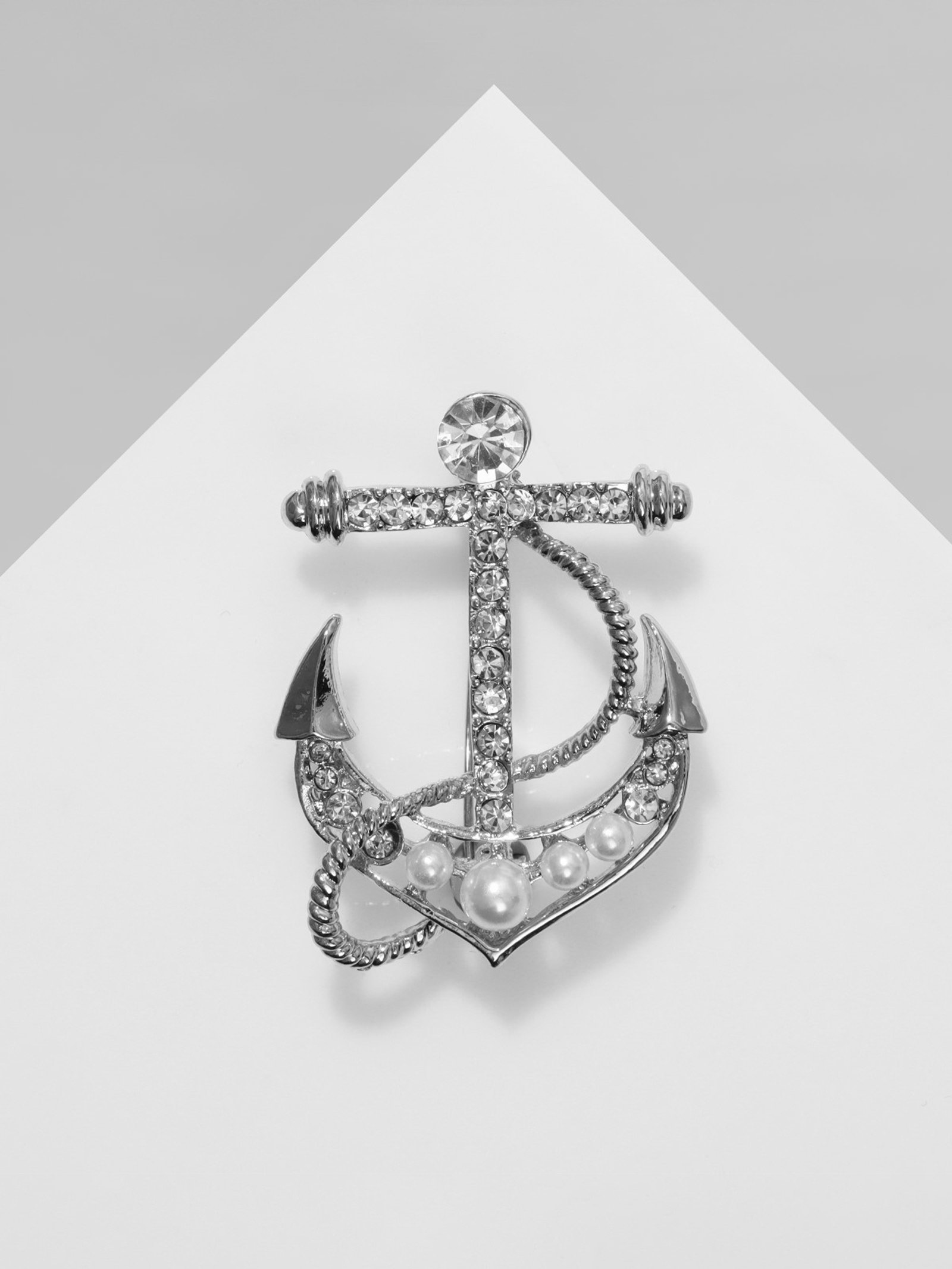 Брошь "Якорь" с бусинками, цвет белый в серебре, 3x4x1 см., QF, Китай