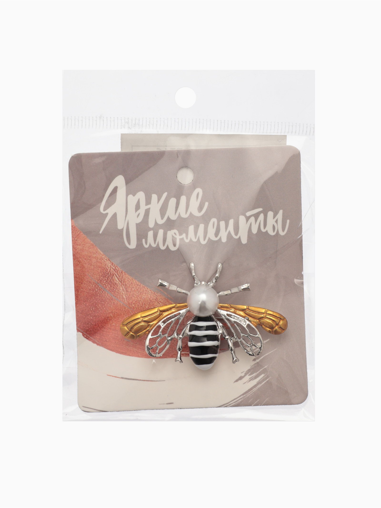 Брошь "Пчела" крупная, цвет чёрно-белый в серебре, 3.5x5x1 см., QF, Китай