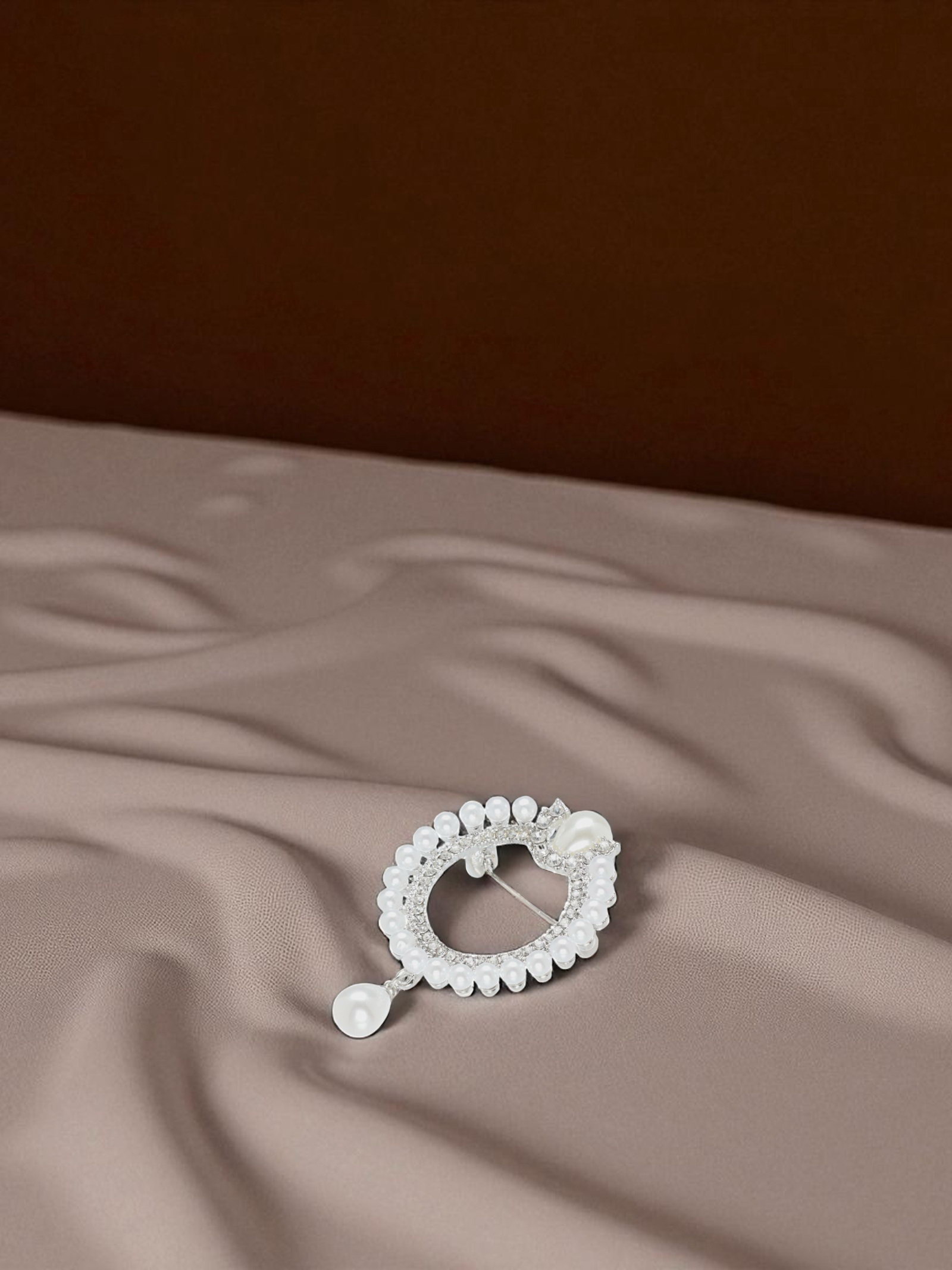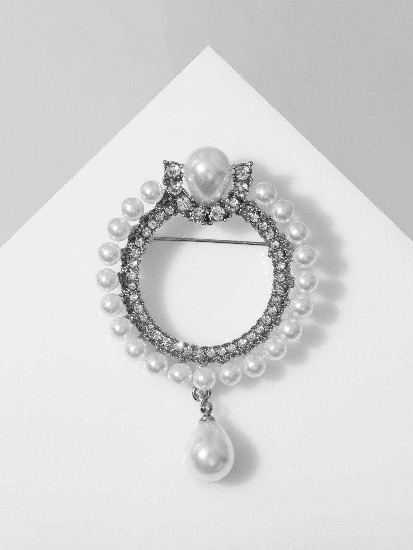 Брошь "Кольцо жемчужное" с подвеской, цвет белый в серебре, 4.5x5.5x1 см., QF, Китай