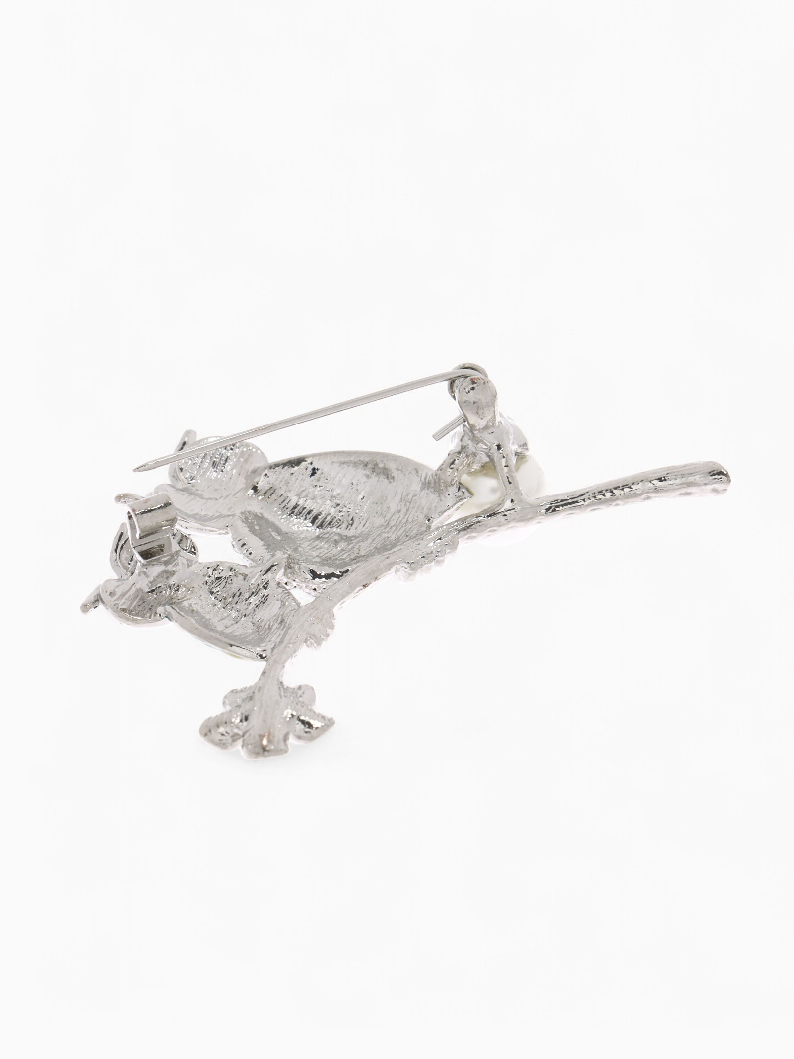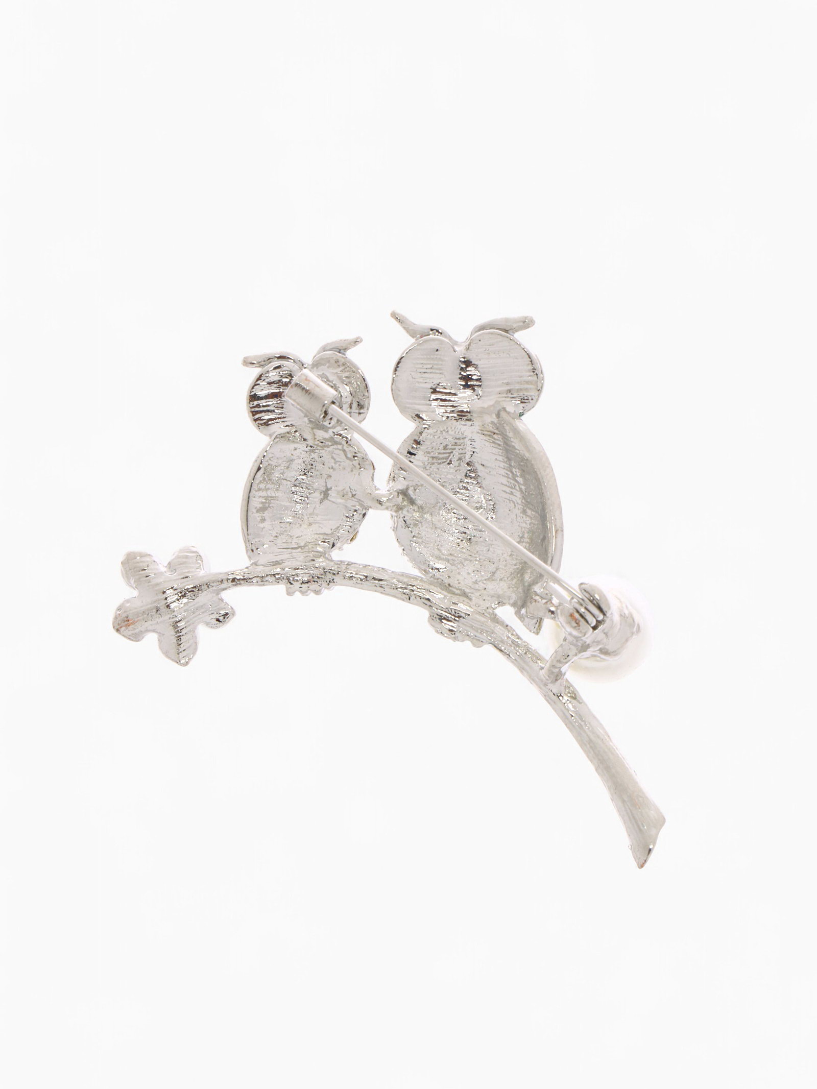 Брошь "Совы" на цветочной ветке, цвет бело-зелёный в серебре, 6x5.5x1 см., QF, Китай