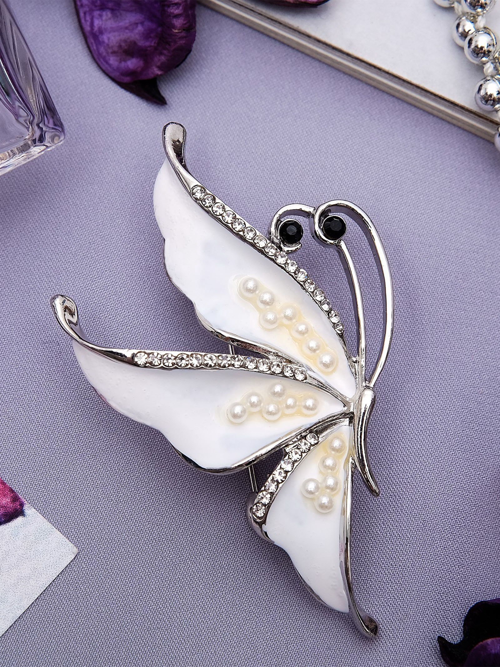 Брошь "Бабочка" нежность, цвет белый в серебре, 3.5x6x1 см., QF, Китай