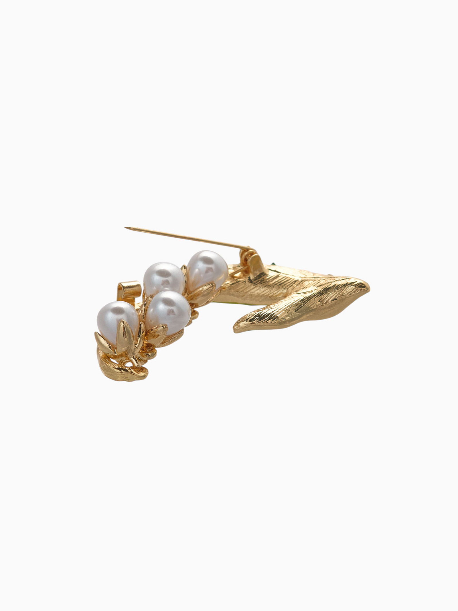 Брошь "Ландыши" веточка, цвет бело-зелёный в золоте, 3.5x5.2x1.5 см., QF, Китай