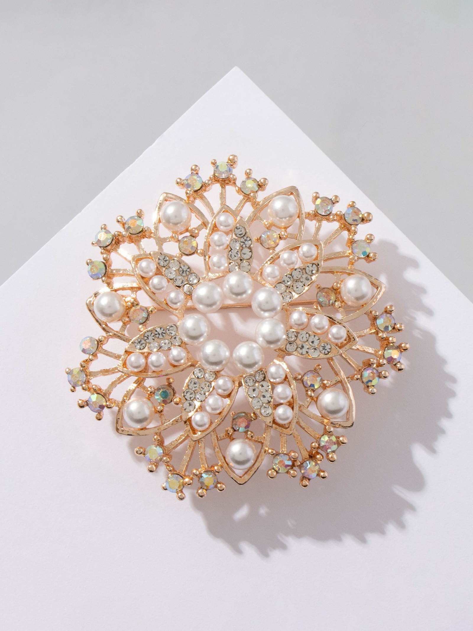 Брошь с жемчугом "Снежинка", белая в золоте, 5.5x5.5x2 см., QF, Китай