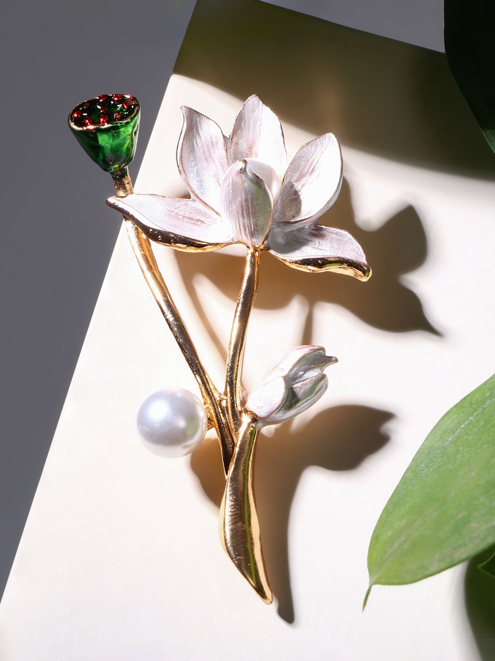 Брошь "Цветочная композиция", цвет бело-зелёный в золоте, 4x7x1.5 см., QF, Китай