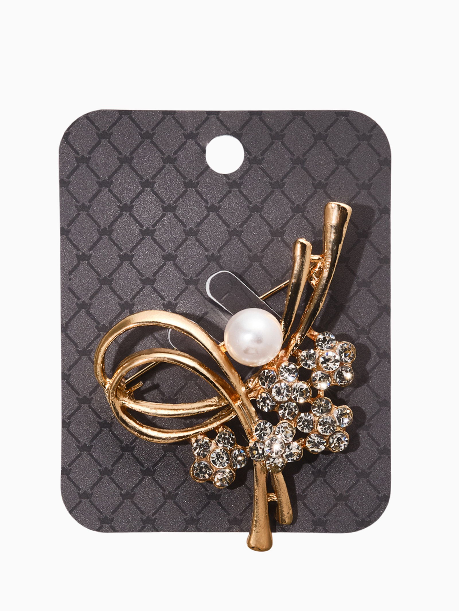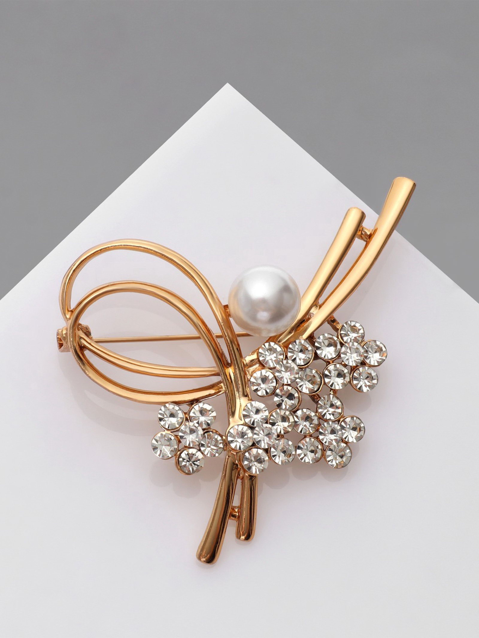 Брошь "Завиток" с бусиной и цветами, цвет белый в золоте, 4.3x5.8x1 см., QF, Китай