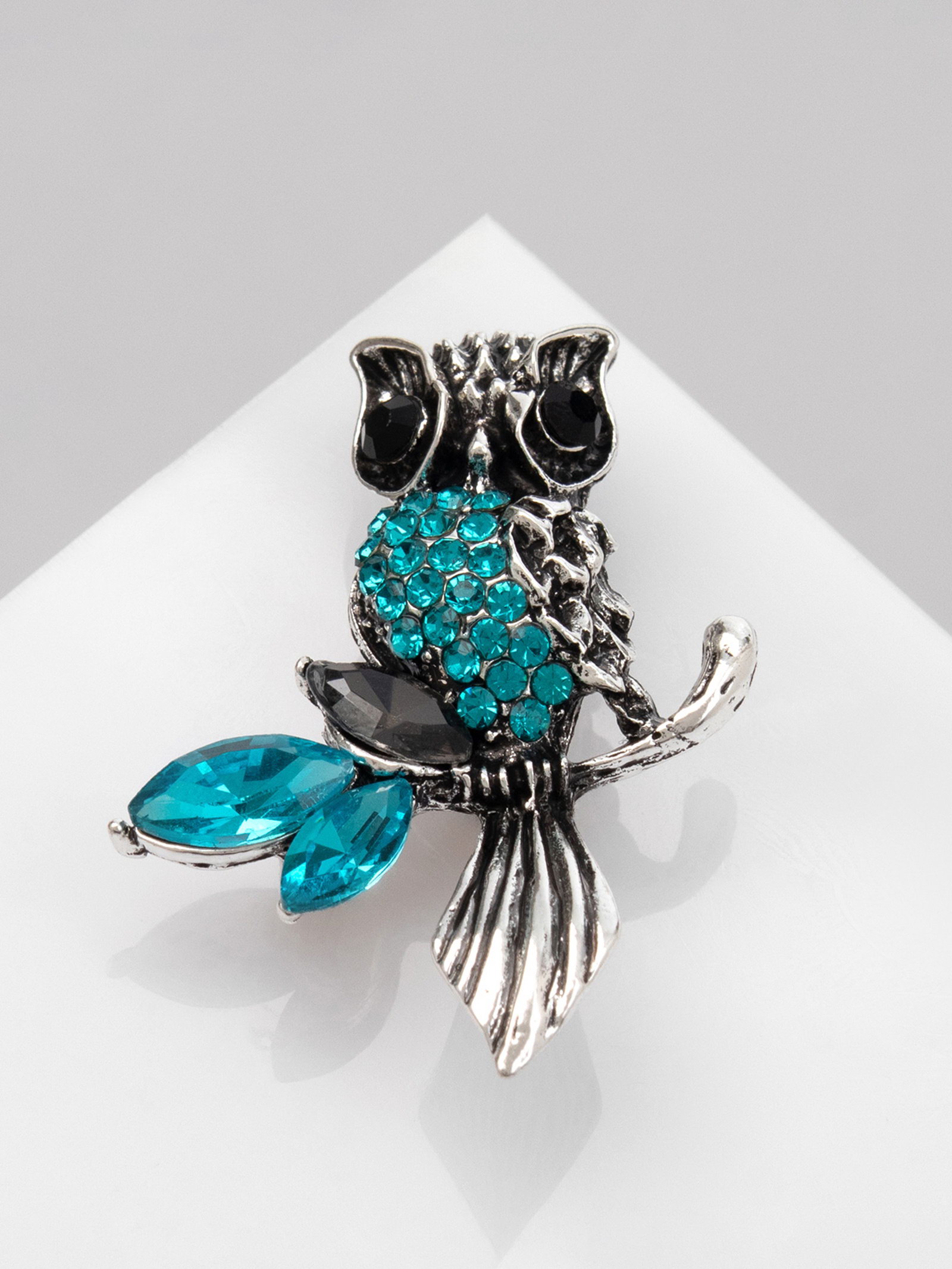 Брошь "Сова на ветке", голубая в чернёном серебре, 2.5x4x1 см., QF, Китай