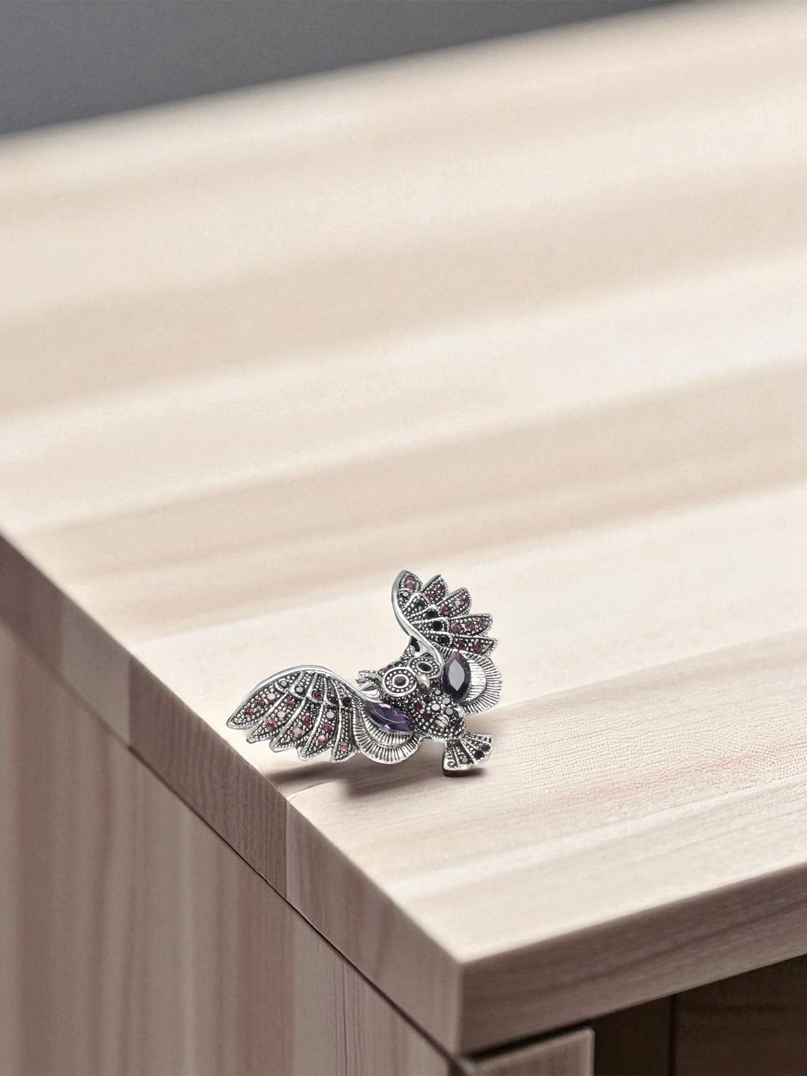 Брошь "Сова", фиолетовая в чернёном серебре, 3.5x5x1 см., QF, Китай