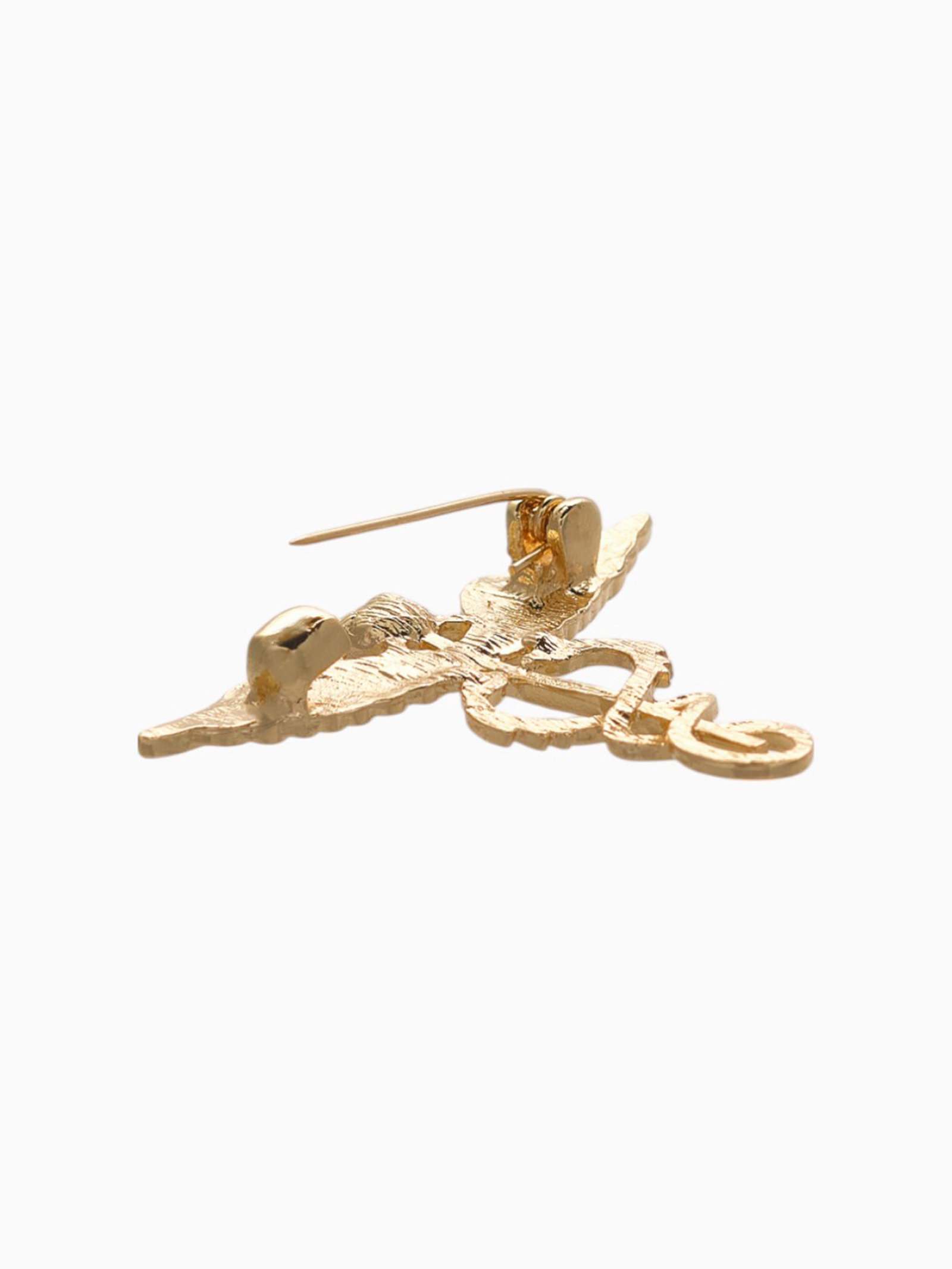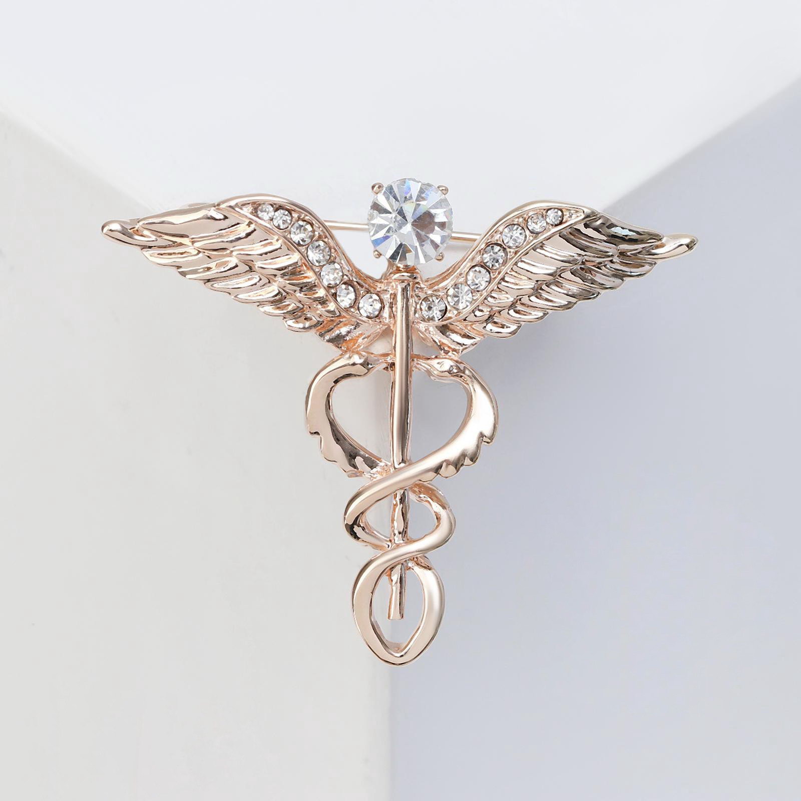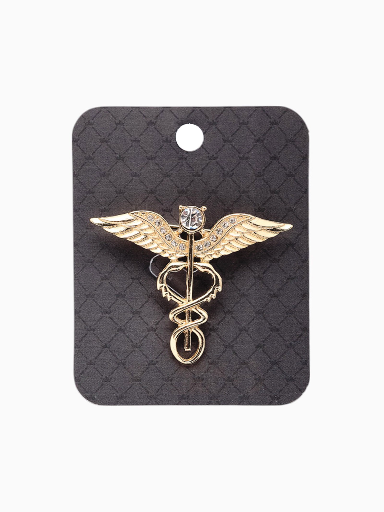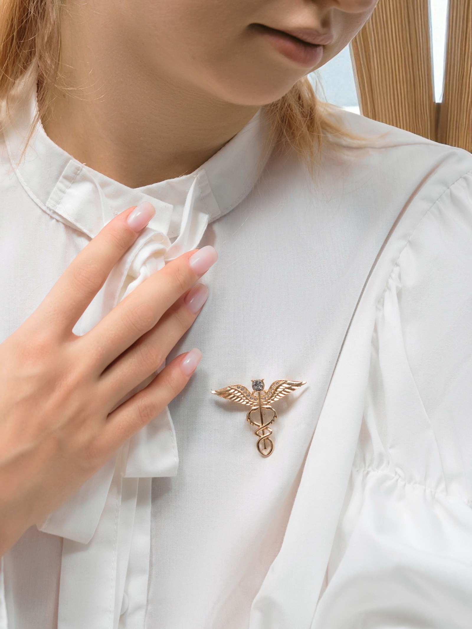 Брошь "Кадуцей", цвет белый в золоте, 4x4.7x0.7 см., QF, Китай