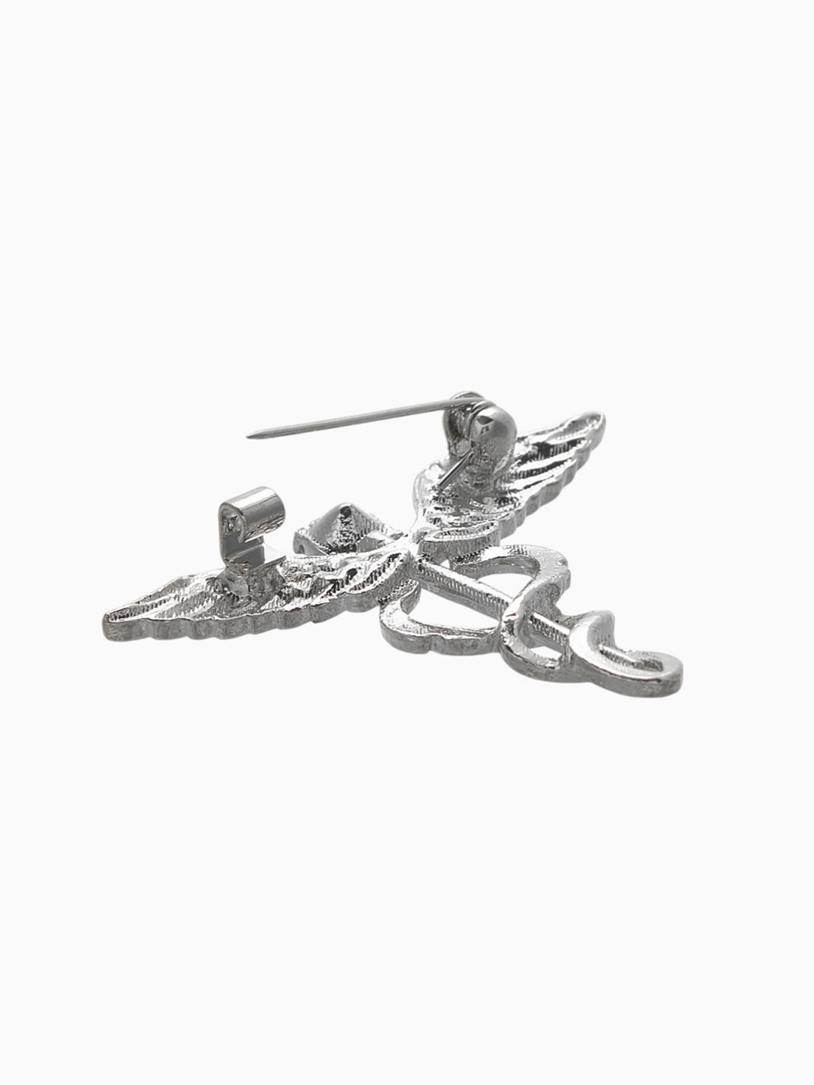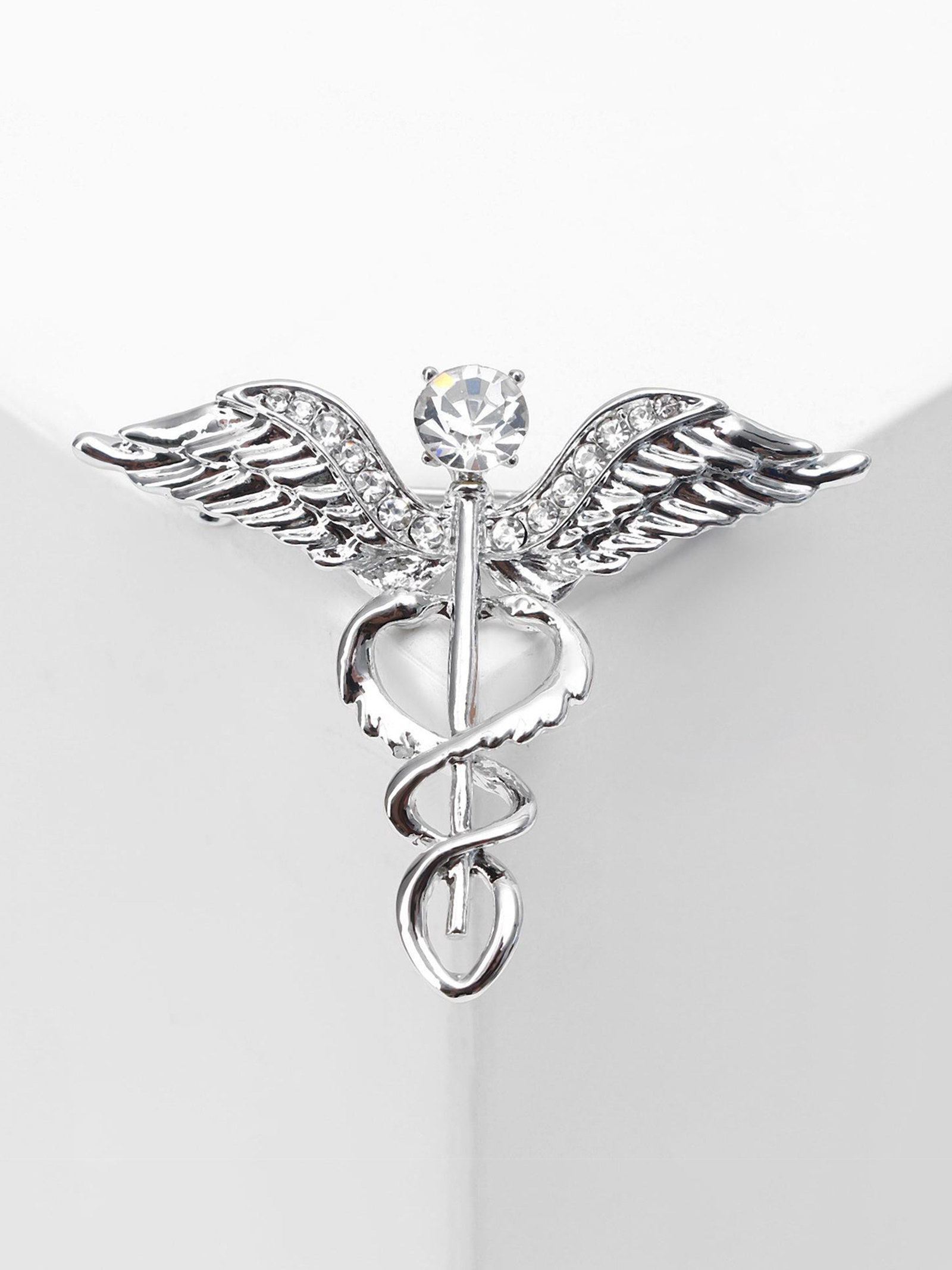 Брошь "Кадуцей" со стразиной, цвет белый в серебре, 4x4.7x1.5 см., QF, Китай