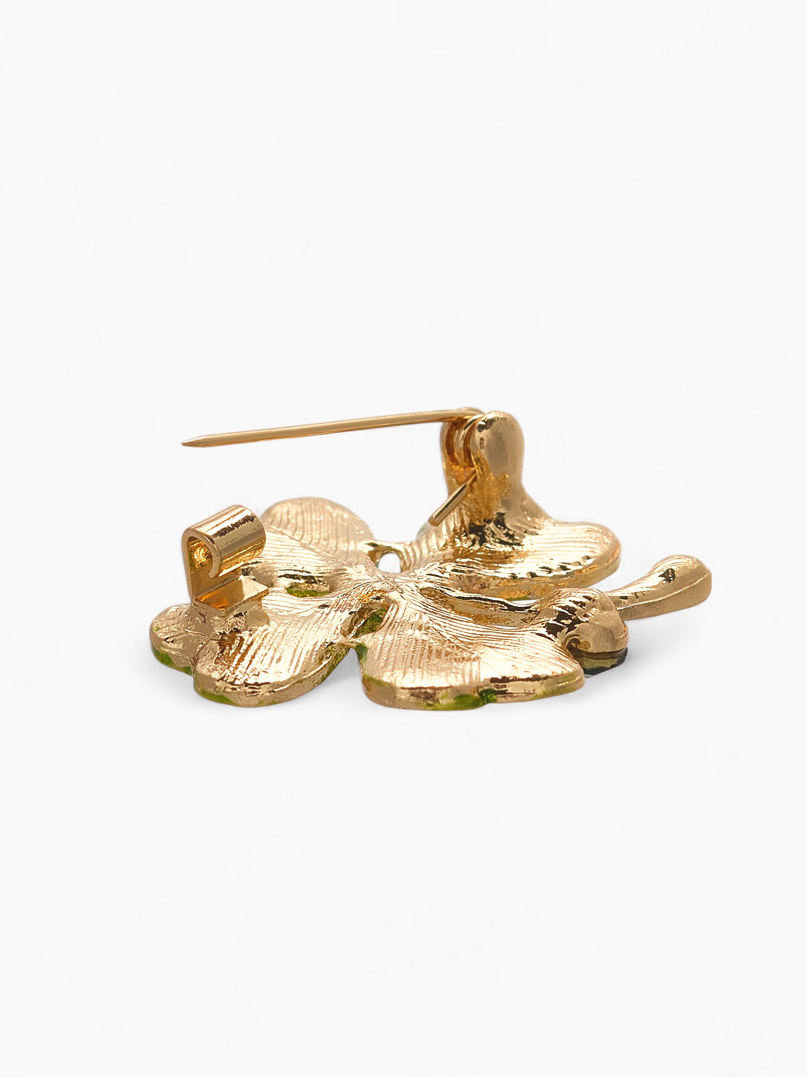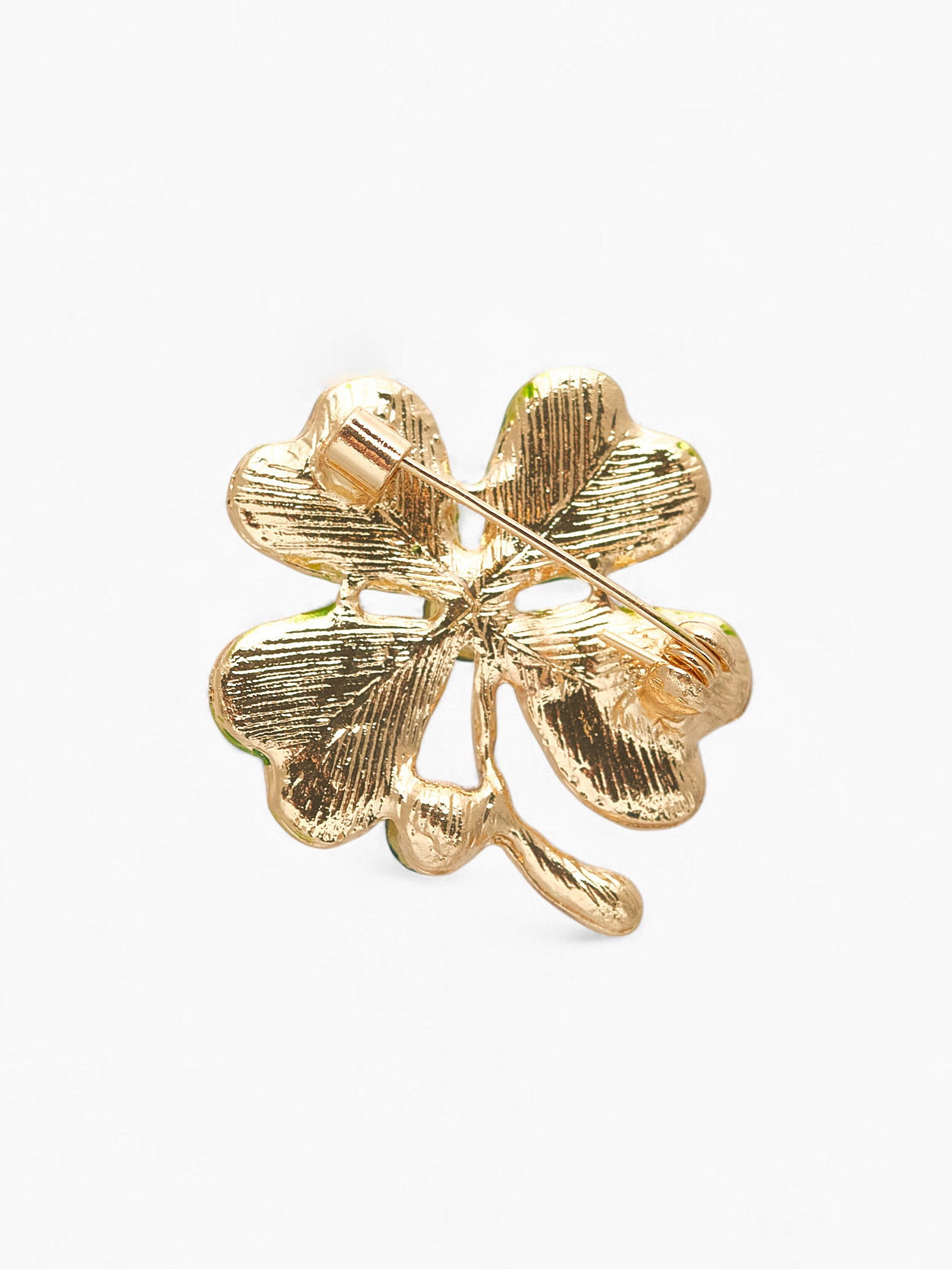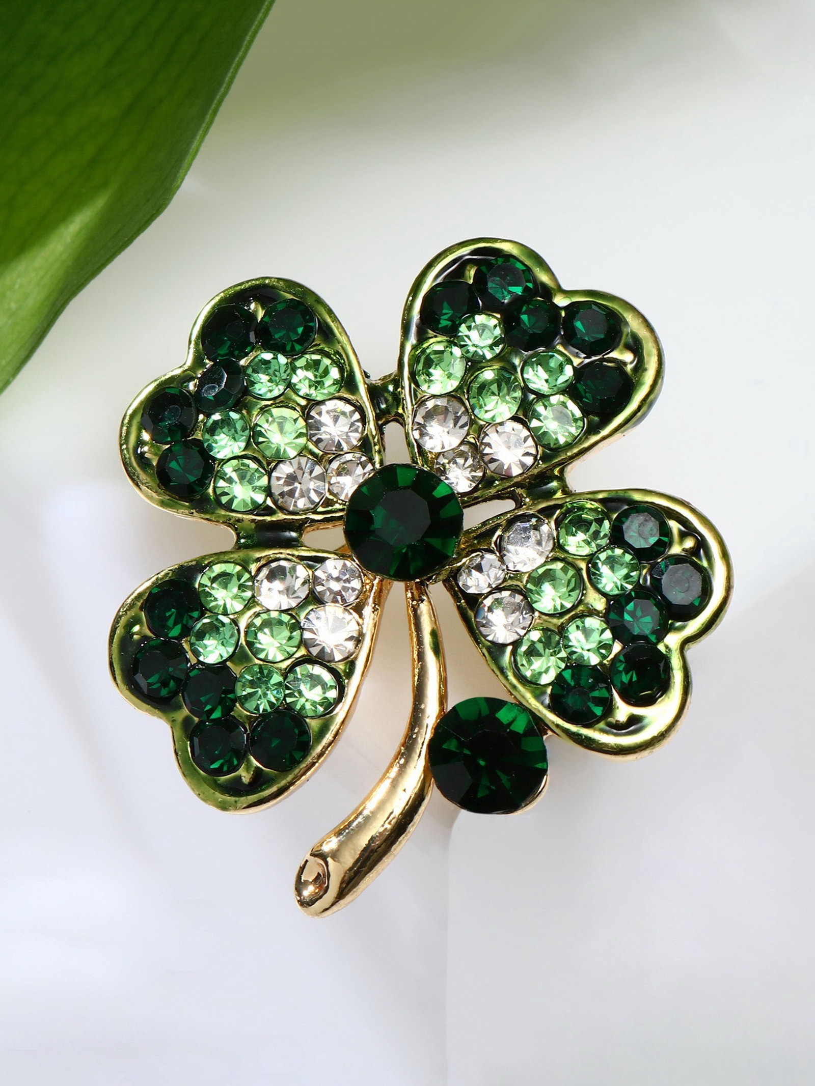 Брошь "Клевер" четырёхлистный со стразой, бело-зелёная в золоте, 3.3x3.5x1 см., QF, Китай