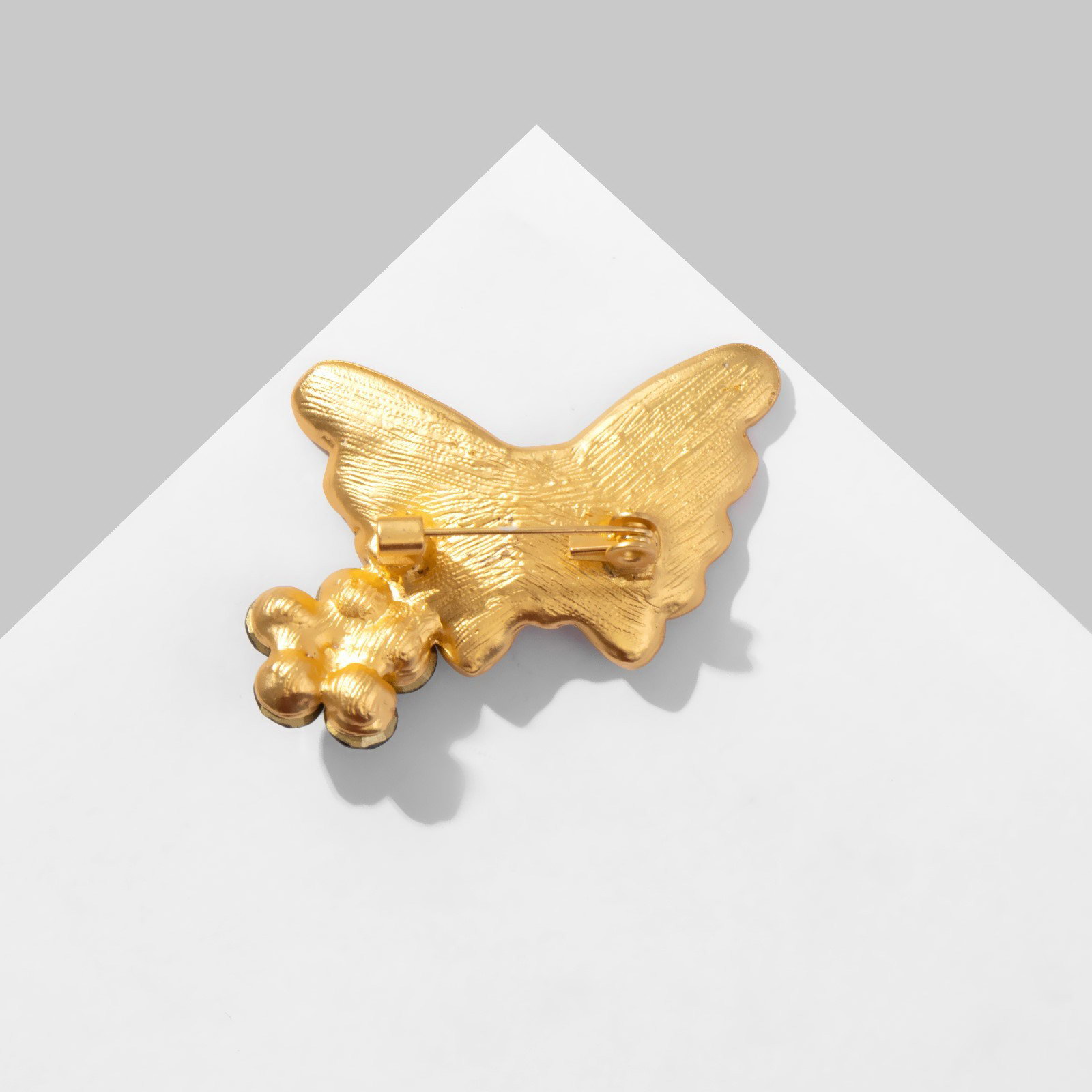 Брошь "Бабочка" с мини-цветочком, фиолетовая в матовом золоте, 5x3.5x1 см., QF, Китай