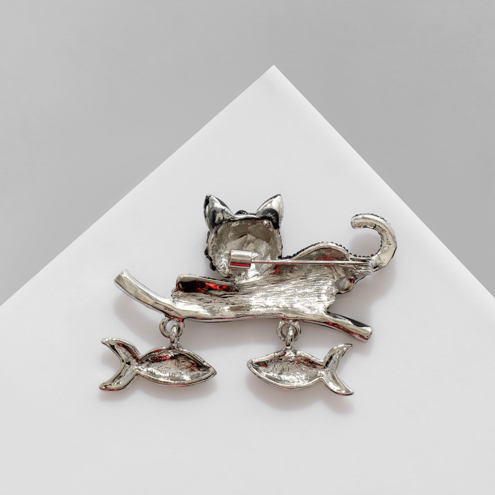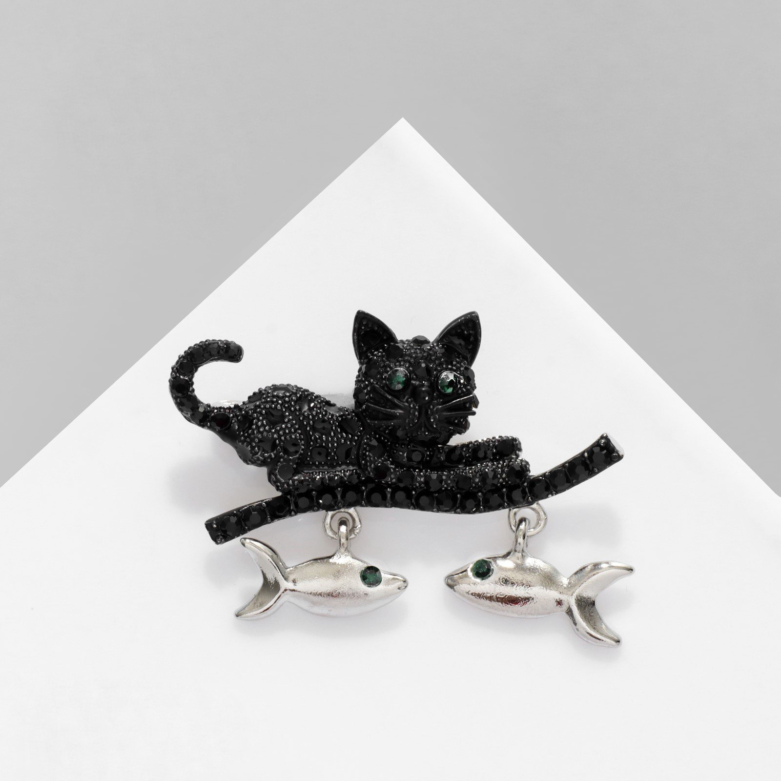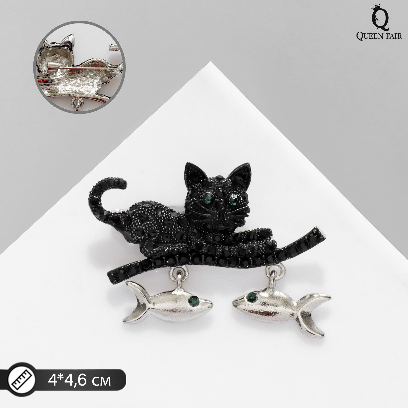 Брошь "Котик" с уловом, цвет чёрно-зелёный в серебре, 4.6x4x1.5 см., QF, Китай