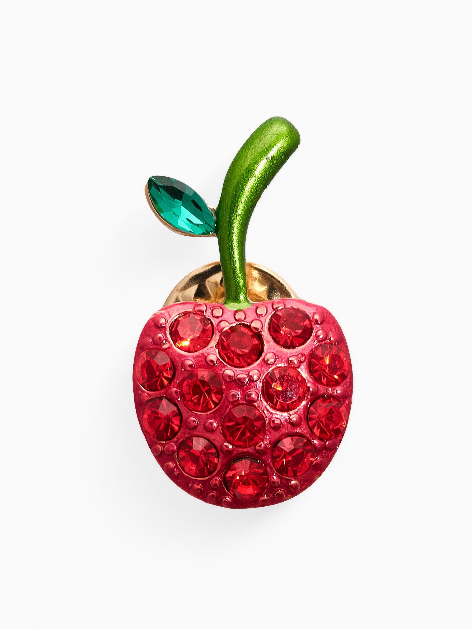 Брошь "Вишня стразинка", красно-зелёная в золоте, 1.5x3x1 см., QF, Китай