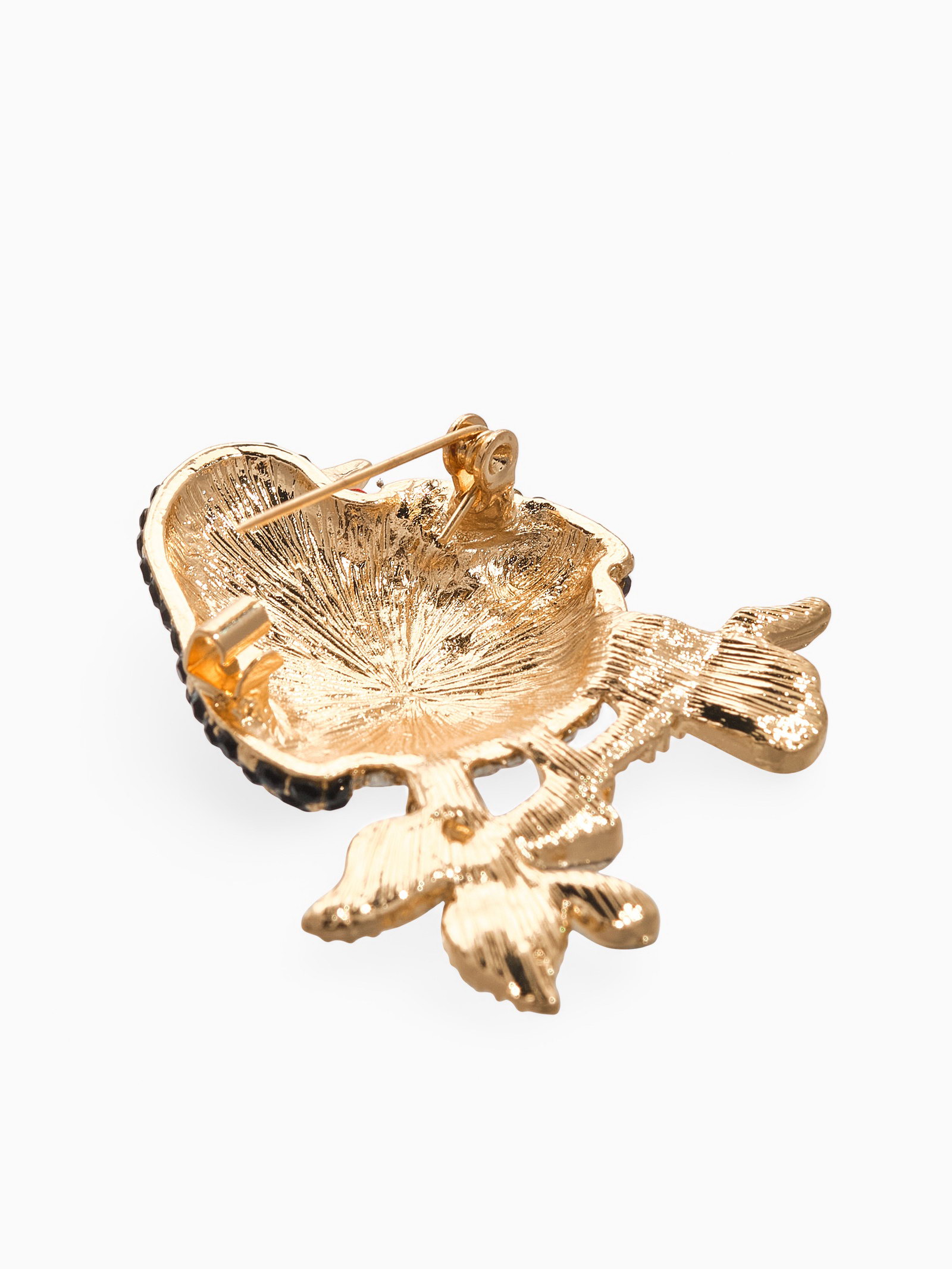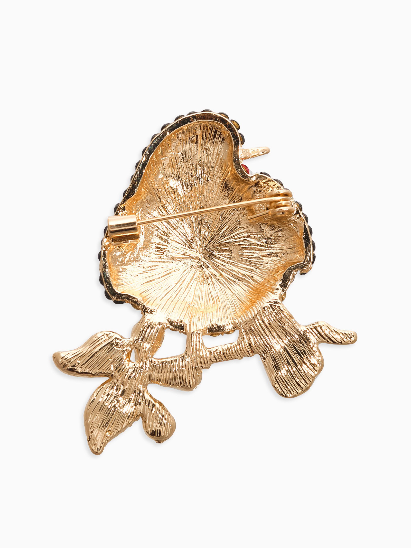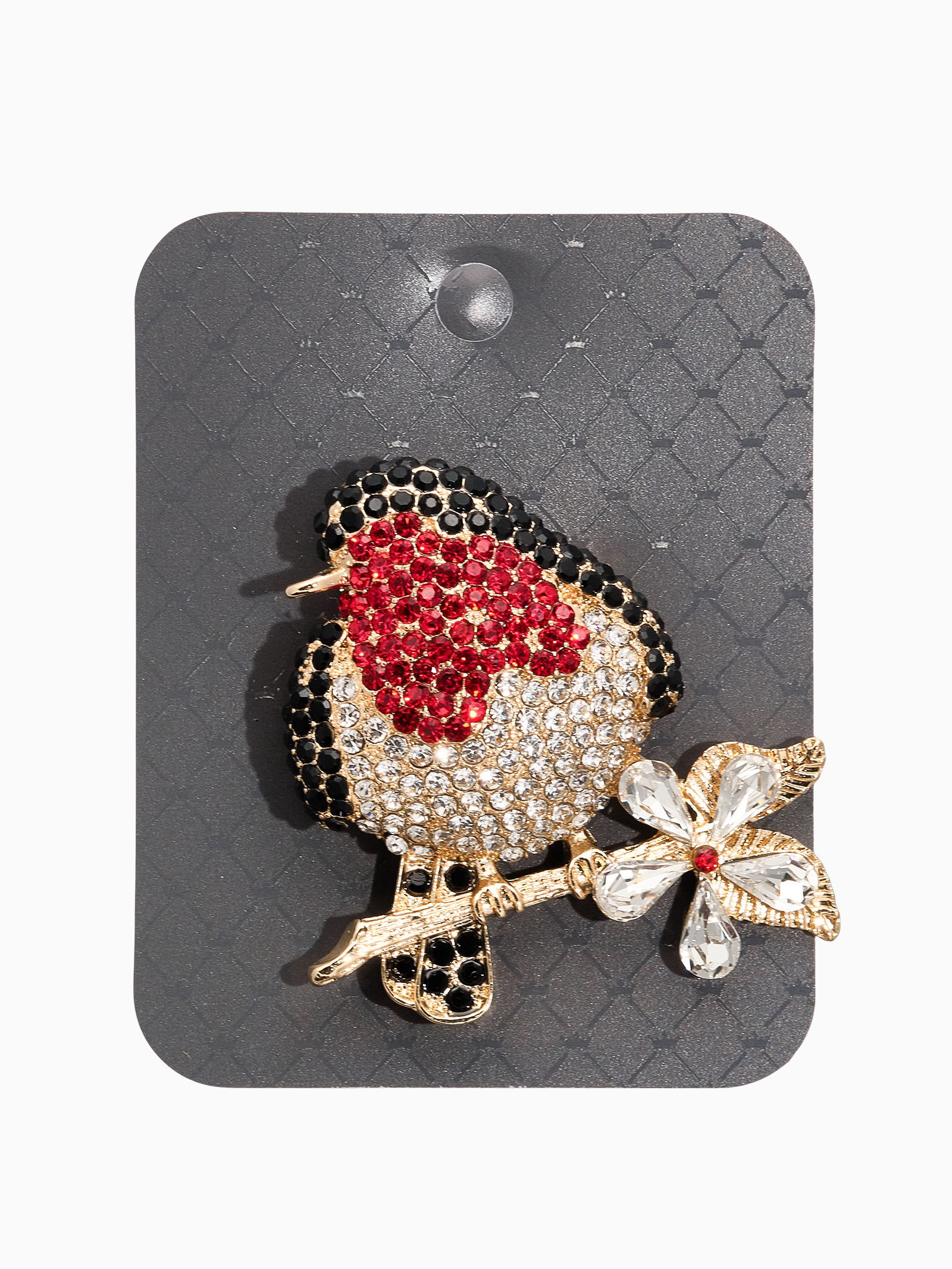 Брошь "Снегирь" в стразах, чёрно-красная в золоте, 4.5x4.5x1 см., QF, Китай