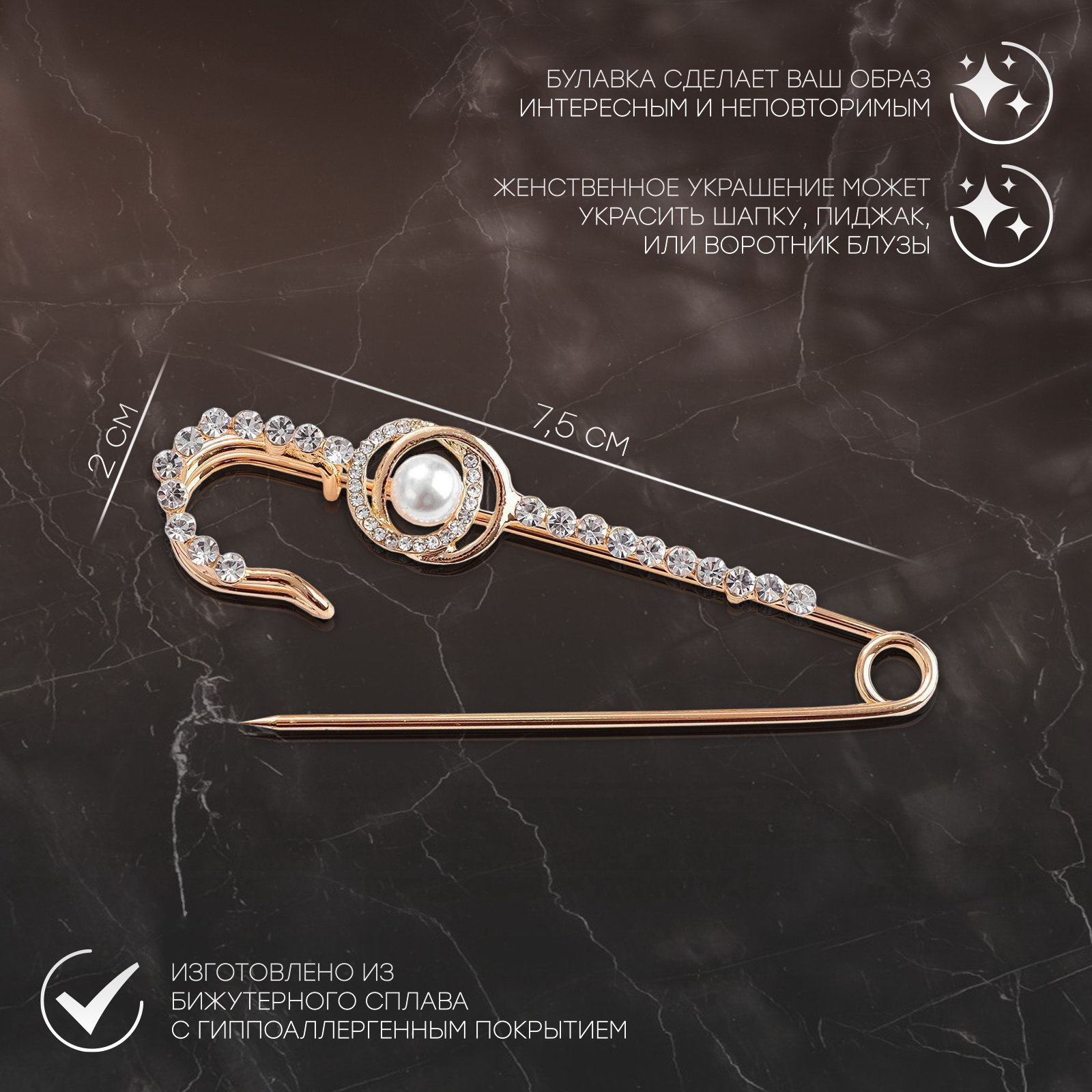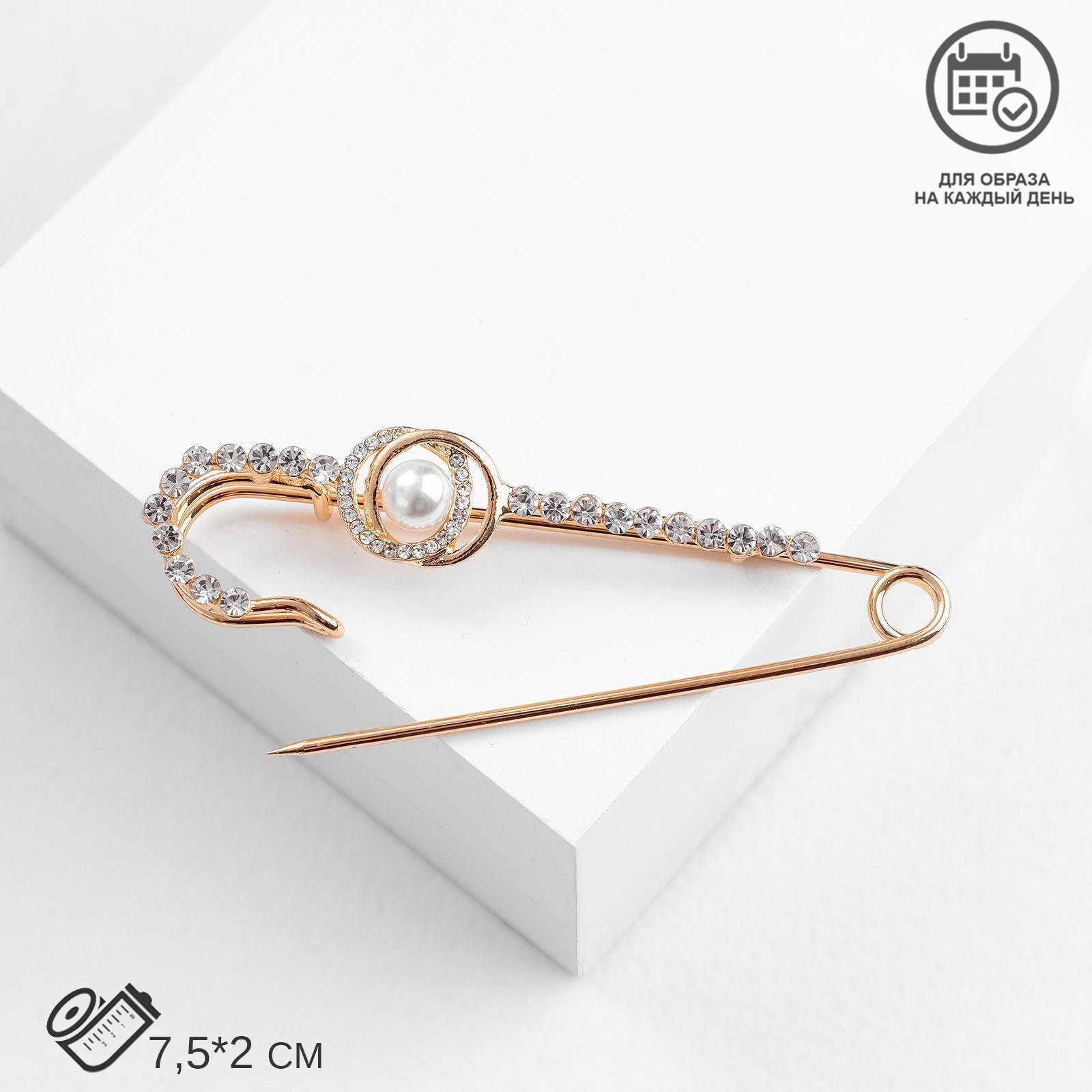Булавка "Классика" овалы с жемчужиной, 7.5 см, белая в золоте, 2x7.5x2 см., QF, Китай