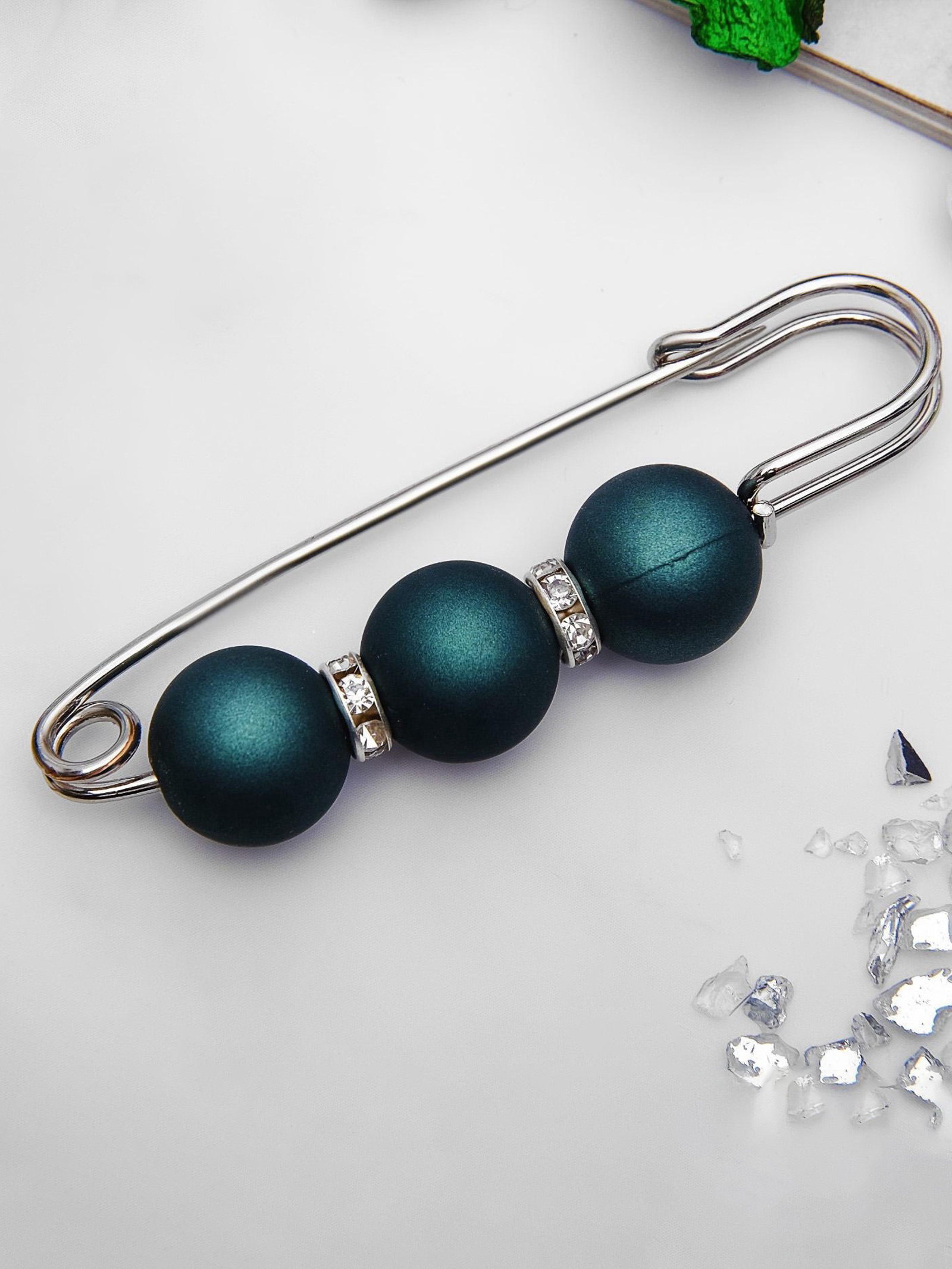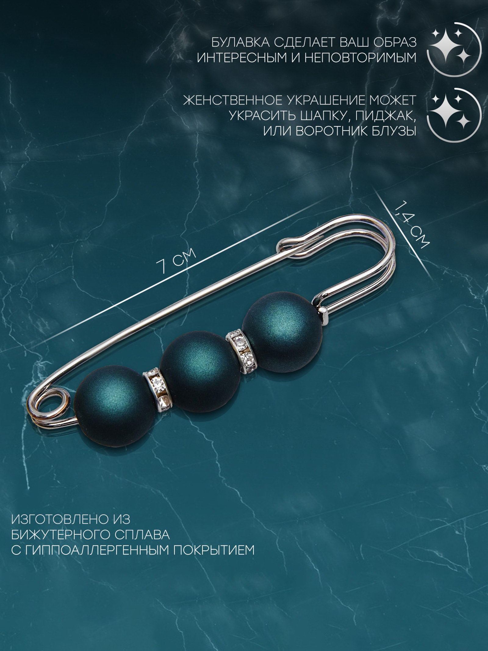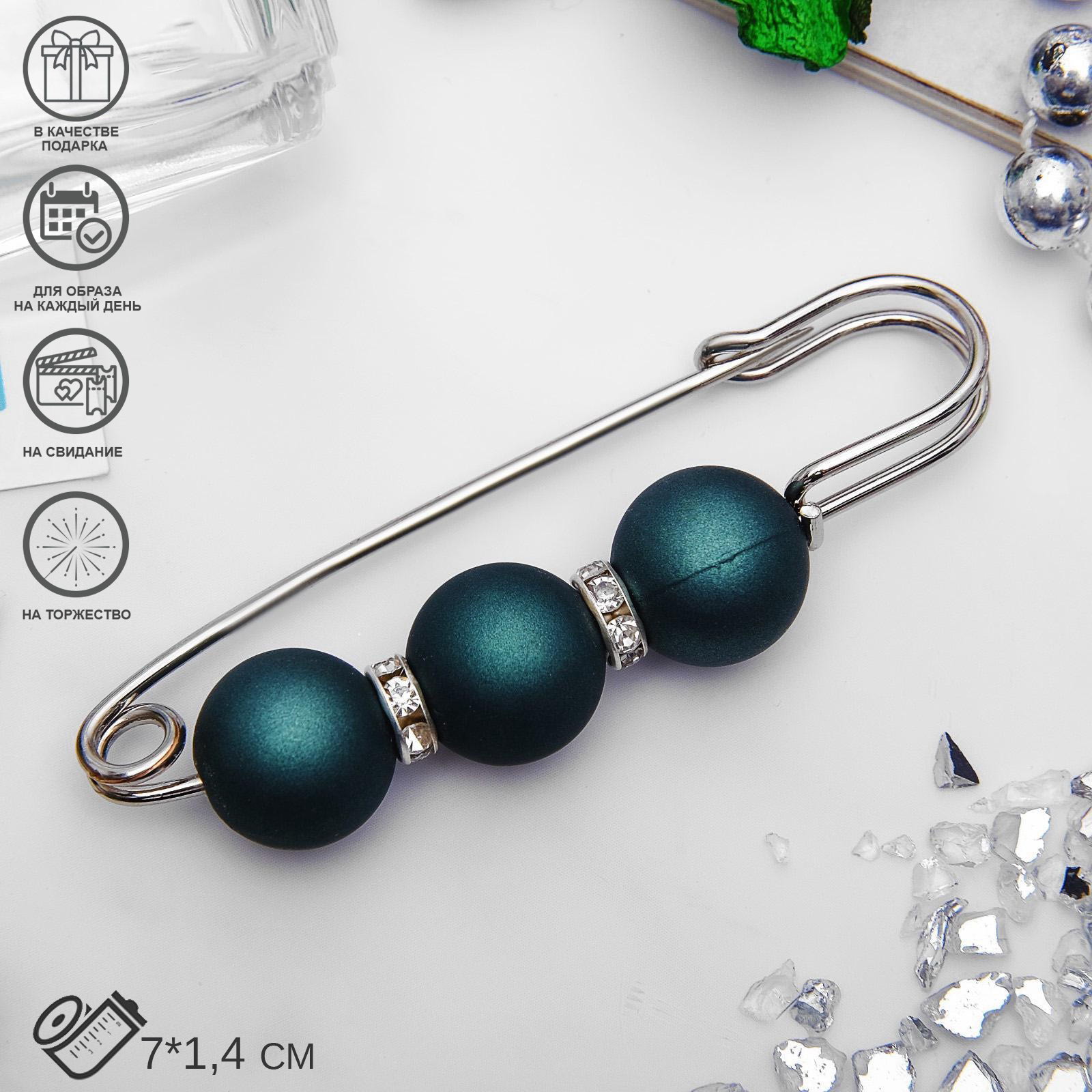 Булавка "Трио", 7 см, шар №14, матовый тёмно-зелёная в серебре, 1.4x7x1.4 см., QF, Китай