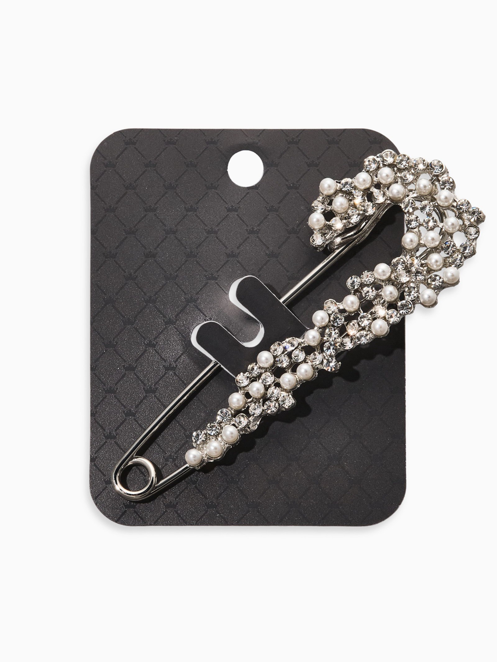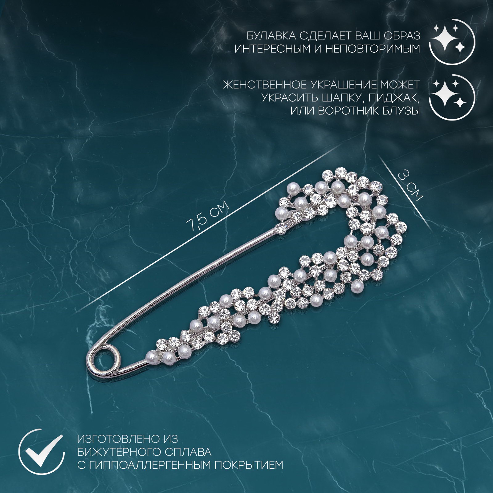 Булавка "Жемчужная россыпь" со стразами, 7.5 см, белая в серебре, 3x7.5x1.5 см., Queen fair, Китай