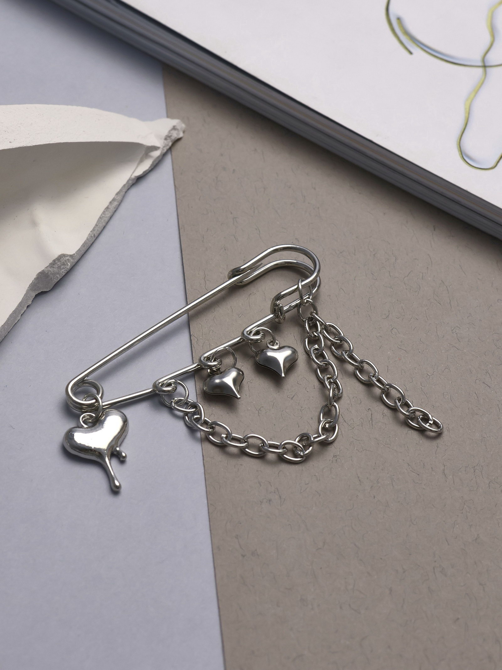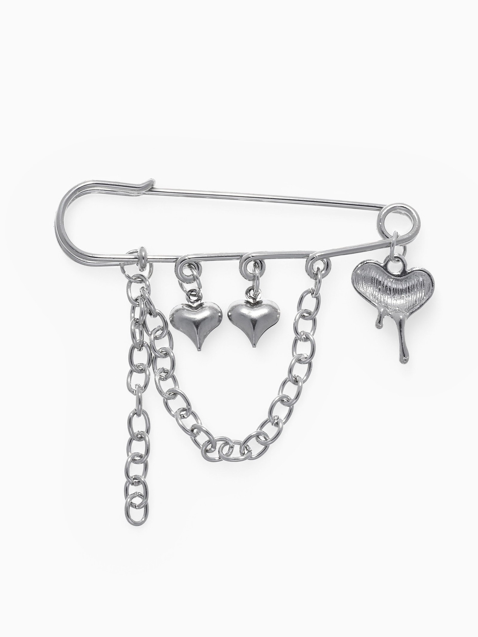 Булавка "Сердца" с цепочкой, цвет серебро, 0.5x6.3x6 см., QF, Китай