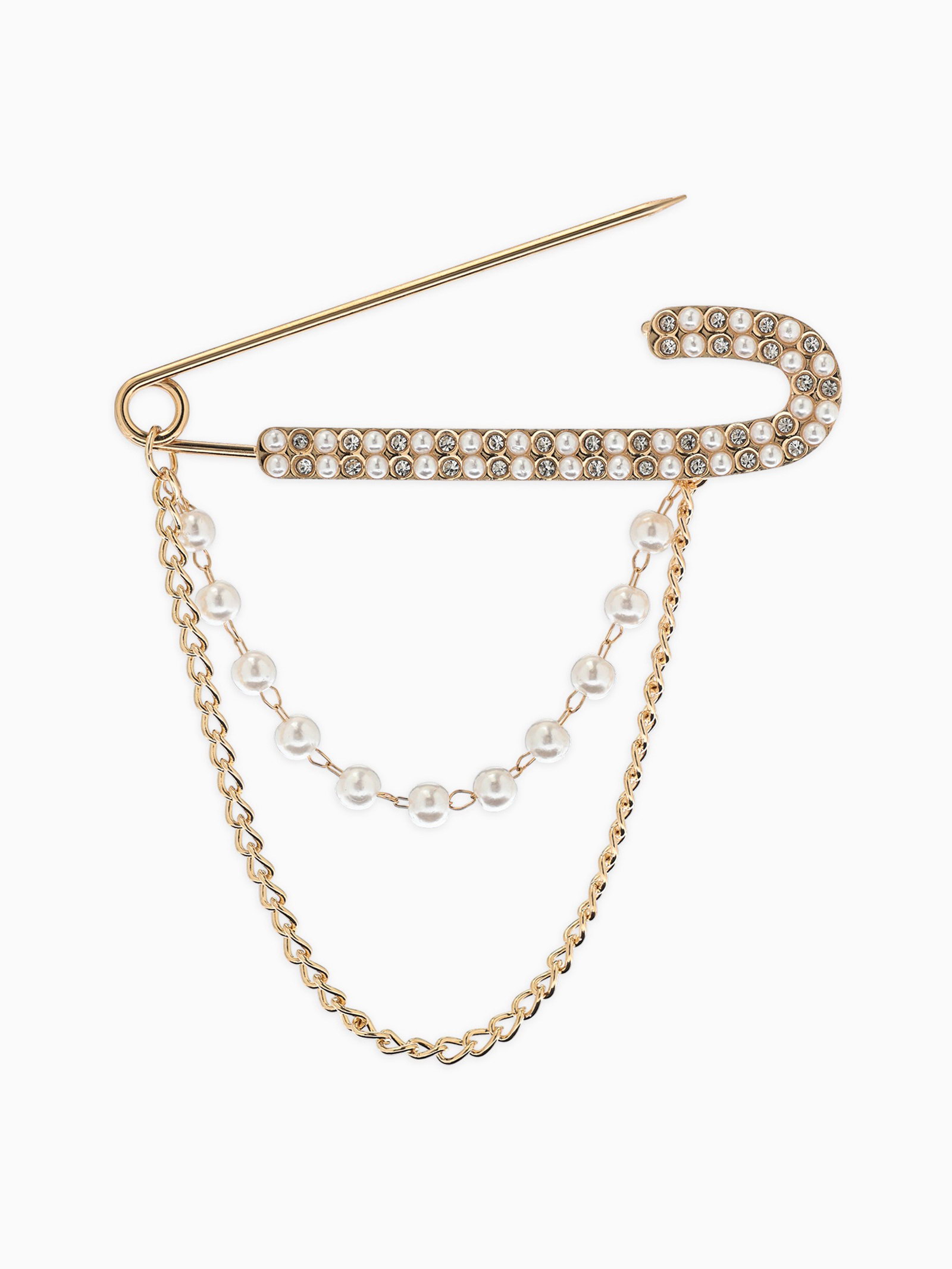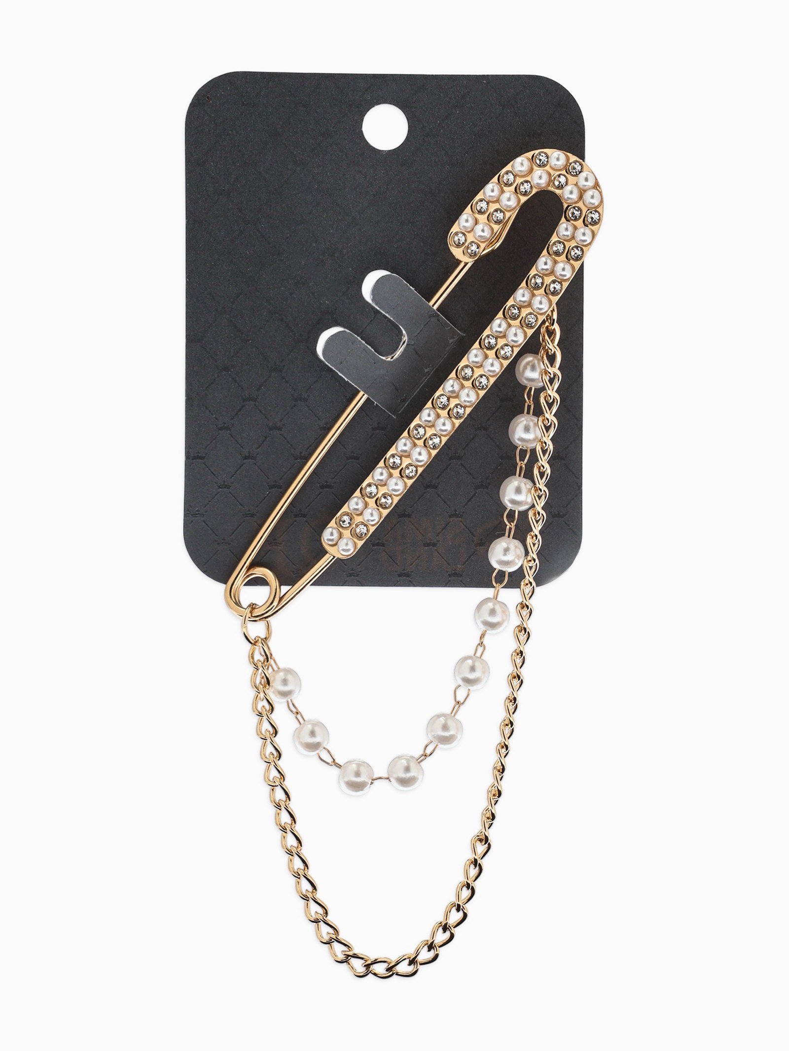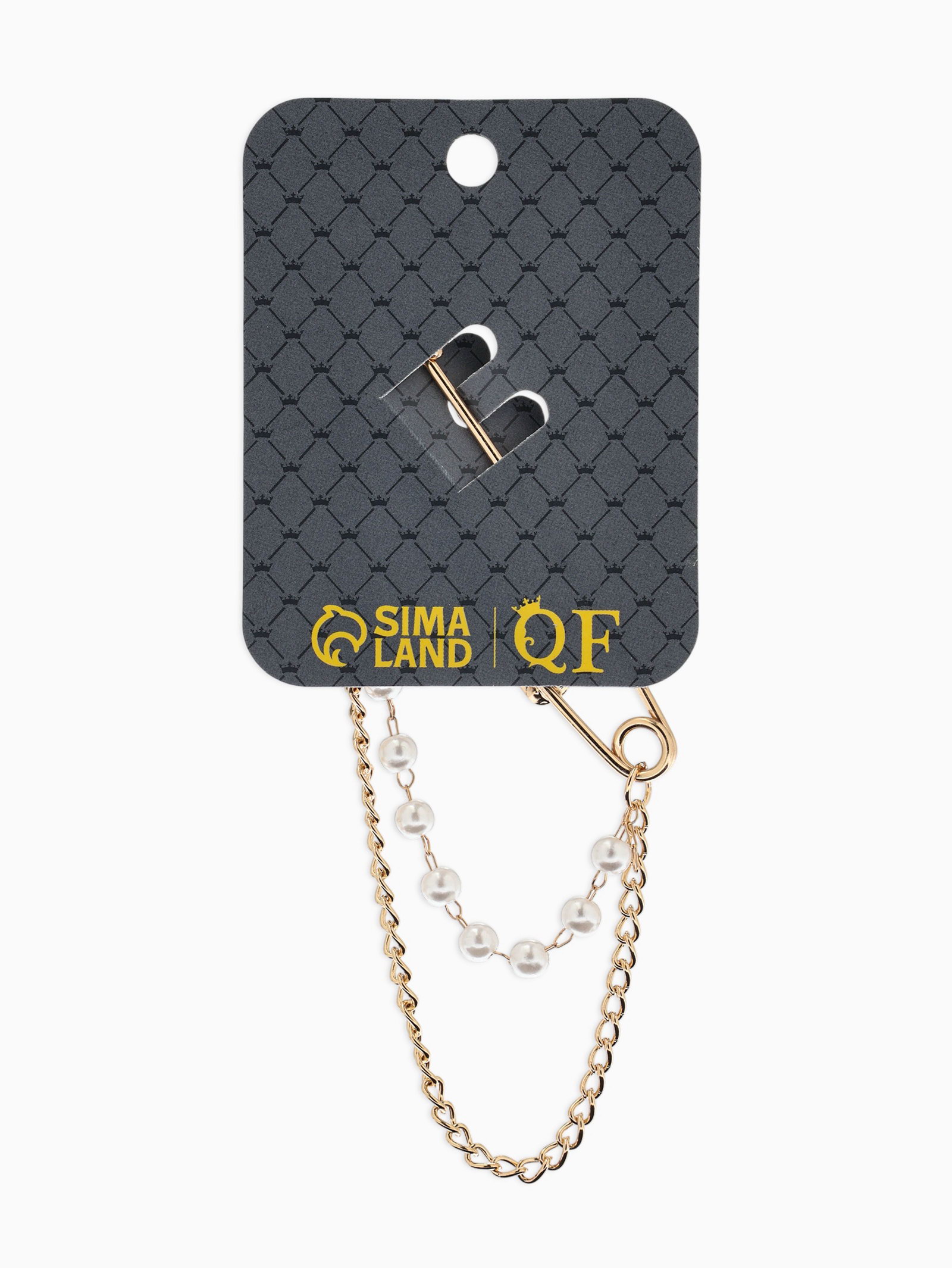 Булавка "Шик цепочки и жемчуга", в стразах, L=7.5 см, белая в золоте, 8x7.5x1 см., QF, Китай