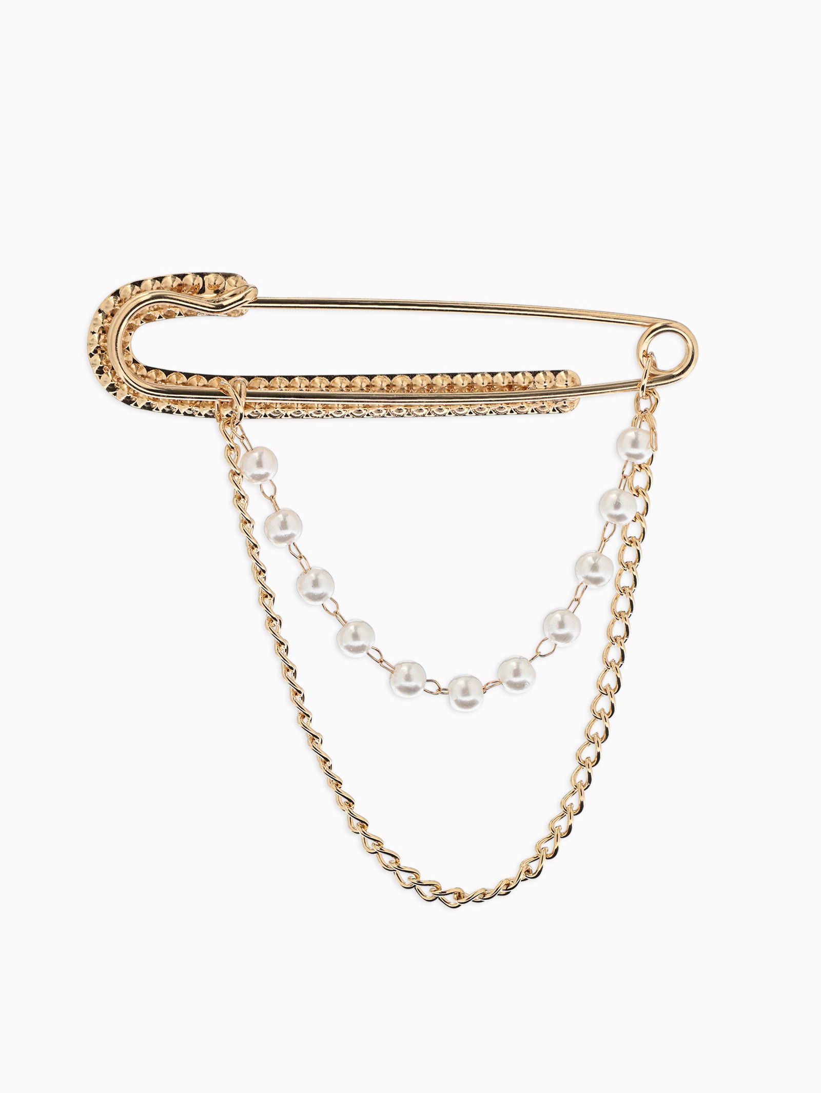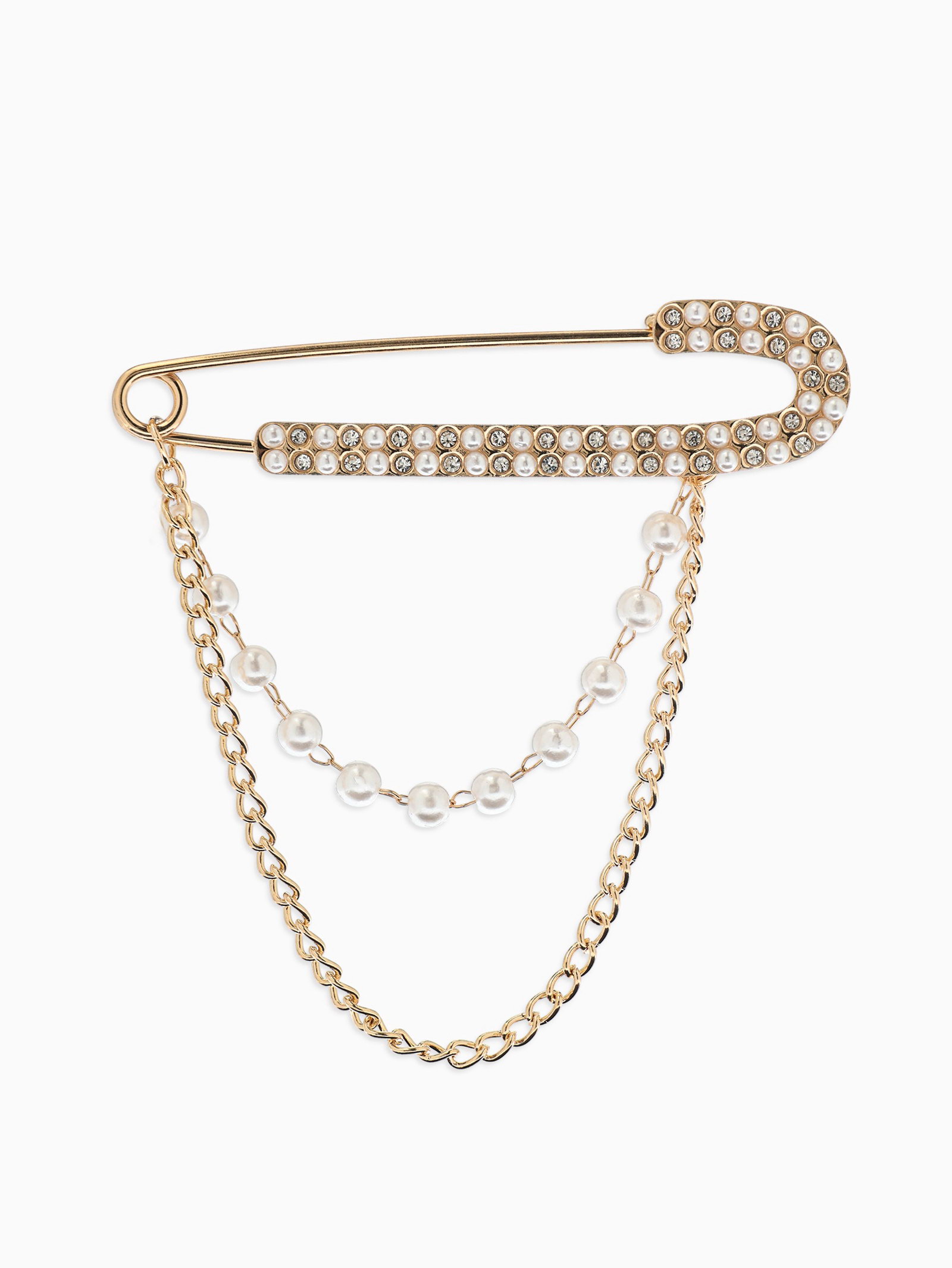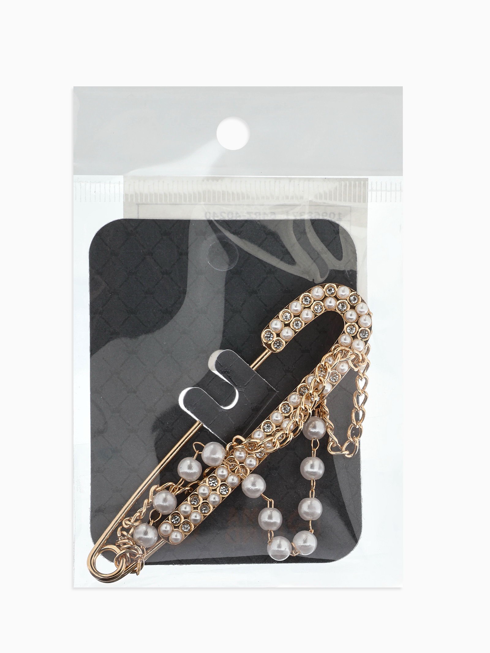 Булавка "Шик цепочки и жемчуга", в стразах, L=7.5 см, белая в золоте, 8x7.5x1 см., QF, Китай