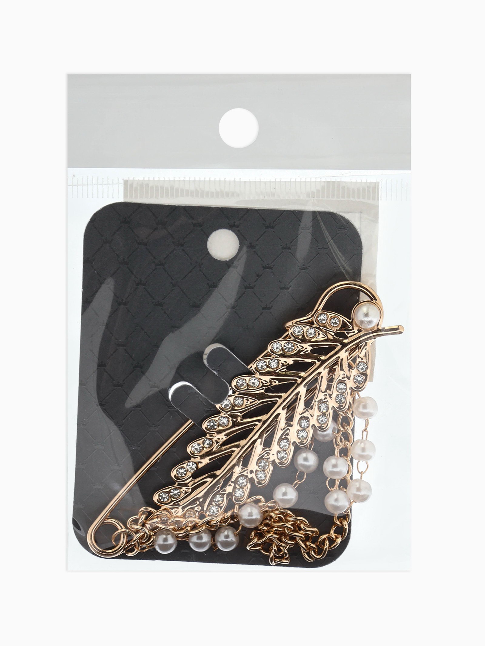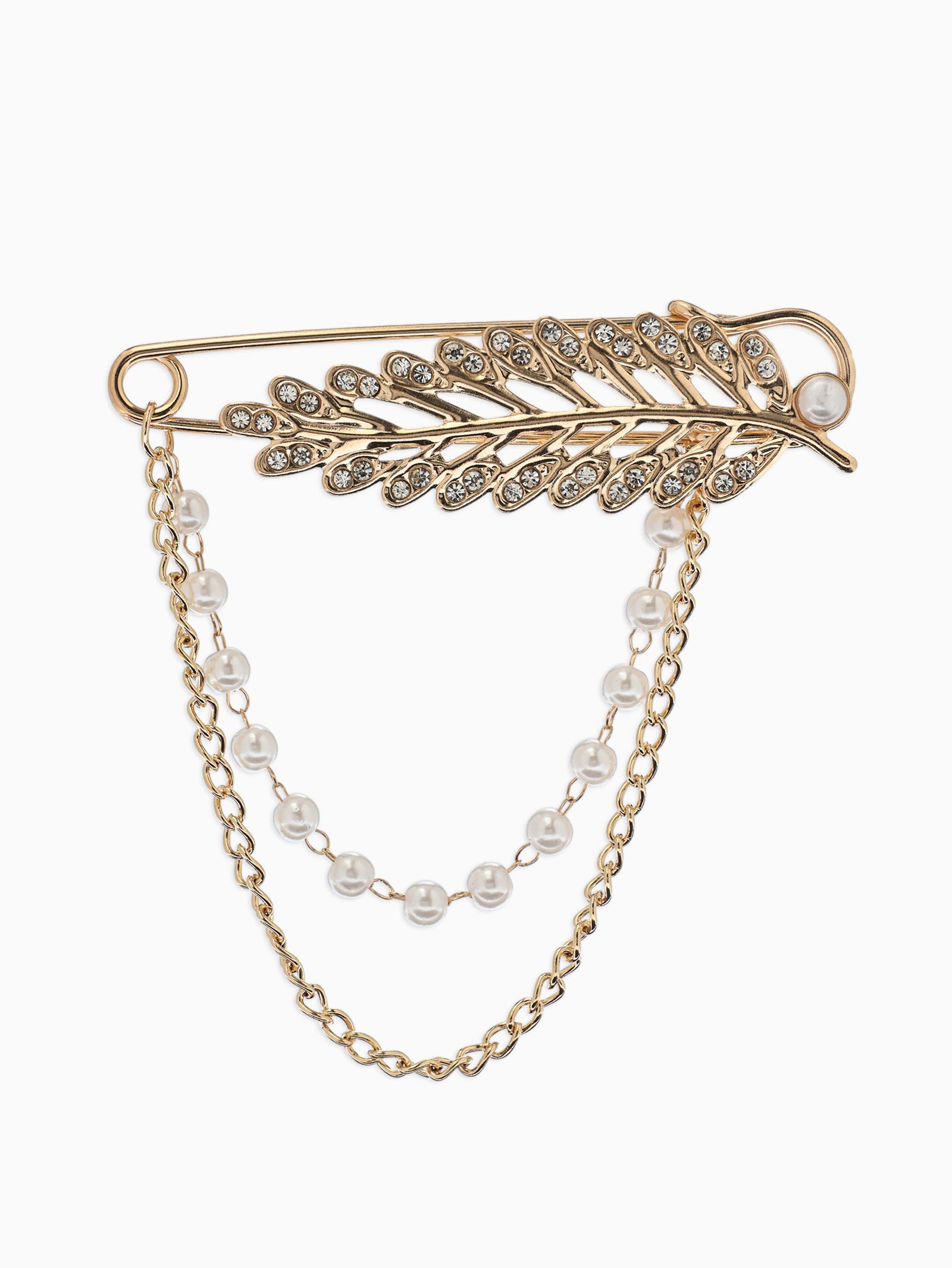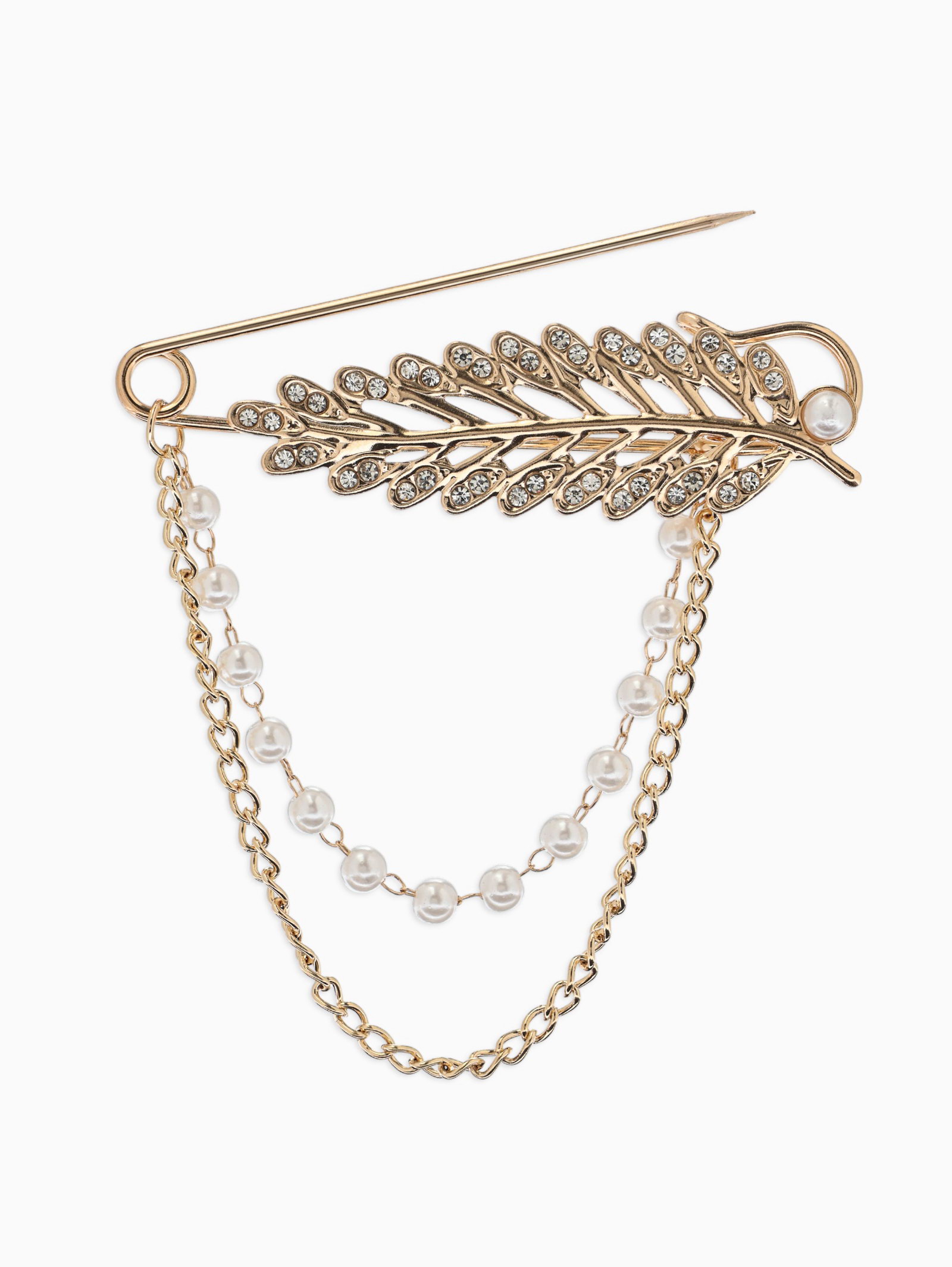 Булавка "Лист с цепочкой и жемчугом", в стразах, L=7.5 см, белая в золоте, 8x7.5x1 см., QF, Китай