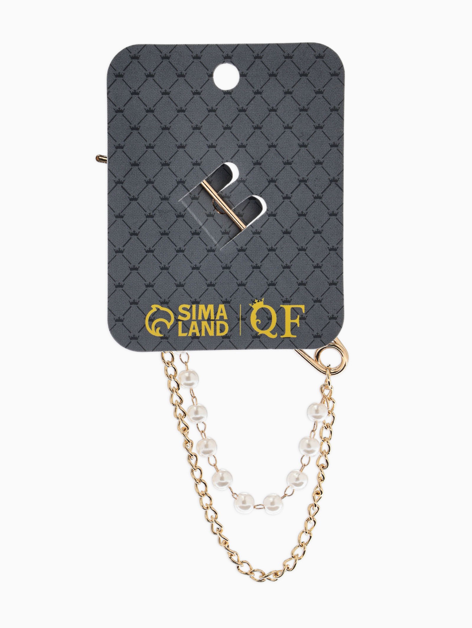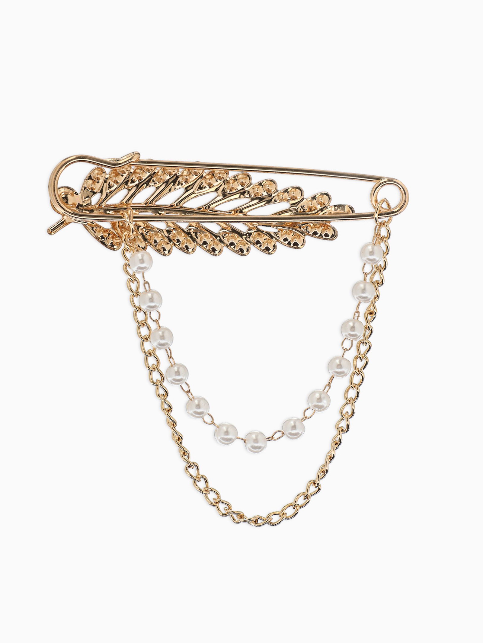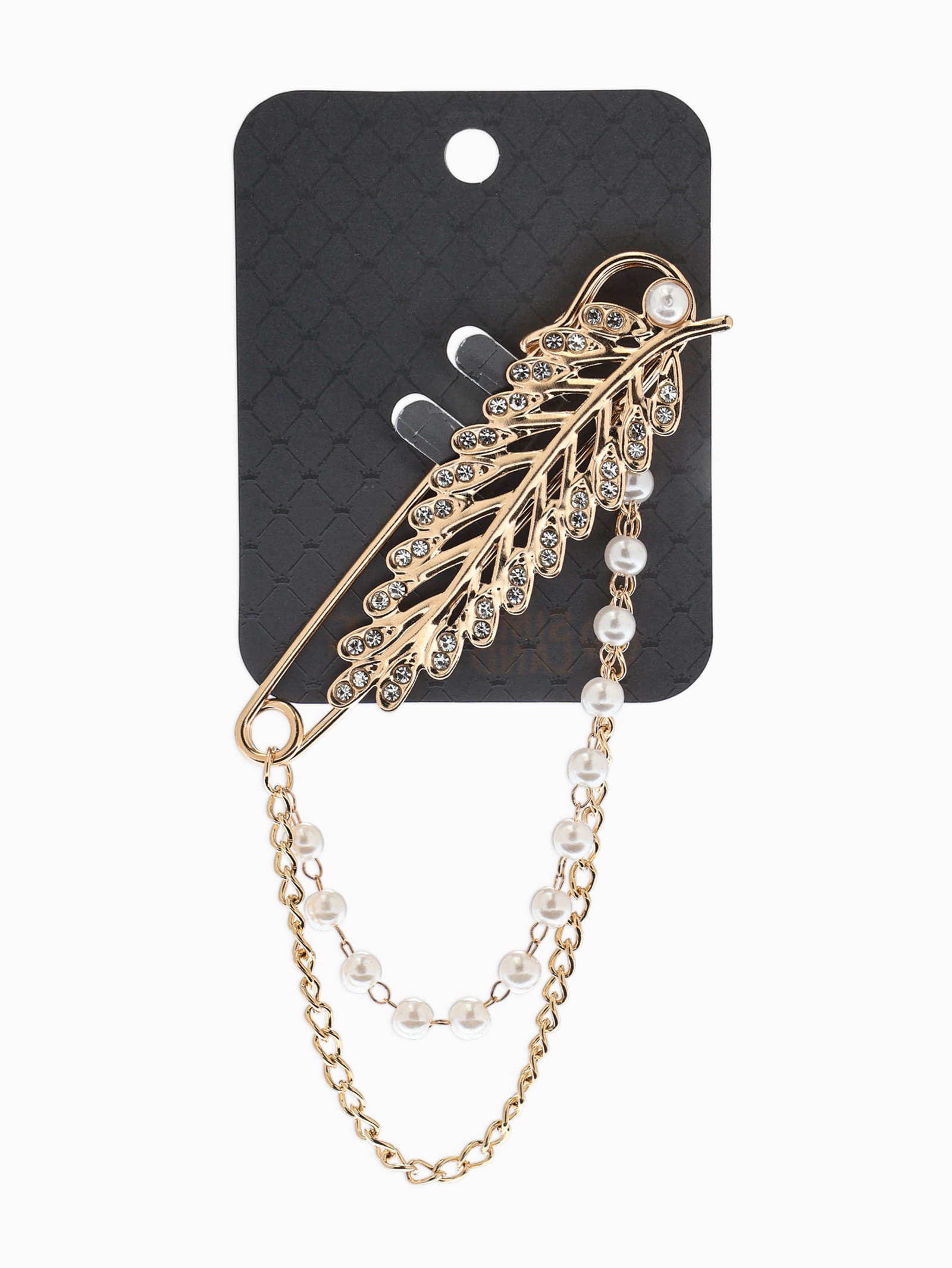 Булавка "Лист с цепочкой и жемчугом", в стразах, L=7.5 см, белая в золоте, 8x7.5x1 см., QF, Китай