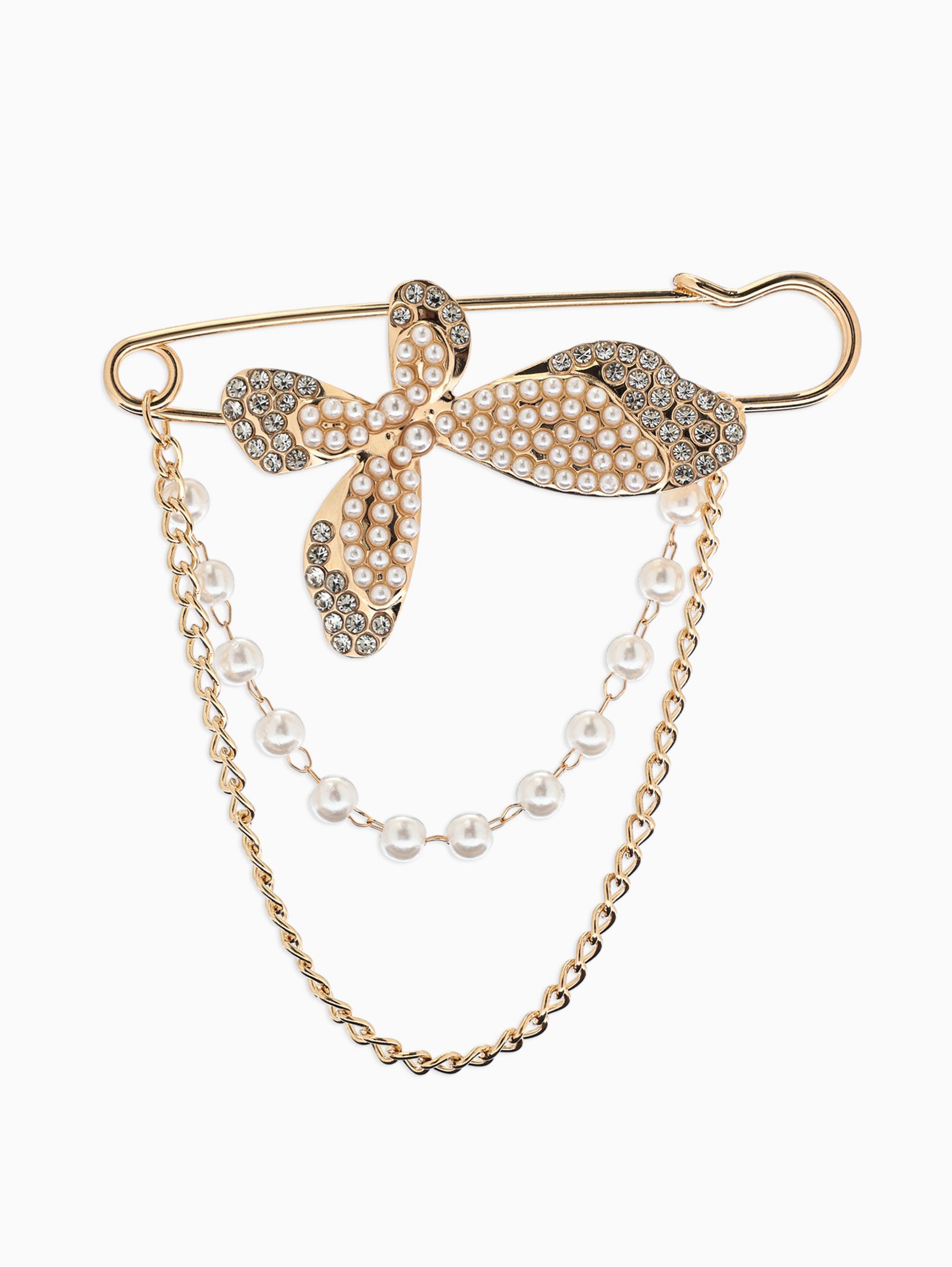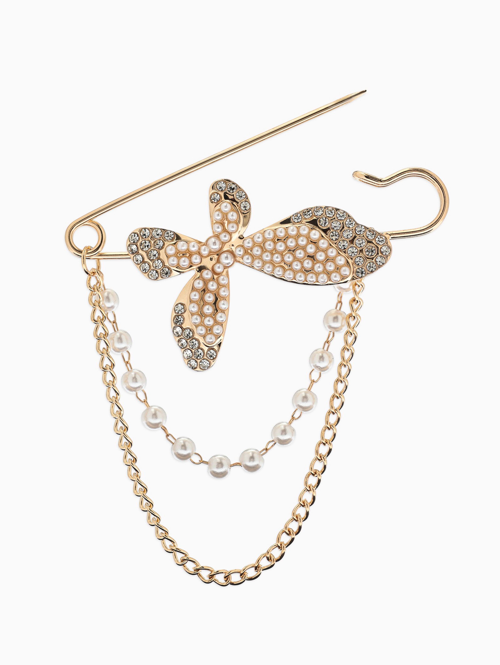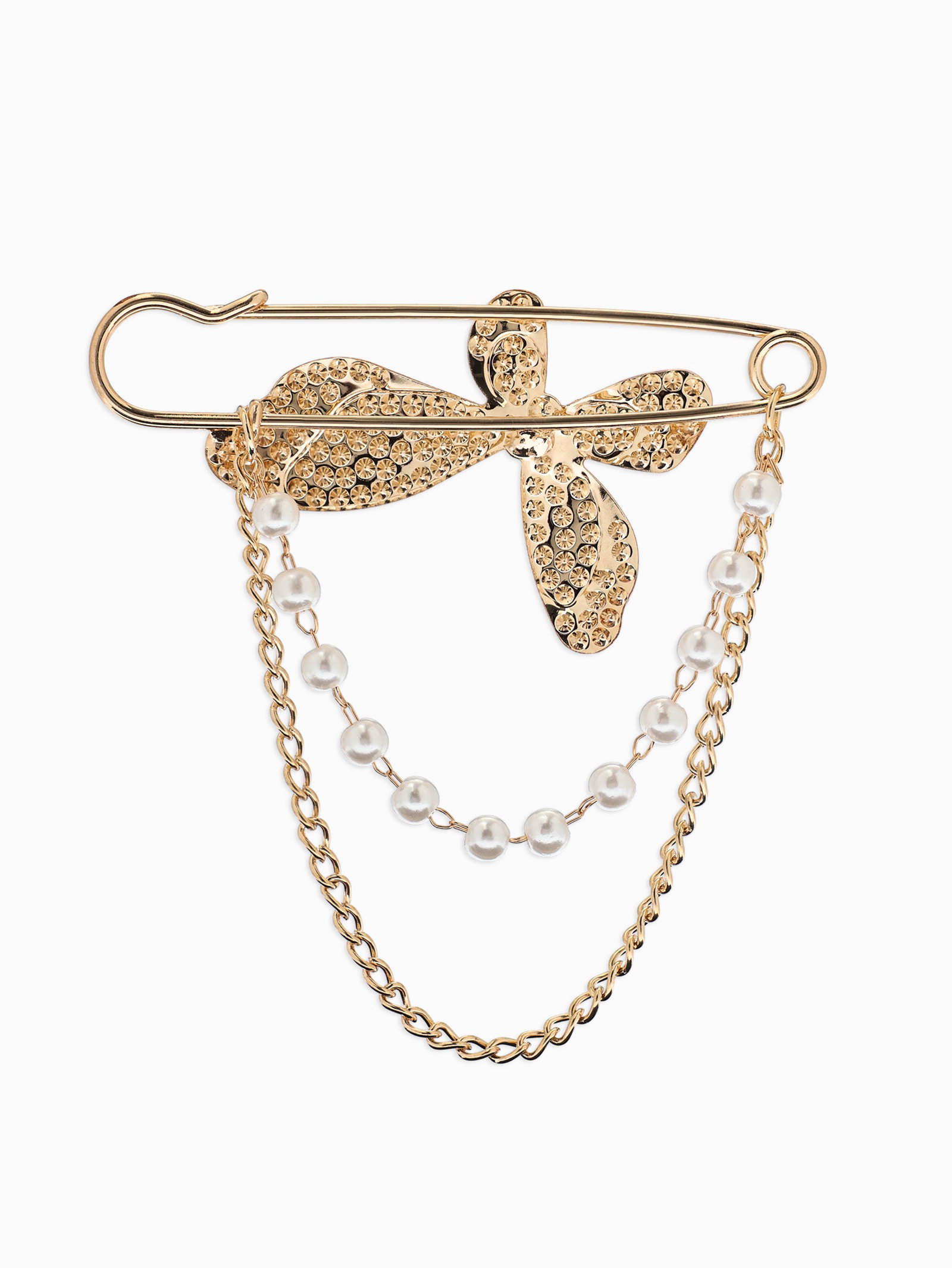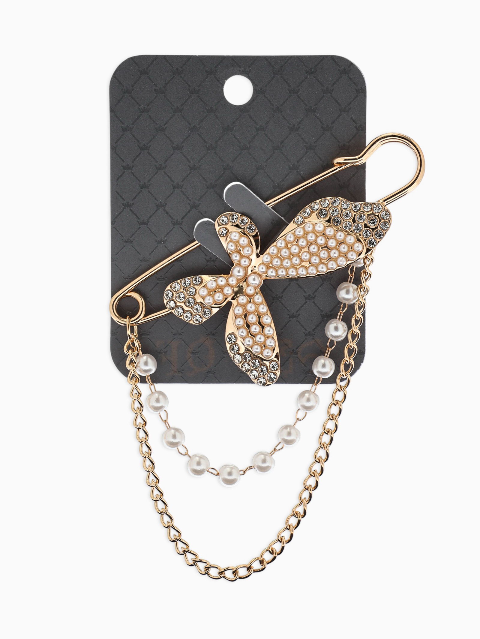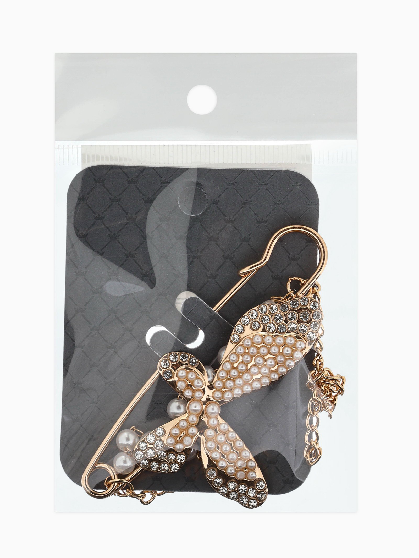 Булавка "Бабочка с цепочкой и жемчугом", в стразах, L=7.5 см, белая в золоте, 8x7.5x1 см., QF, Китай