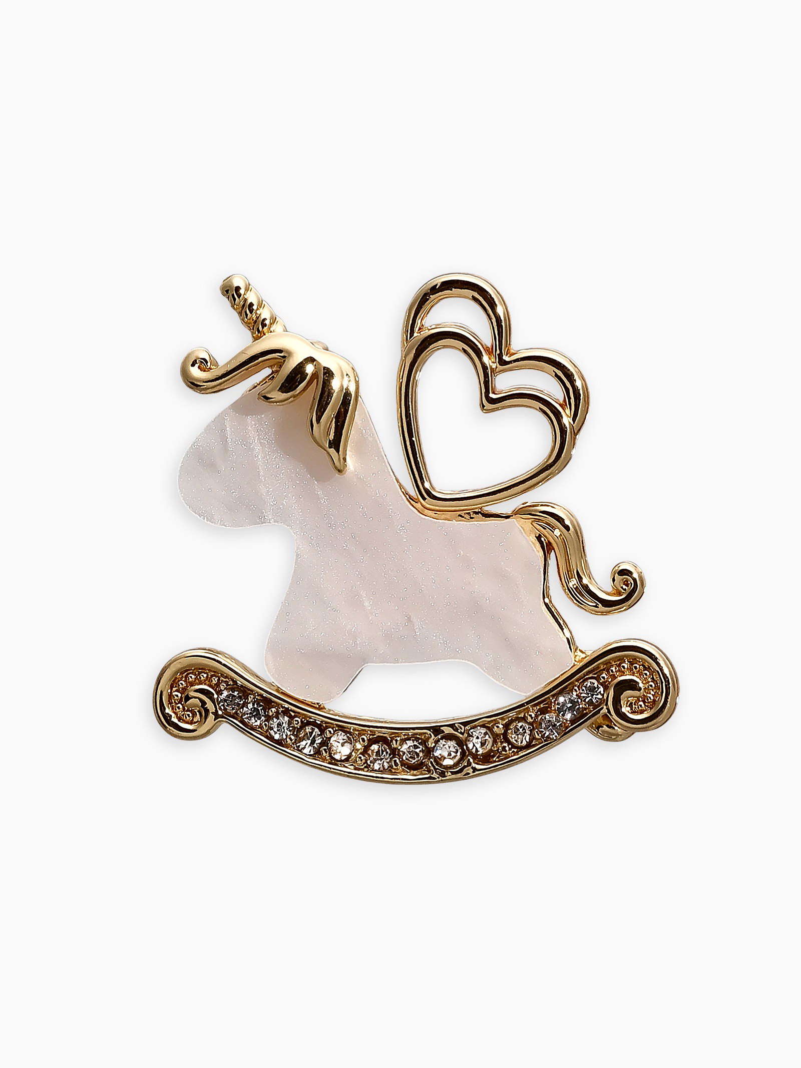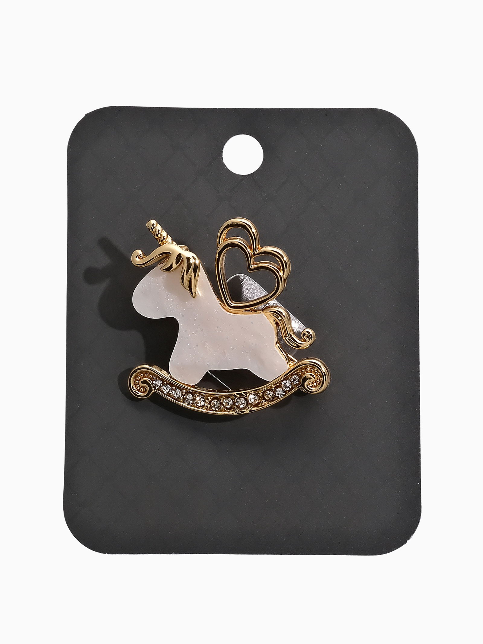 Брошь "Лошадка-Качалка. Единорог", белая в золоте, 3.5x3x0.8 см., QF, Китай
