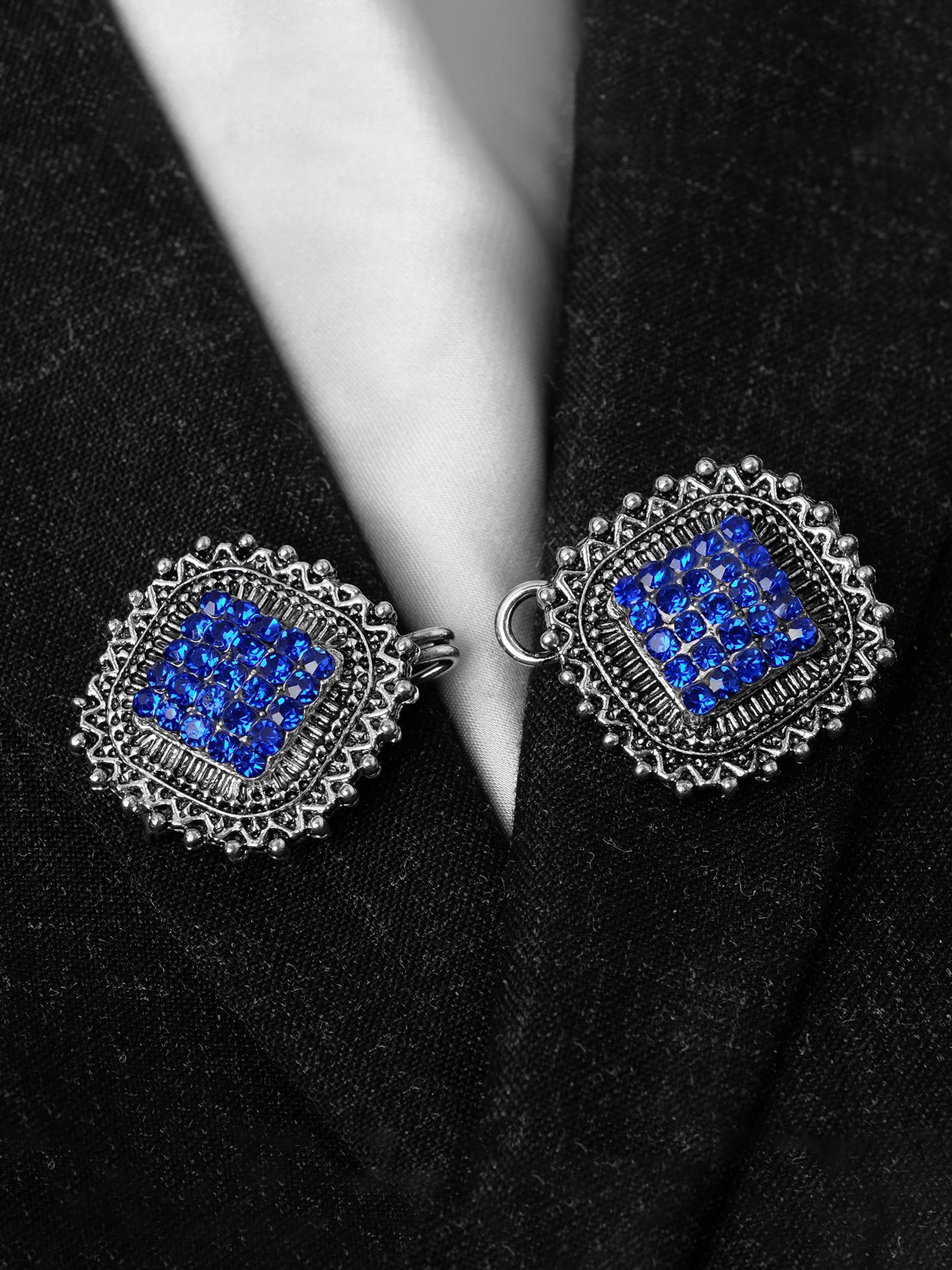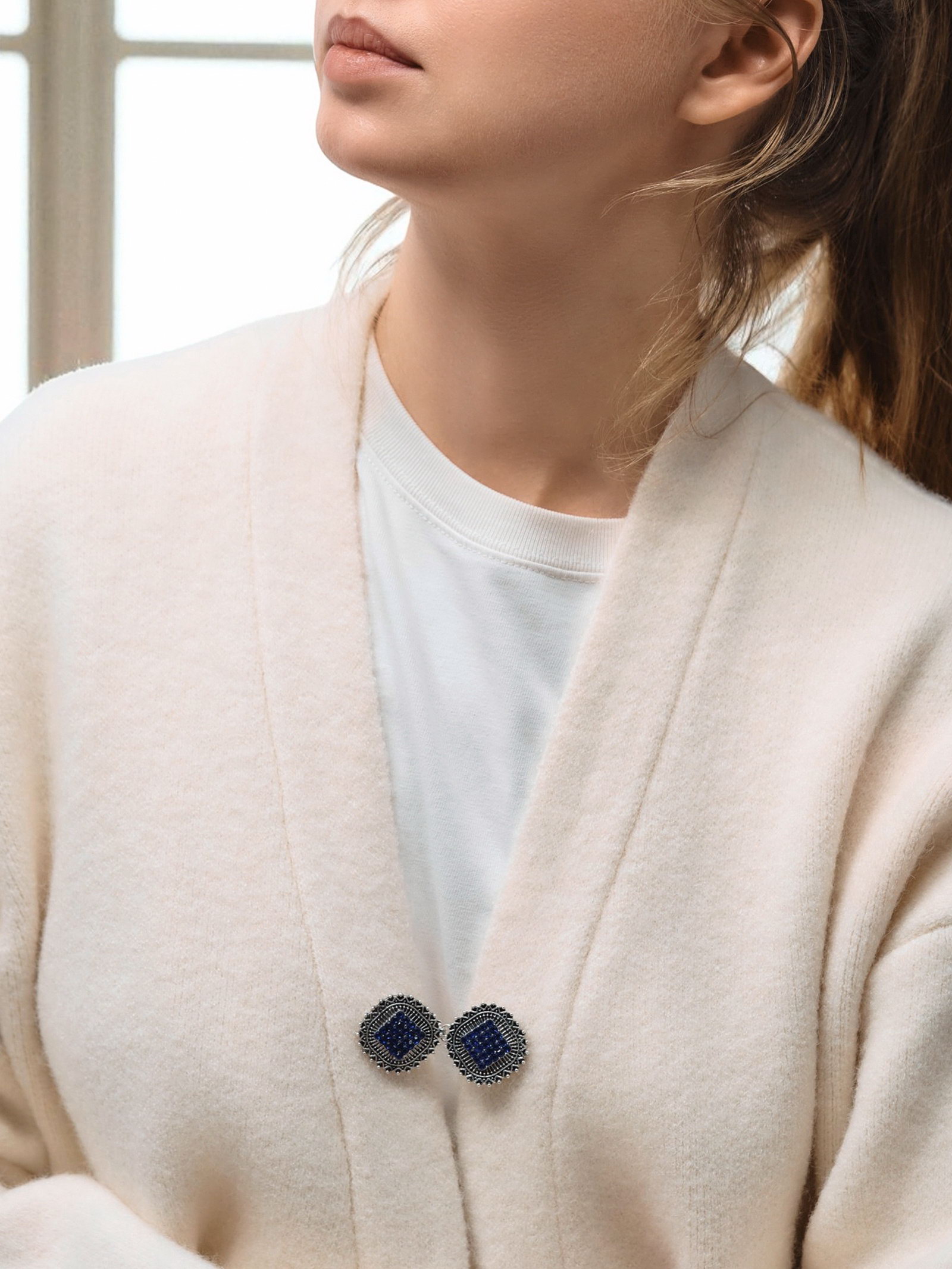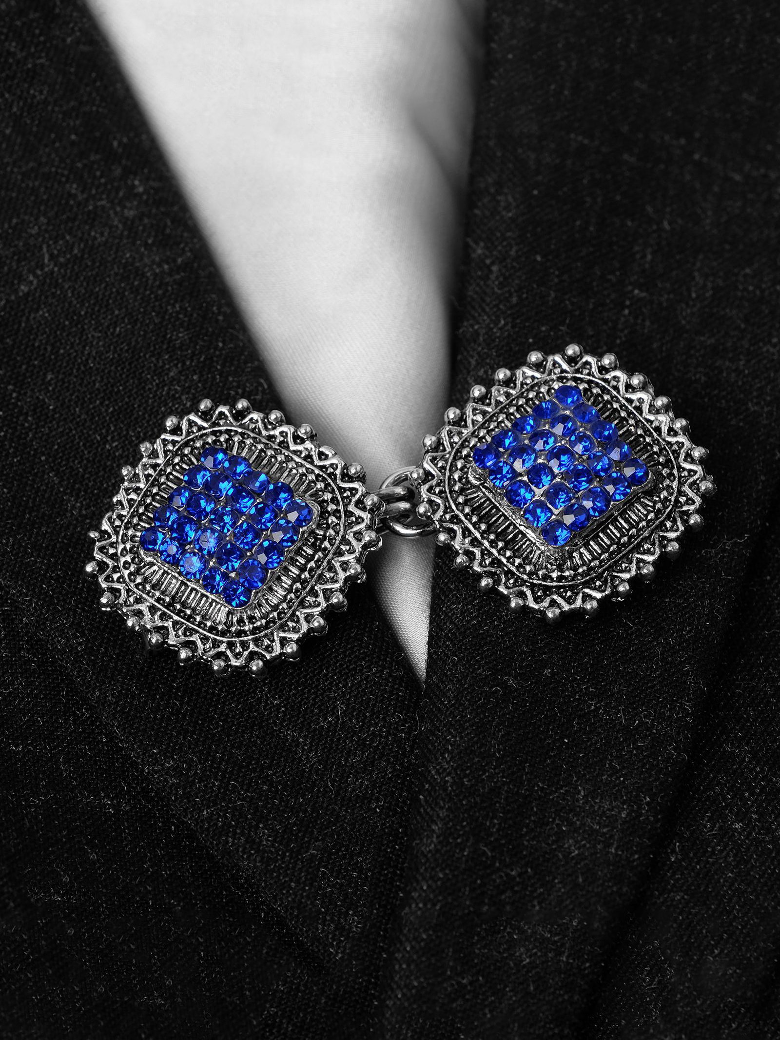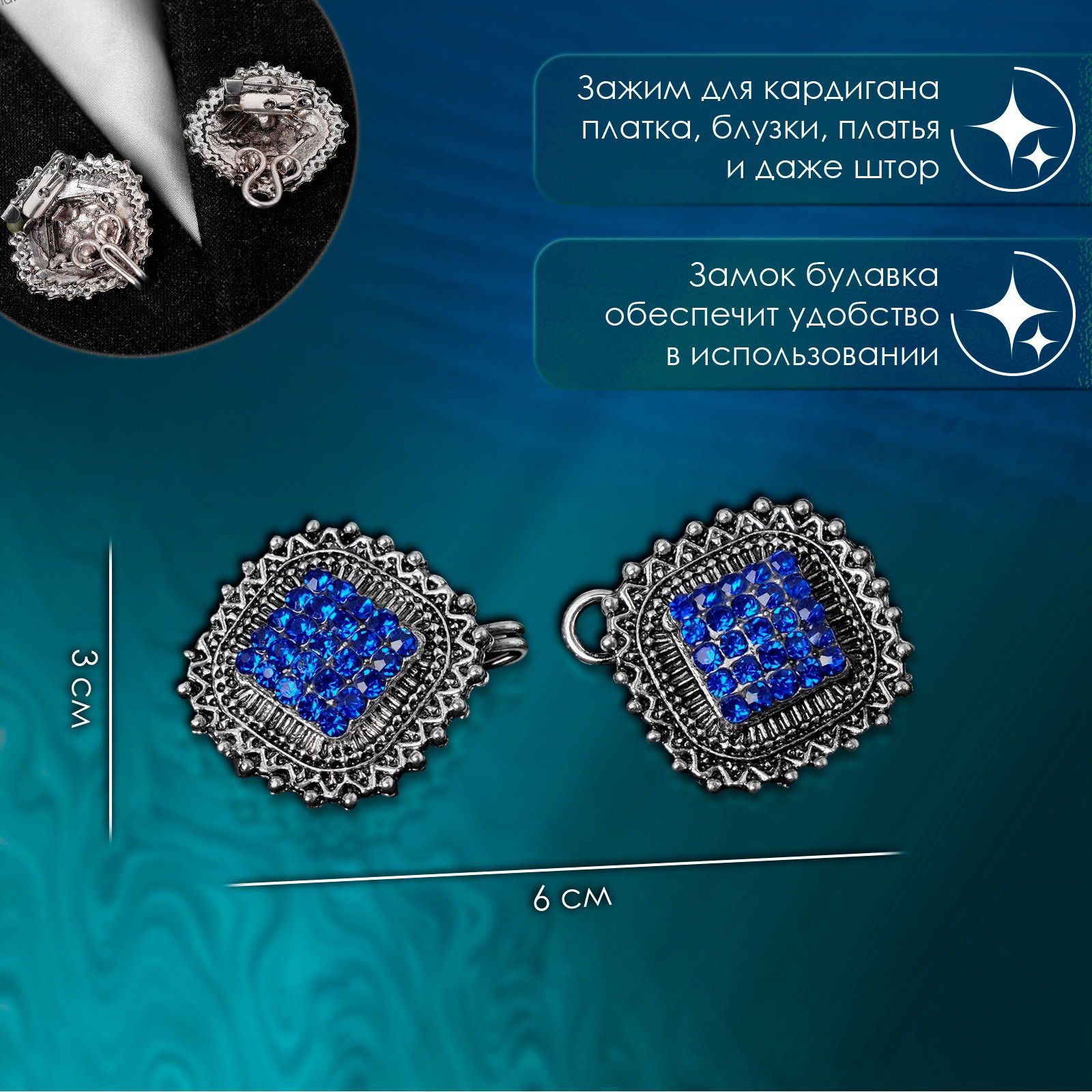 Зажим для кардигана "Квадраты", цвет синий в чернёном серебре, 3x6x1 см., QF, Китай