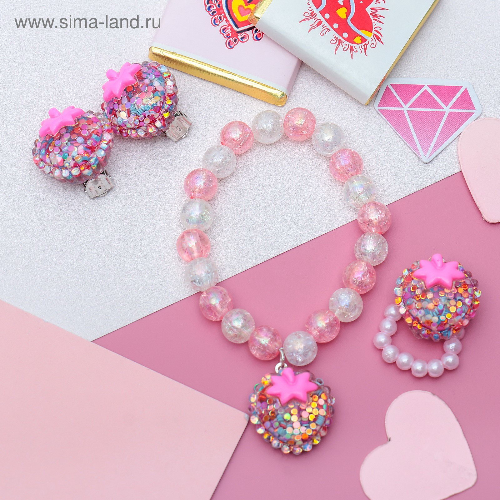 Набор детский 3 предмета: клипсы, кольцо, браслет, клубника, блёстки, бело-розовый, 1.2x4x1.2 см., Выбражулька, Китай