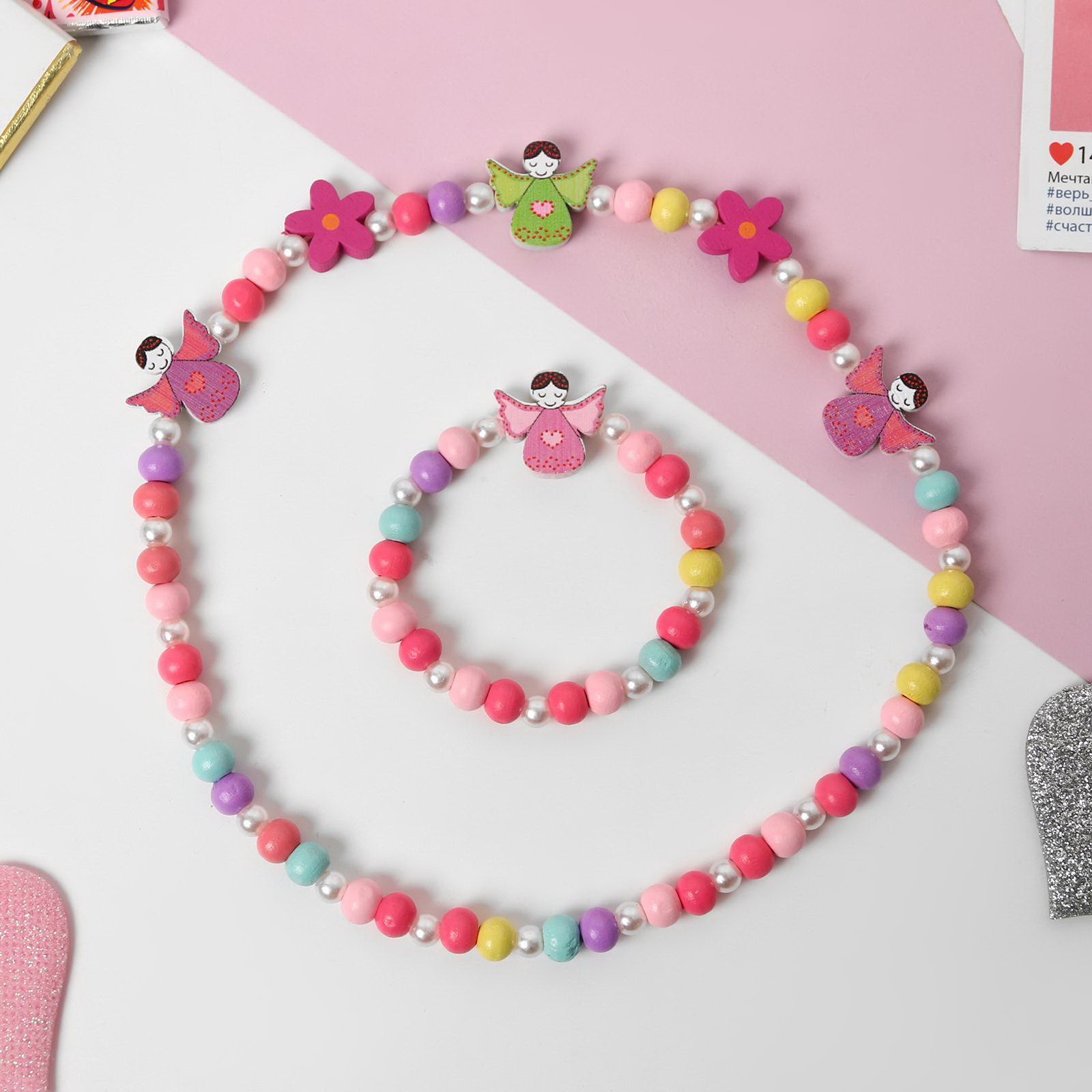 Набор детский 2 предмета: бусы, браслет ангел, цветной, 4x35x1.5 см., Выбражулька, Китай