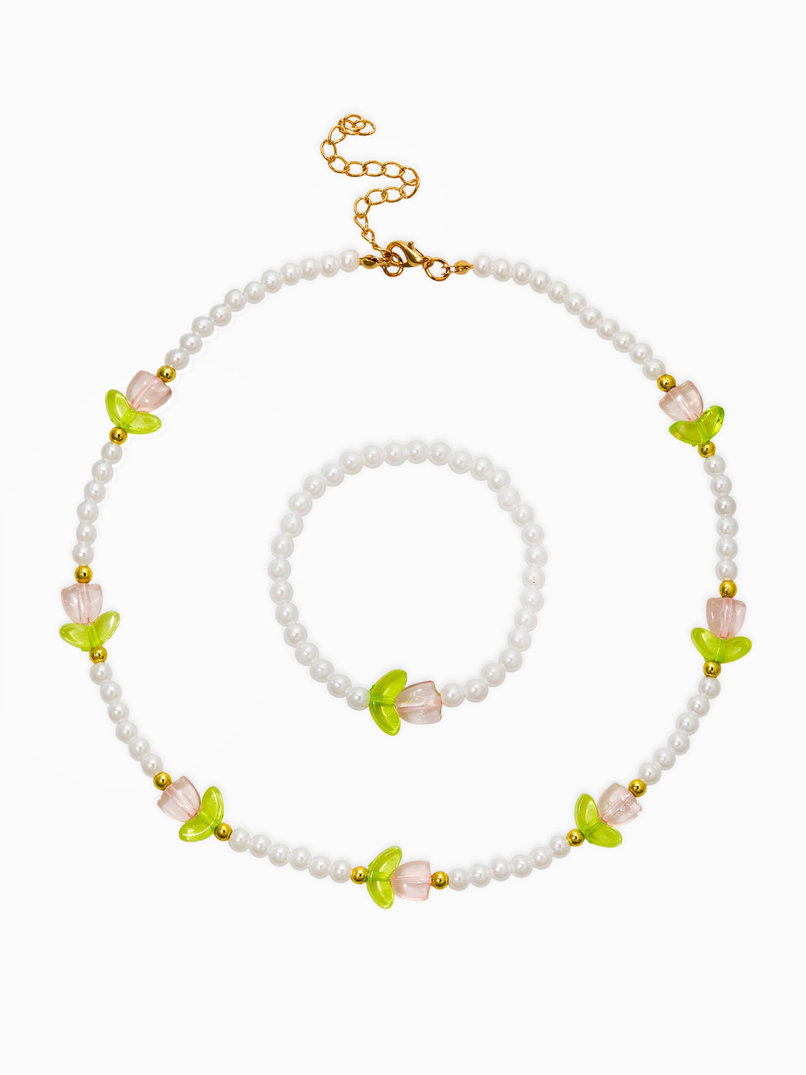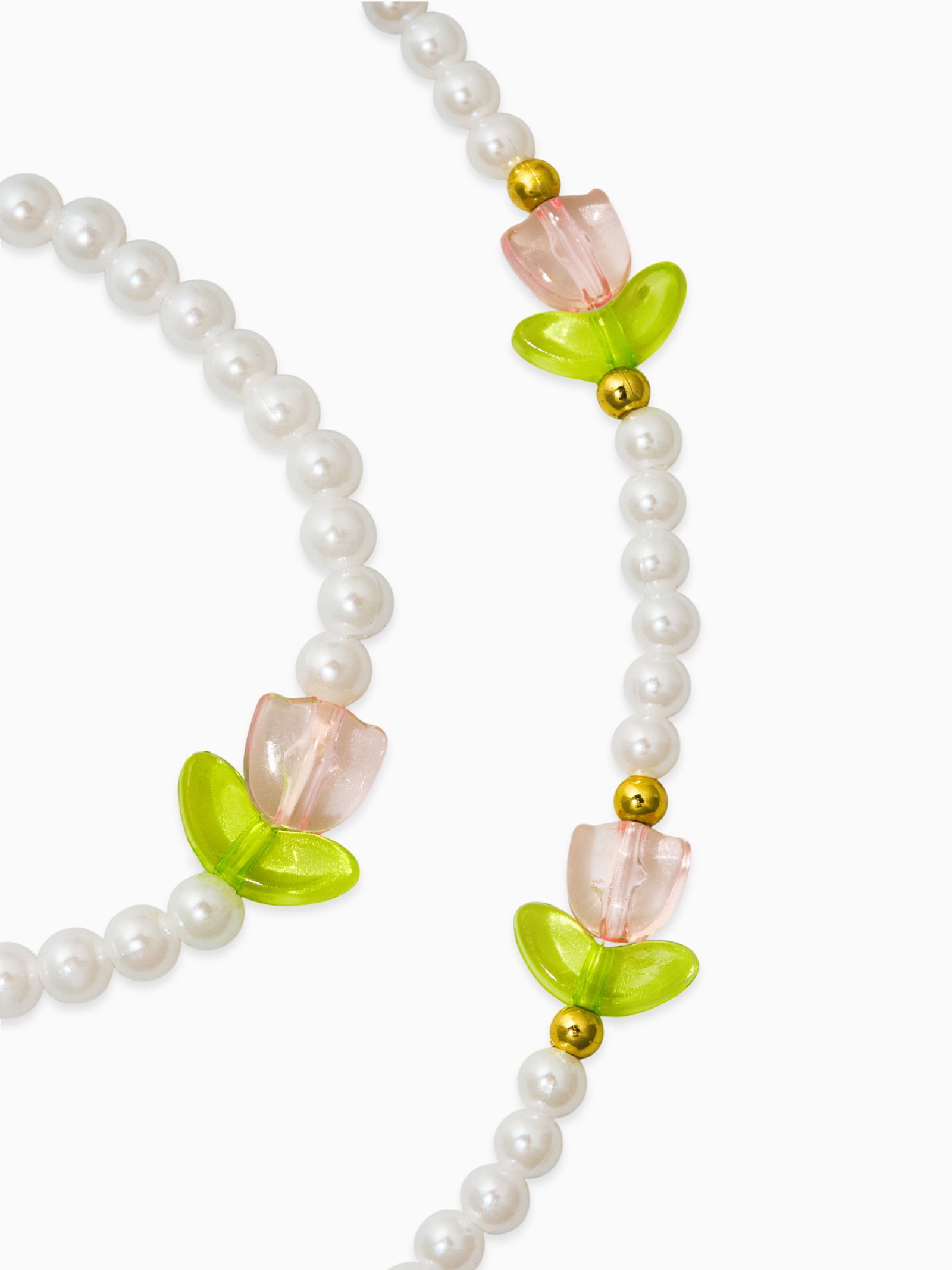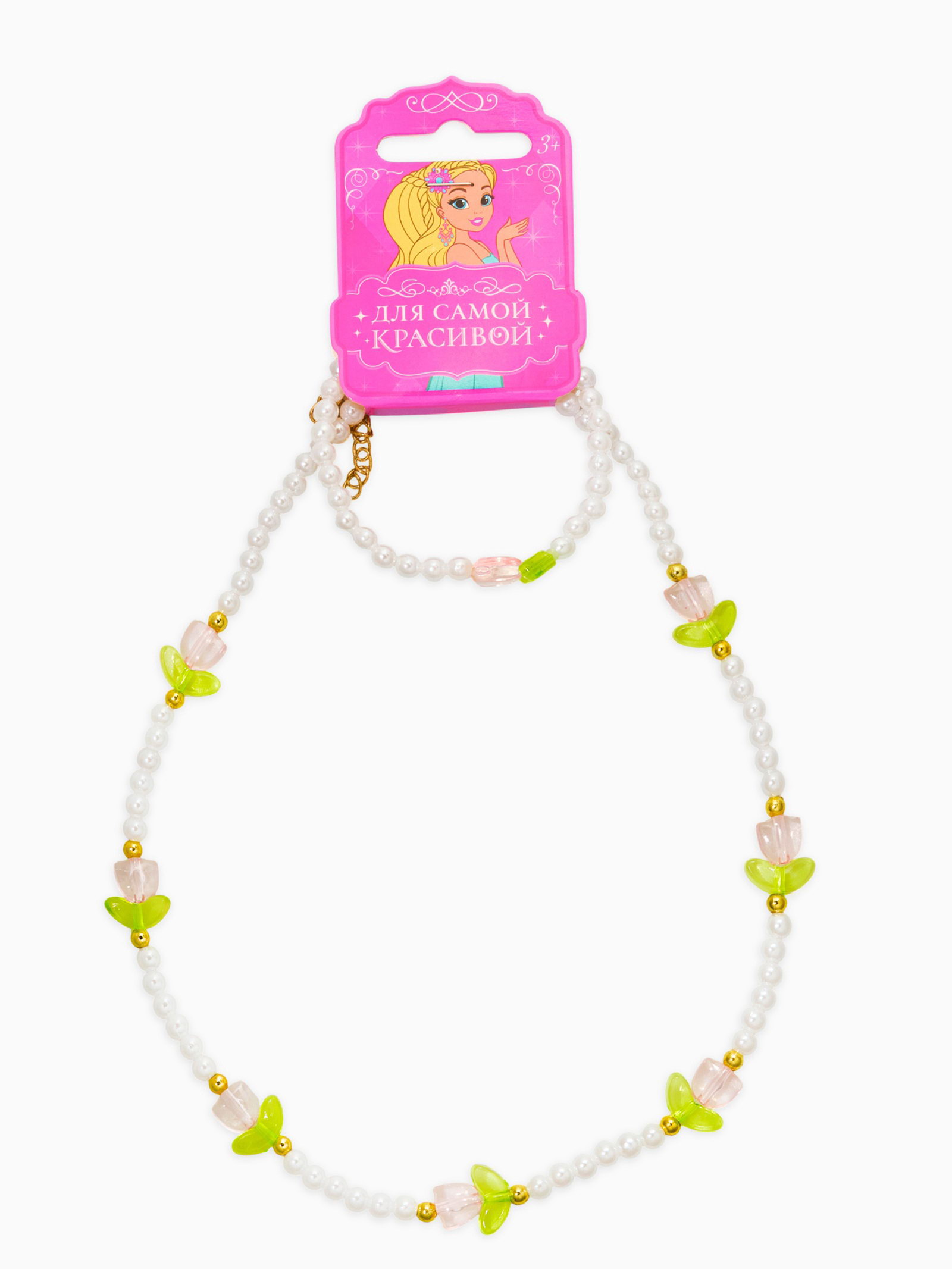 Комплект детский тюльпаны, жемчуг, 2 пр-та бусы, браслет, цвет бело-розовый, 1.3x20x0.4 см., Выбражулька, Китай