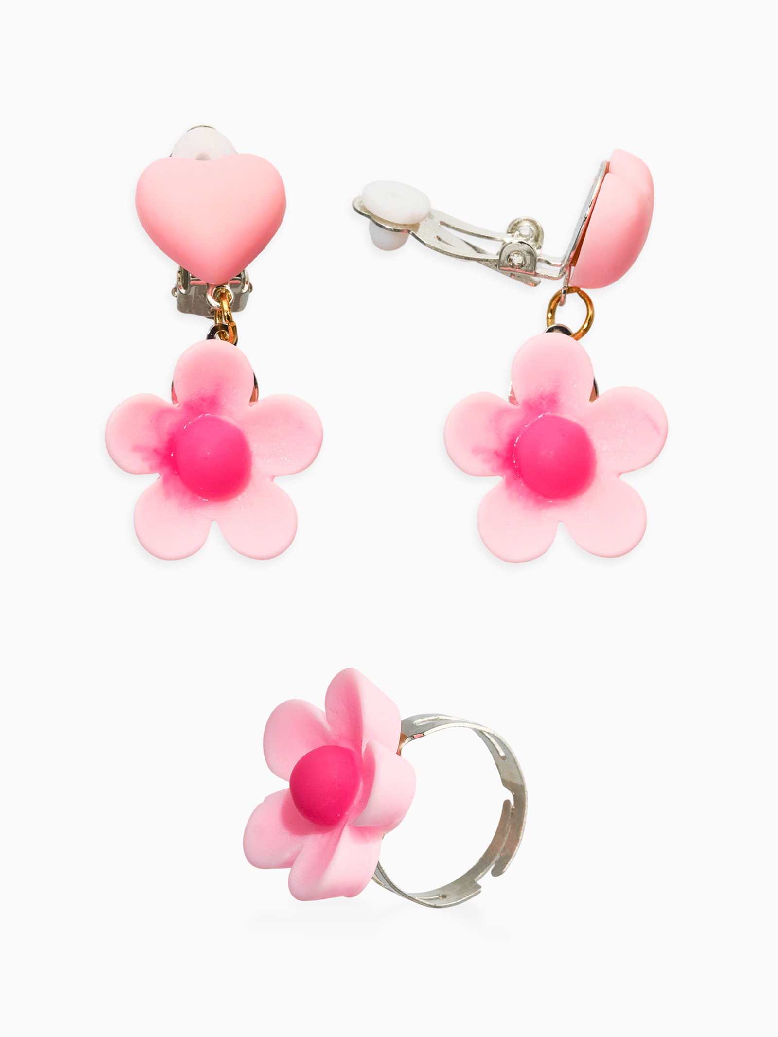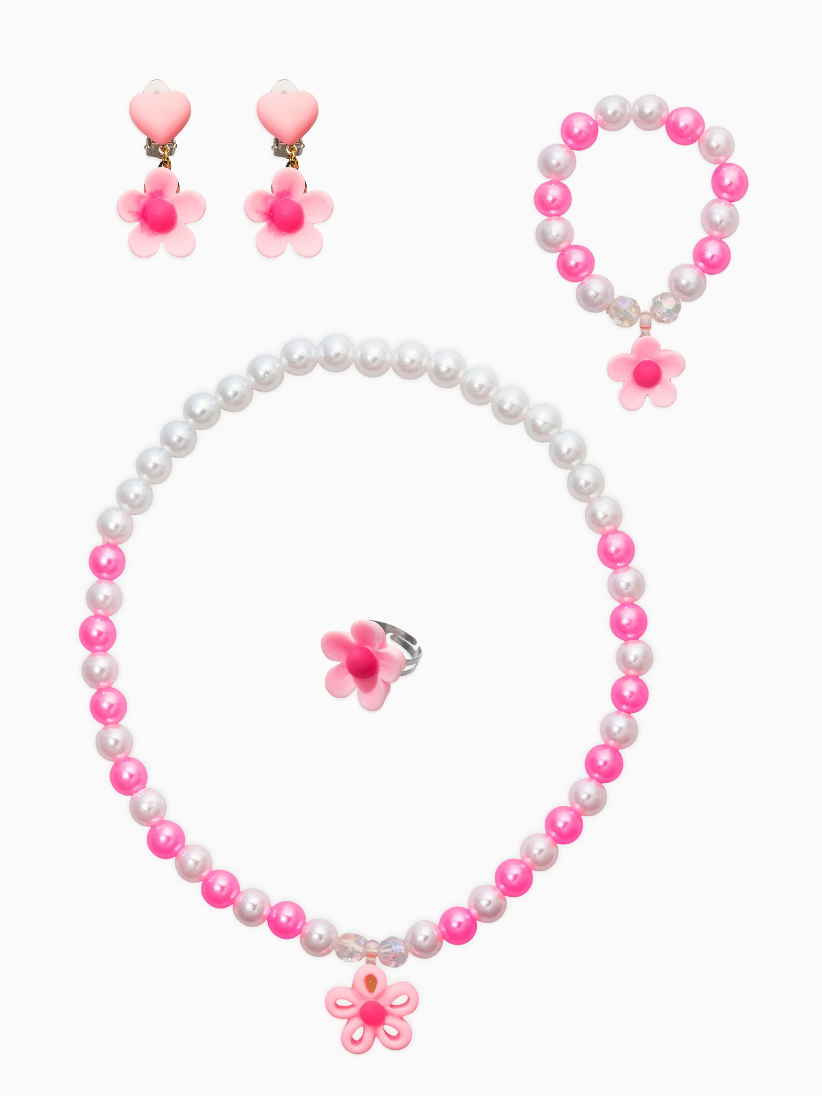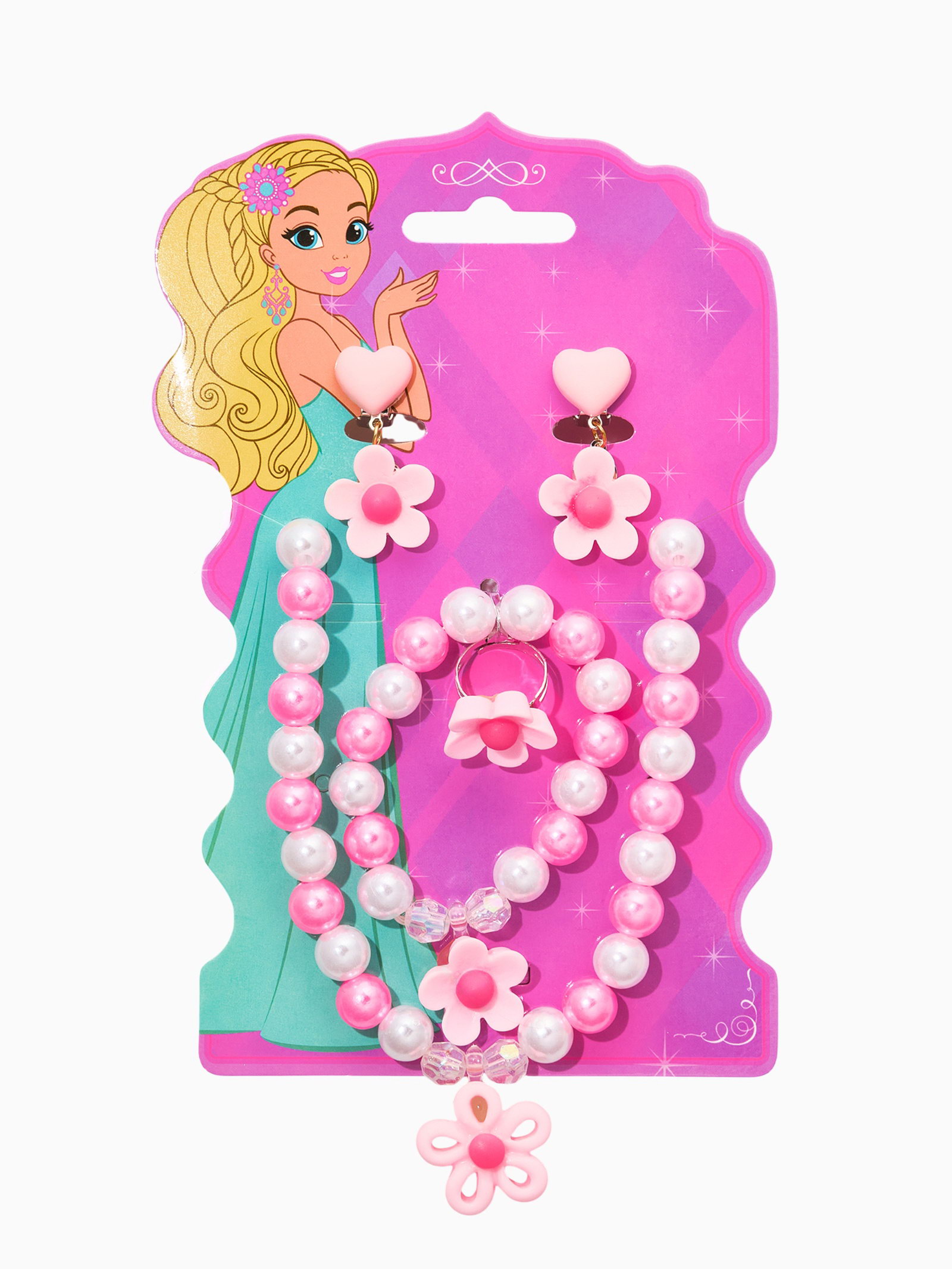 Набор детских украшений "Выбражулька. Цветок", 4 предмета: клипсы, кольцо, бусы, браслет, розовый, белый, 6x40x2 см., Выбражулька, Китай
