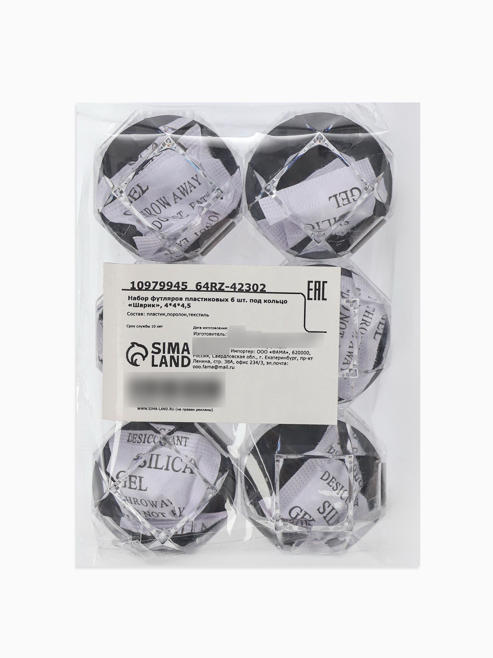 Набор футляров под кольцо 6 шт. "Шарик", пластик, 4x4x4.5 см, вставка чёрная, 4x4x4.5 см., Китай