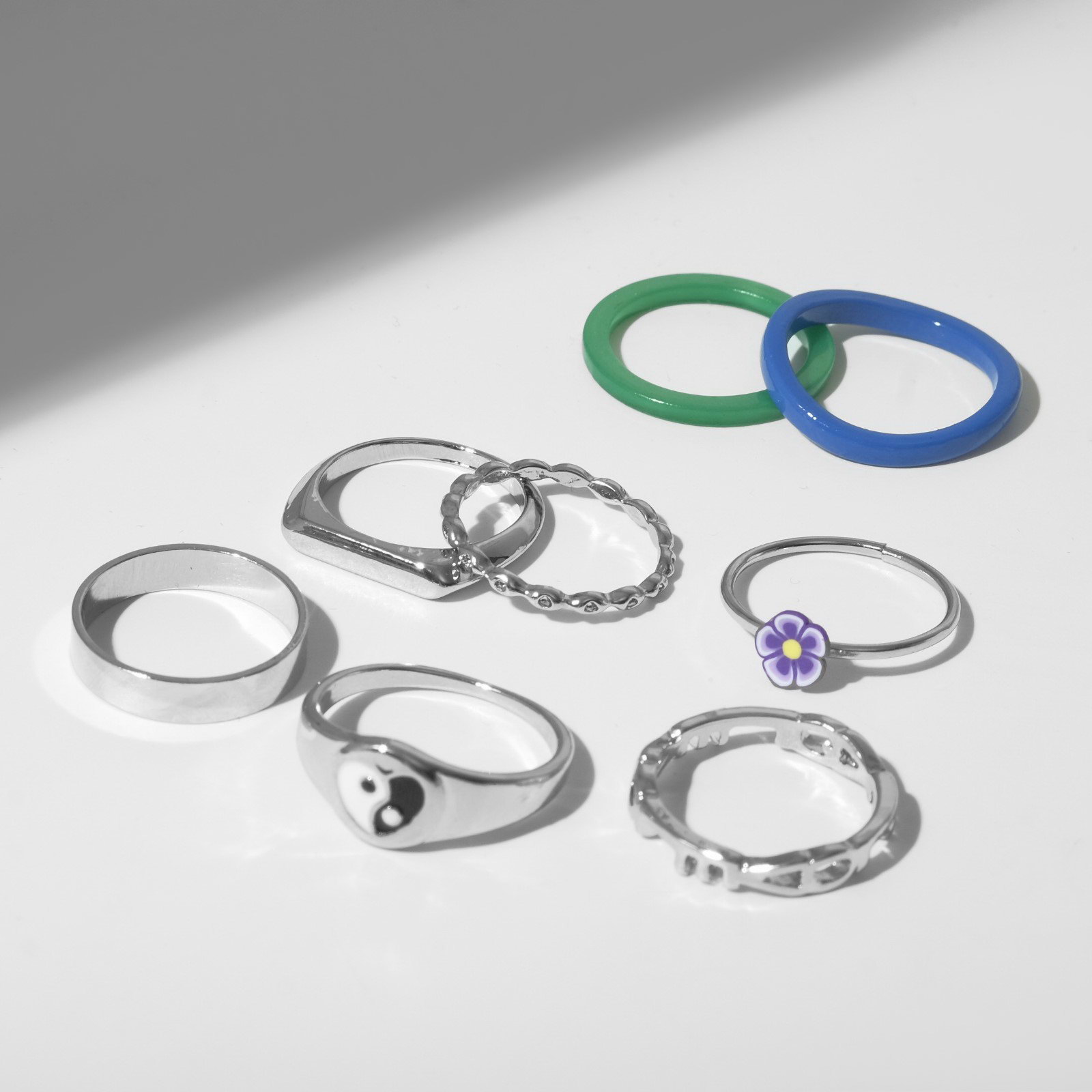 Кольцо набор 8 штук "Мечта" инь-ян, цветной с серебром, размер МИКС, 1.7x1.7x0.5 см., QF, КИТАЙ
