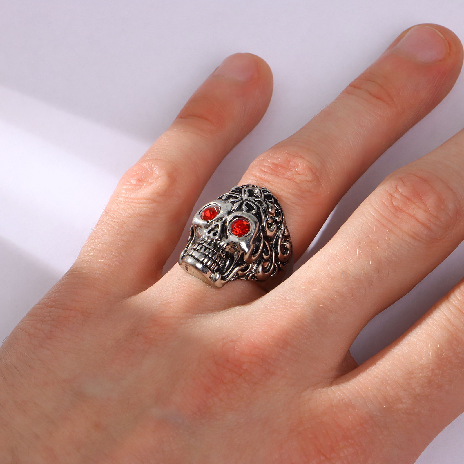 Тематика праздника: 8 Марта, День рождения, Новый год, Универсальная тематика Вид: Кольцо, Кольцо Тематика: Готическая, Хеллоуин Размер упаковки: 3 x 2.7 x 7 см. Вставка/Подвеска: Стекло Длина, см: 2 Материал основания: Металл Для кого: Для мужчины Возраст: Для взрослых Символ года: Нет Тематика подарка: Бижутерия Вид упаковки: Пакет Вид упаковки: Пакет tnved: 7117190000 Размер: 20 см Цвет: Красный Цвет фурнитуры: Чернёное серебро Набор: Нет Материал основы: Металл Цвет вставки: Красный Откройте для себя кольцо, которое станет ярким акцентом в вашем образе уникальный перстень с изображением черепа и красными глазами. Это украшение в чернёном серебре размером 20 идеально подойдет для мужчин, которые ценят оригинальность и хотят выделиться из толпы. Череп, как символ силы и независимости, делает это кольцо не только стильным, но и значимым. Яркие красные стеклянные вставки в глазах придают ему особую выразительность, а чернёное серебро добавляет брутальности и элегантности.