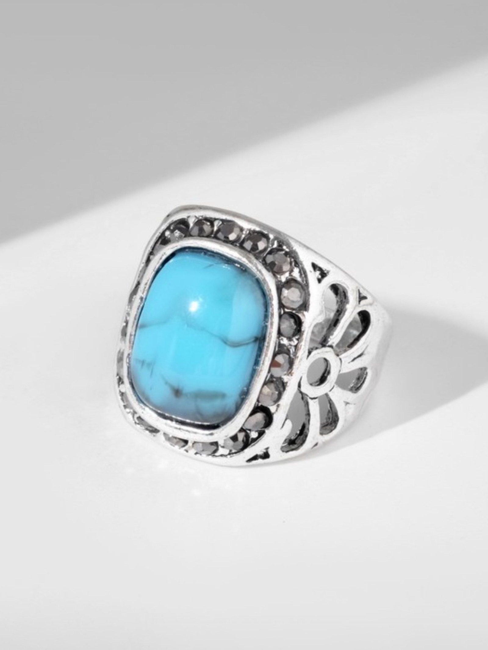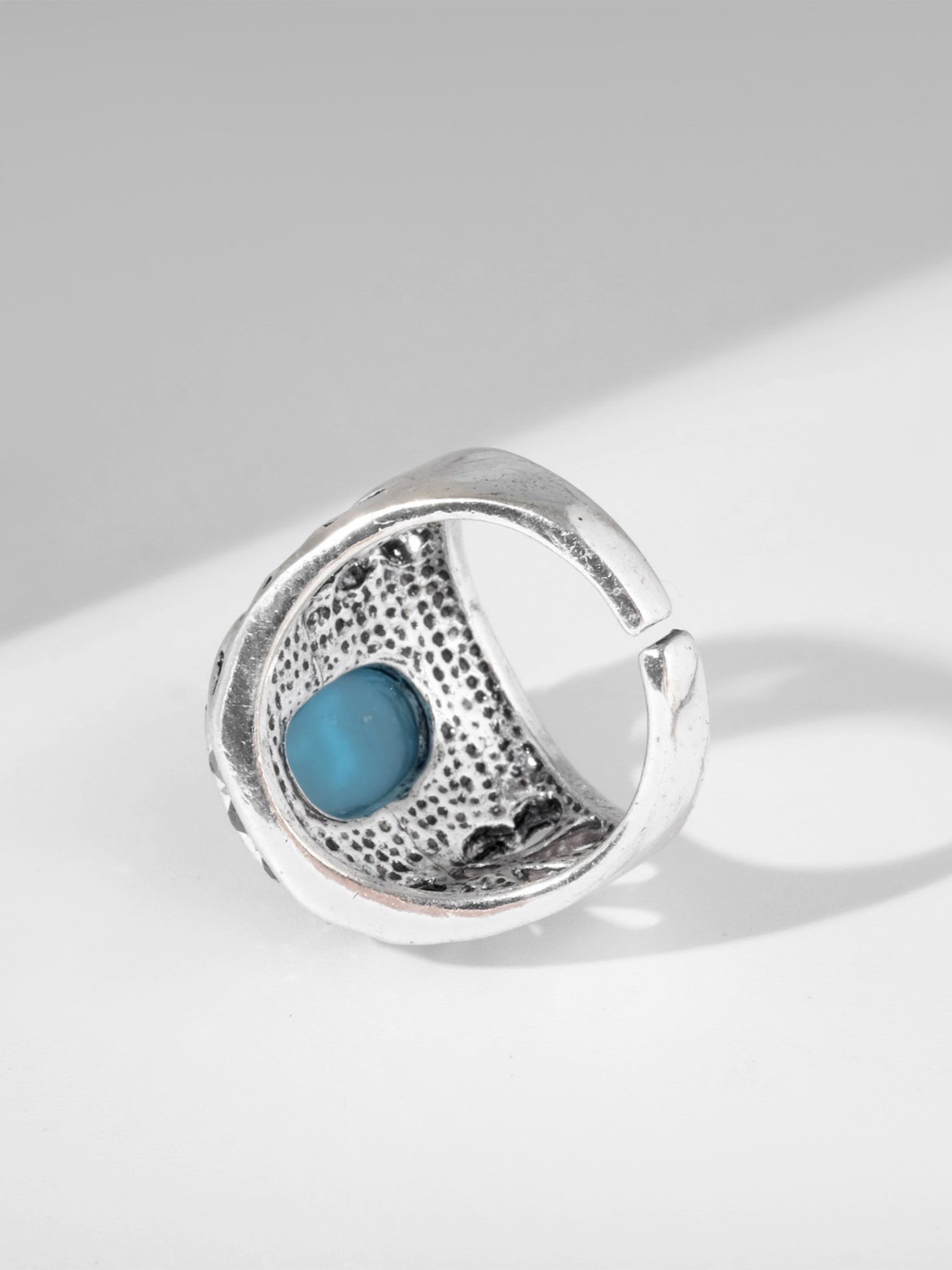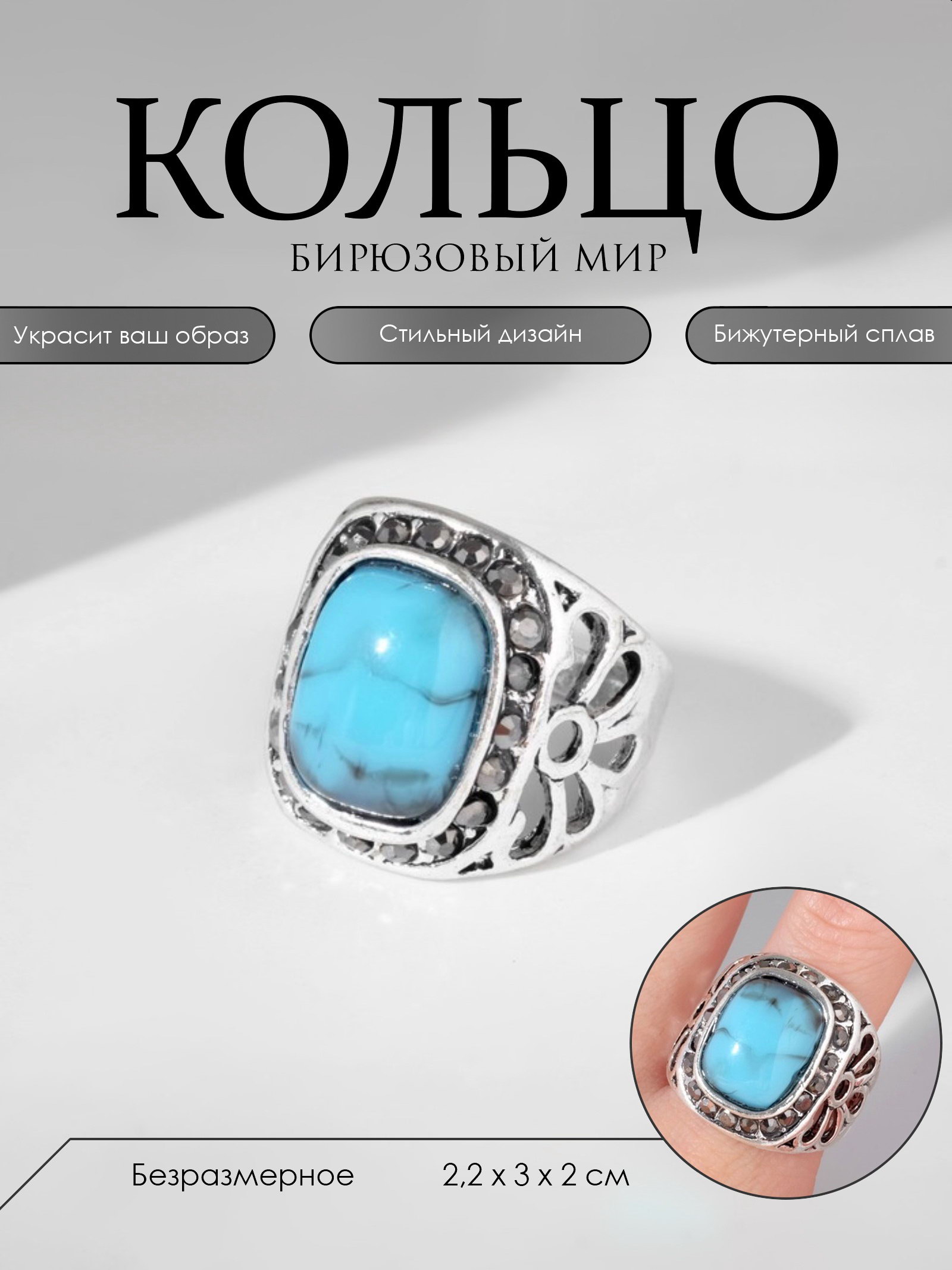 Кольцо с камнем "Бирюзовый мир", безразмерное, чёрно-голубое в чернёном серебре, 3x2.2x2 см., QF, Китай