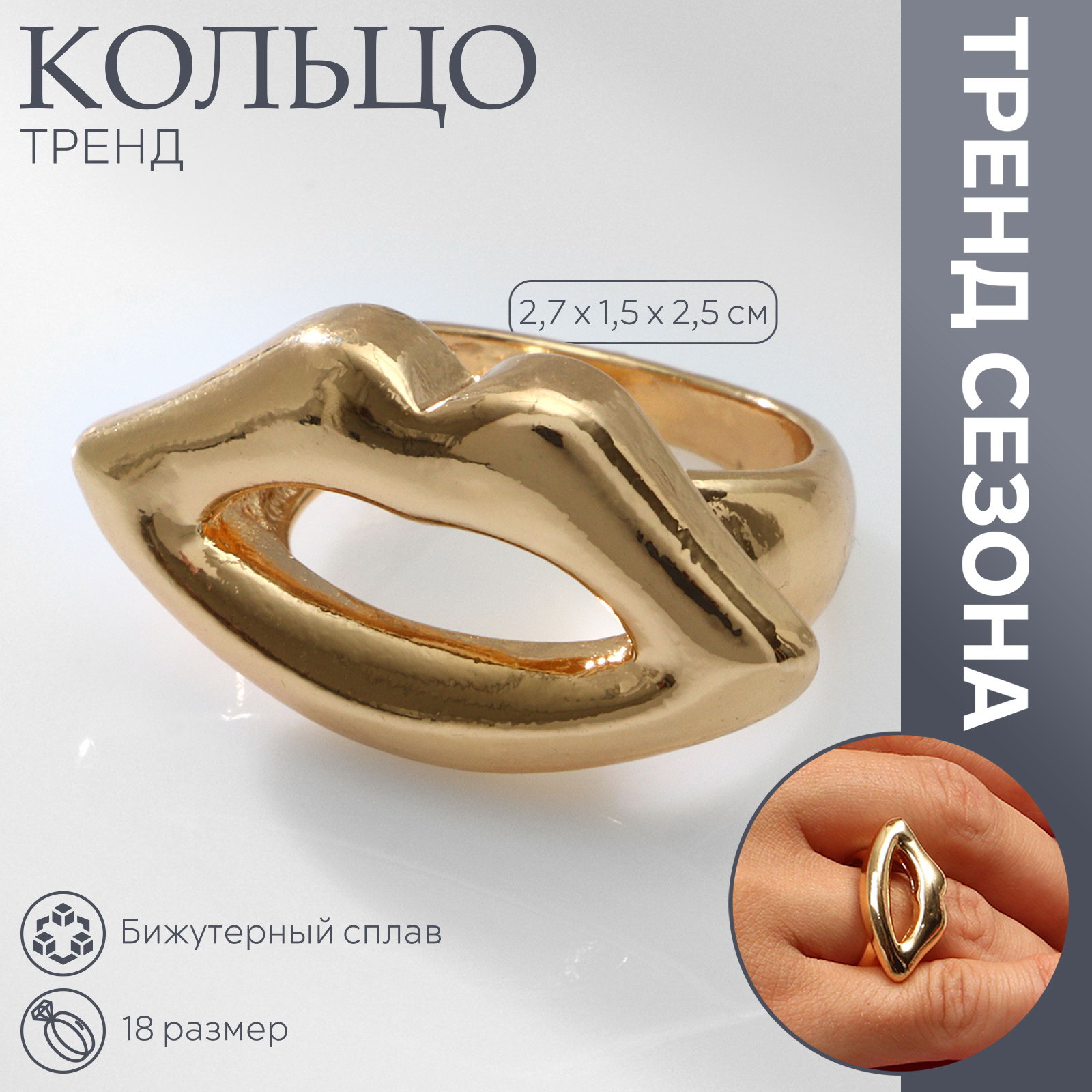 Кольцо металл "Тренд" губы, цвет золото, размер 18, 1.5x2.7x2.5 см., QF, Китай